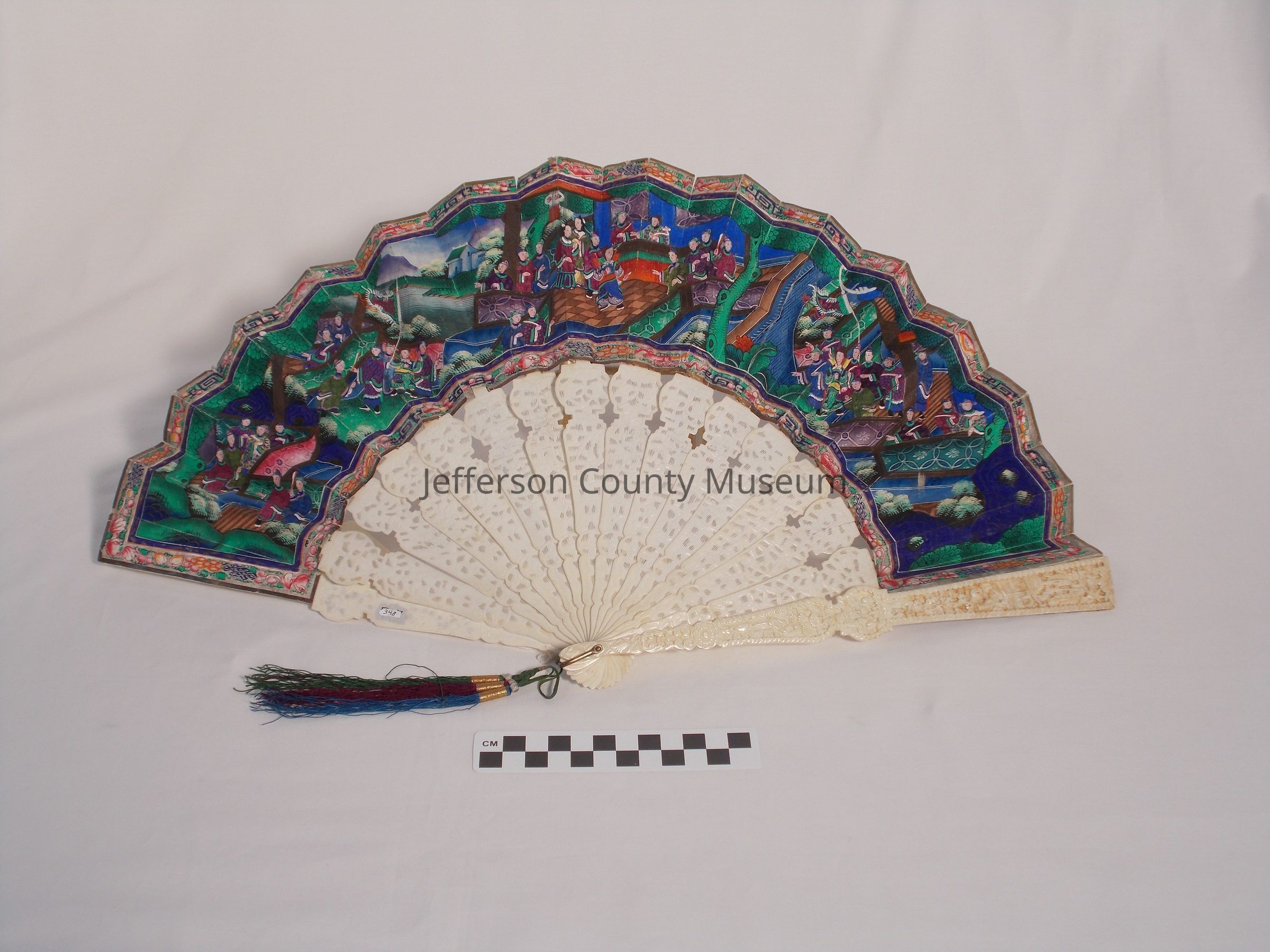 Paper leaf (double) painted in gouache, with applied ivory and silk. 16 ribs of pierced ivory. Guards of deeply carved ivory. Bright blue, green and pink scenes show an official and servants. Green, purple and blue tassel wrapped with gold thread hangs from handle. Made for export 1850-1900. Sometimes called Mandarin Fan.Acquisition