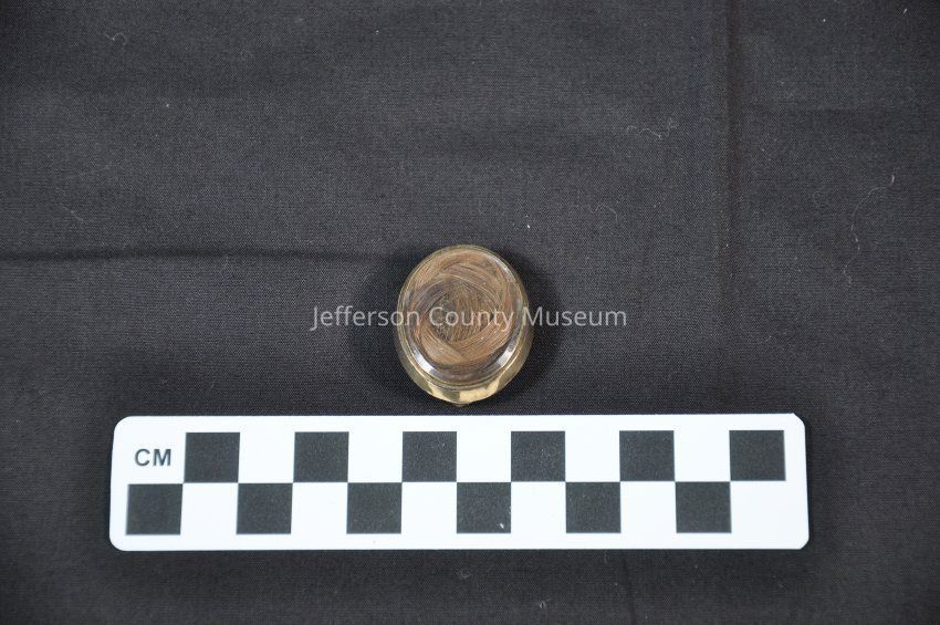Oval mourning brooch inscribed on back in script "Mary E. D. Waugh". Coiled hair covered with glass. Gold back.Acquisition