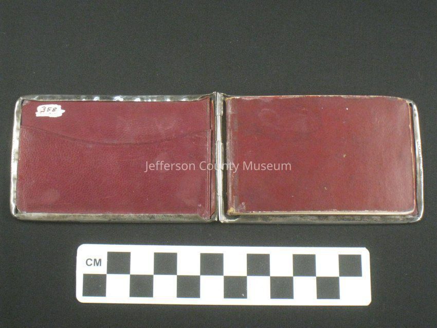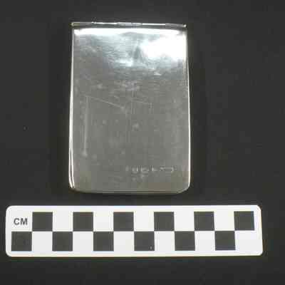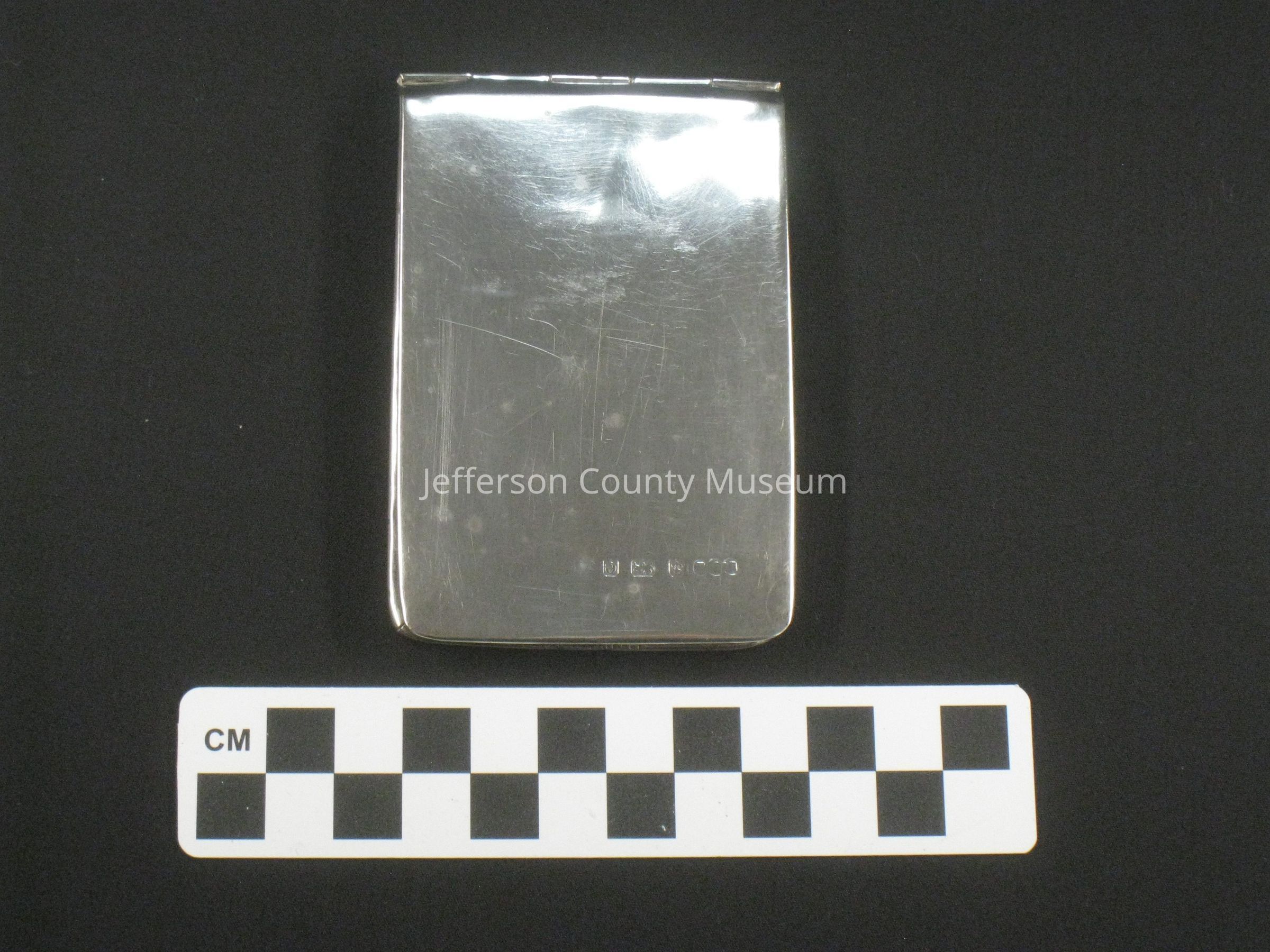 Hinged silver note pad. Inside is a paper pad and leather pockets for cards. Makers marks on front and back are an anchor, lion and an "e". Stamped on inside edge is "ELKINGTON & CO. LT"Acquisition