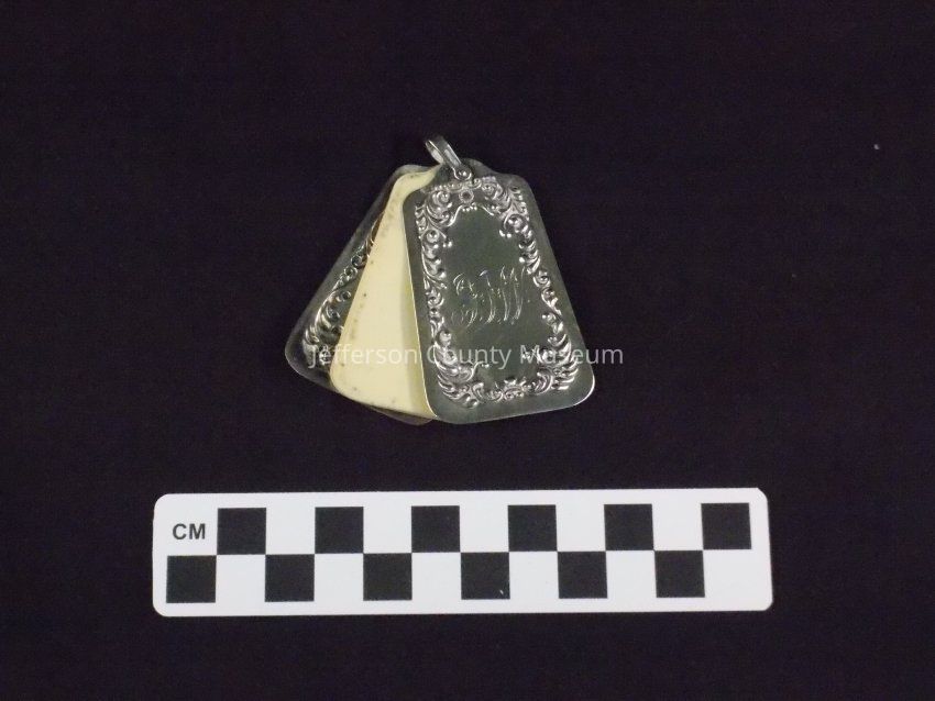 Sterling silver memo pad to be worn as a necklace. Shape is nearly pyramidal with a flat top. Silver sheaths cover 7 sheets of off-white, possibly celluloid sheets on which notes could be written. Loop for chain. Initials of front possibly "FTW" or "JTW". "STERLING" on chain loop.Acquisition
