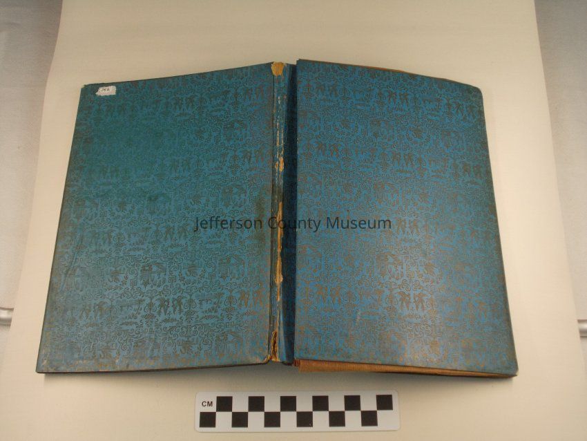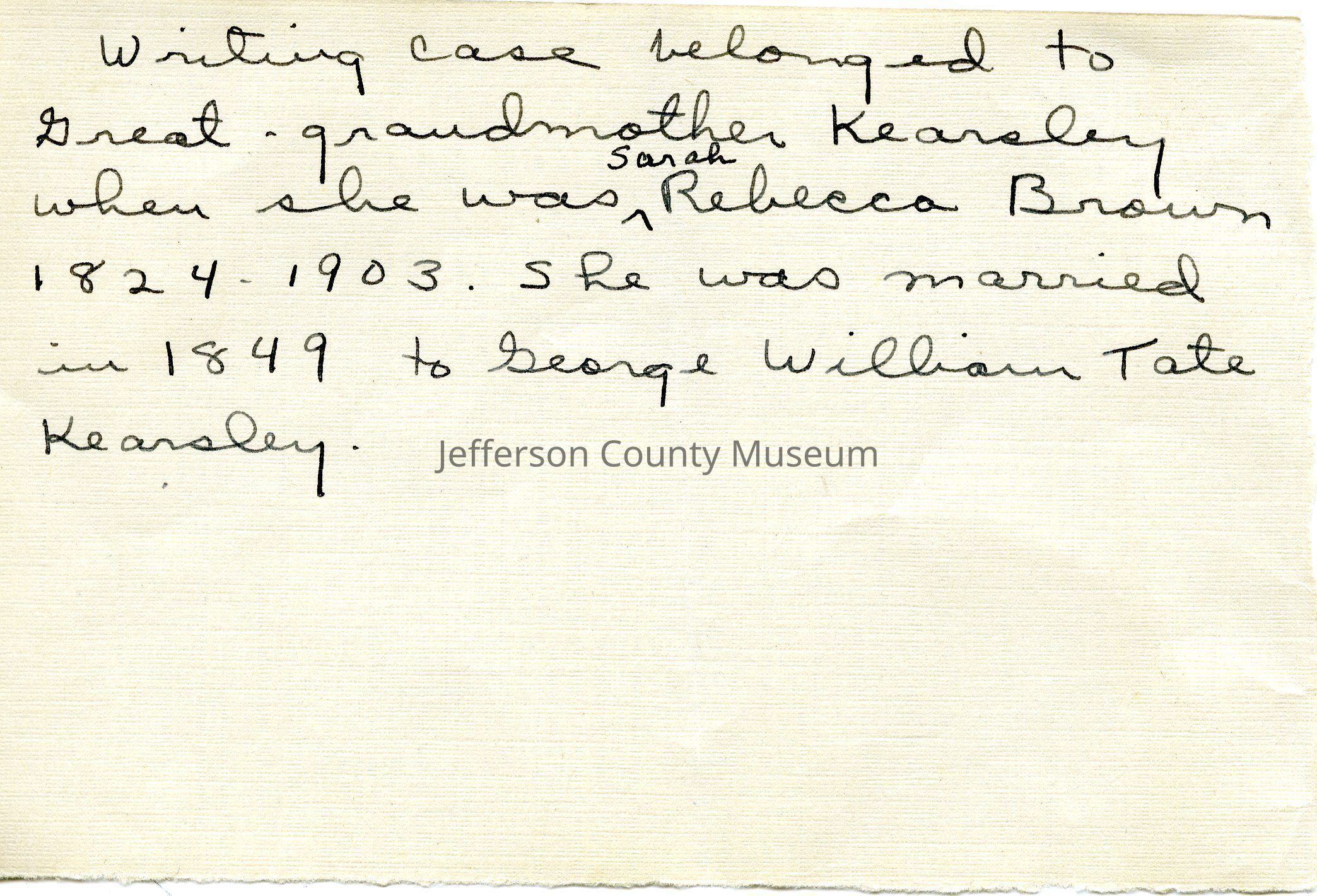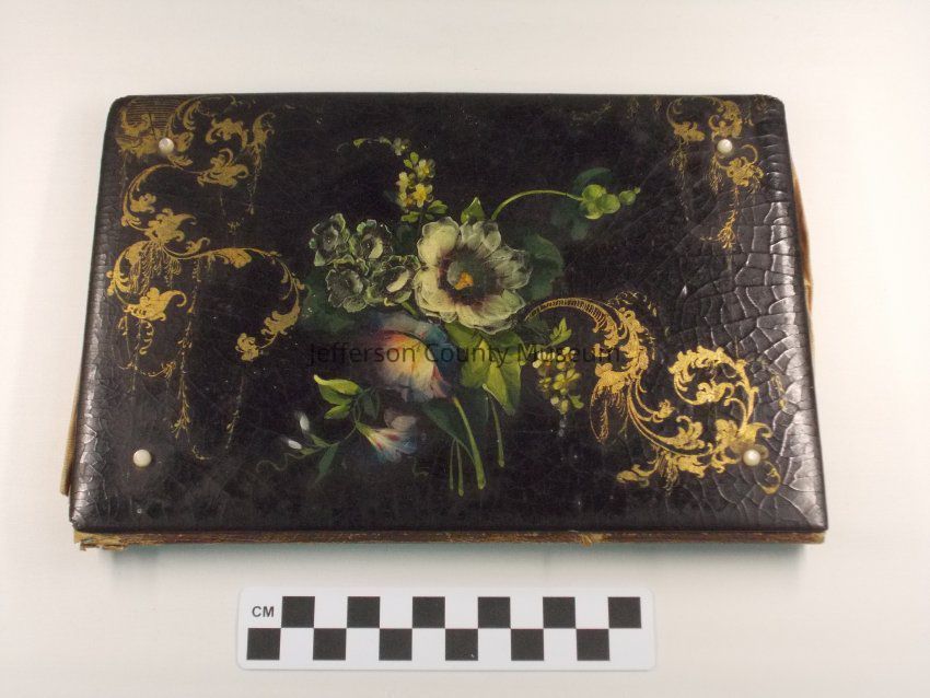 Portable papier mache writing case, circa 1850. Black with flower design of cover. Four mother-of-pearl studs, one at each corner.Acquisition