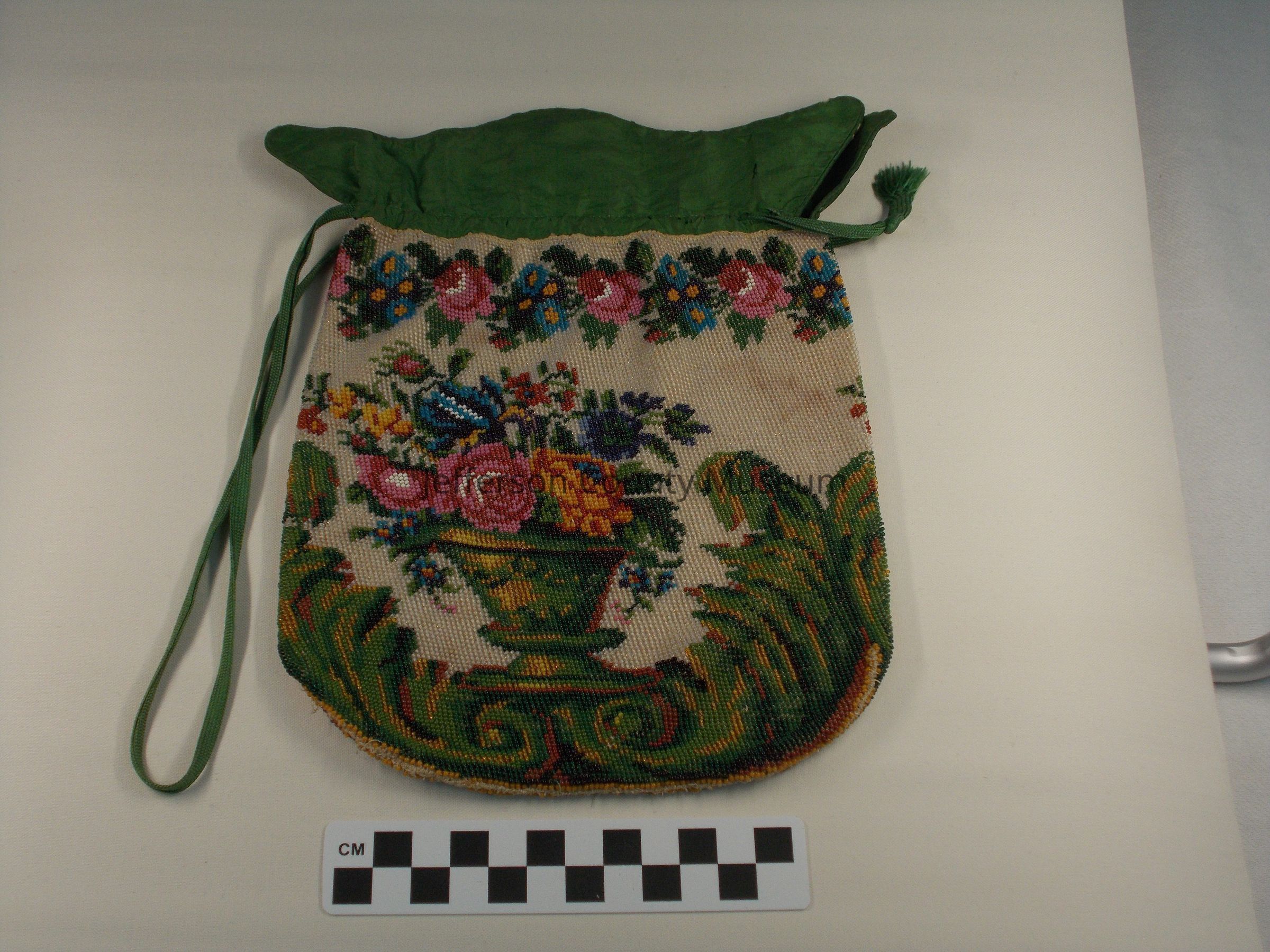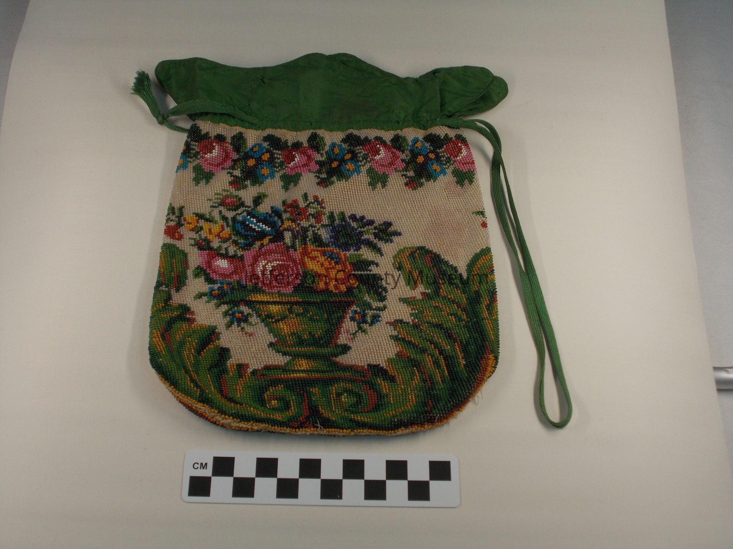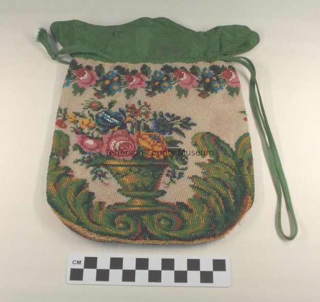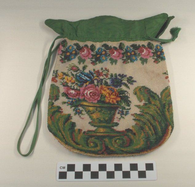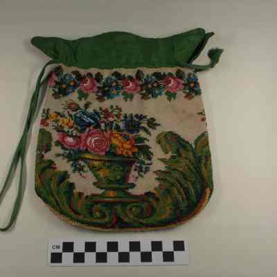 Ladies draw-string handbag. Floral design, multicolor beads, green silk top. Circa 1830sAcquisition