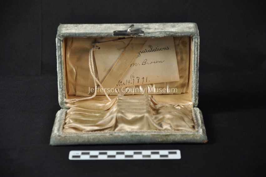 Green presentation box lined with off-white silk holding spoons catalog #364a. Card in box says "Congratulations W. M. Brown October 14, 1891"Acquisition