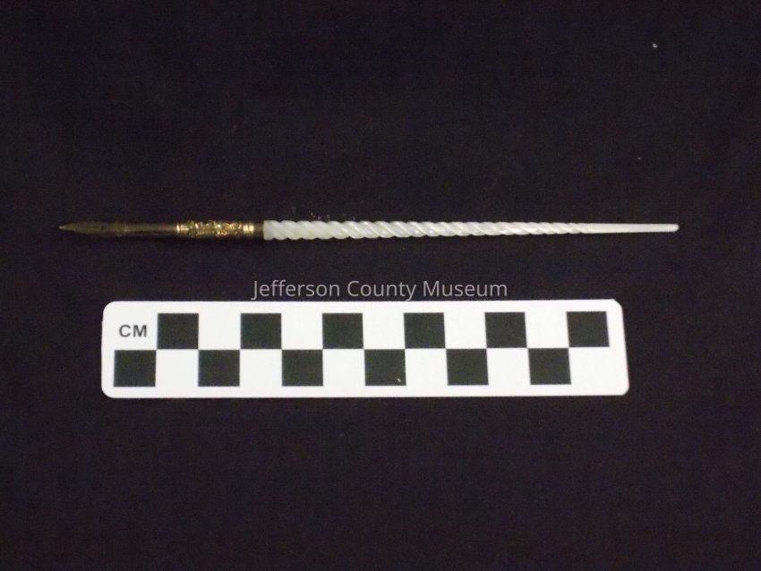 Very thin mother of pearl pen with gold nib, circa 1906. Number "2" stamped in nib where it attaches to mother of pearl.Acquisition