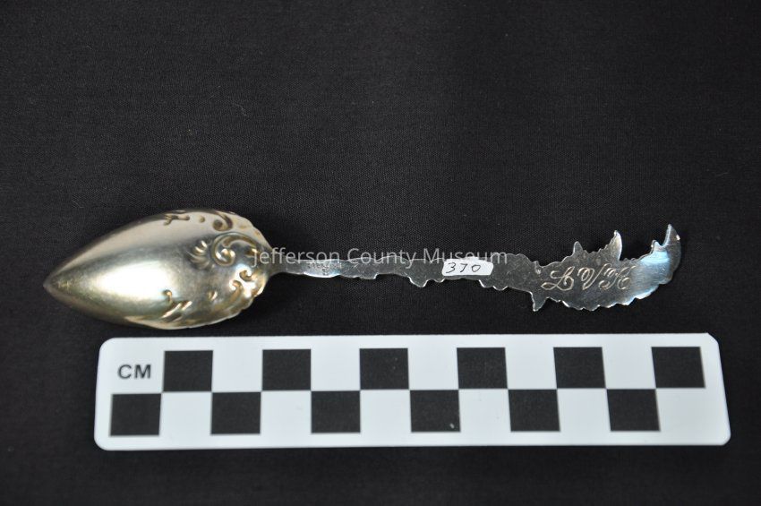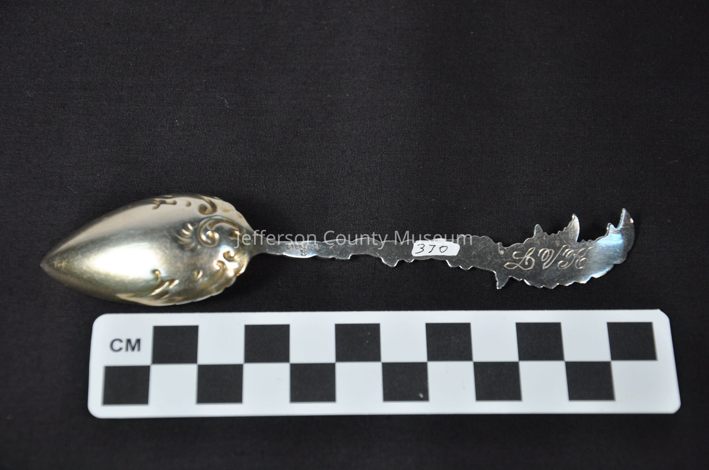 Silver gilt teaspoon with wheat or herb design at end of handle. Flowers entwine handle. Fancy design in bowl. Engraved "LVK" on back of handle. Stamped "STERLING S" on back.