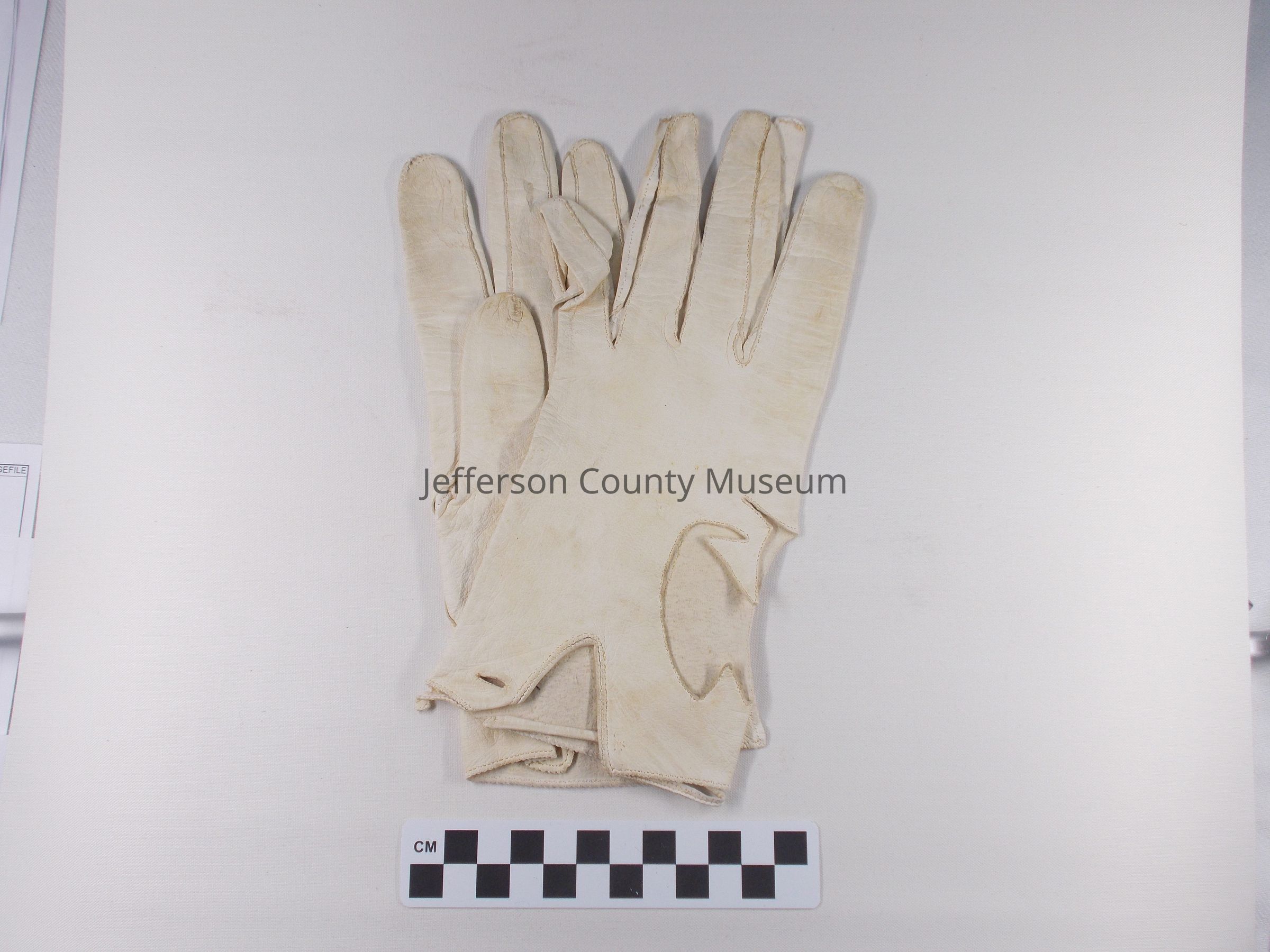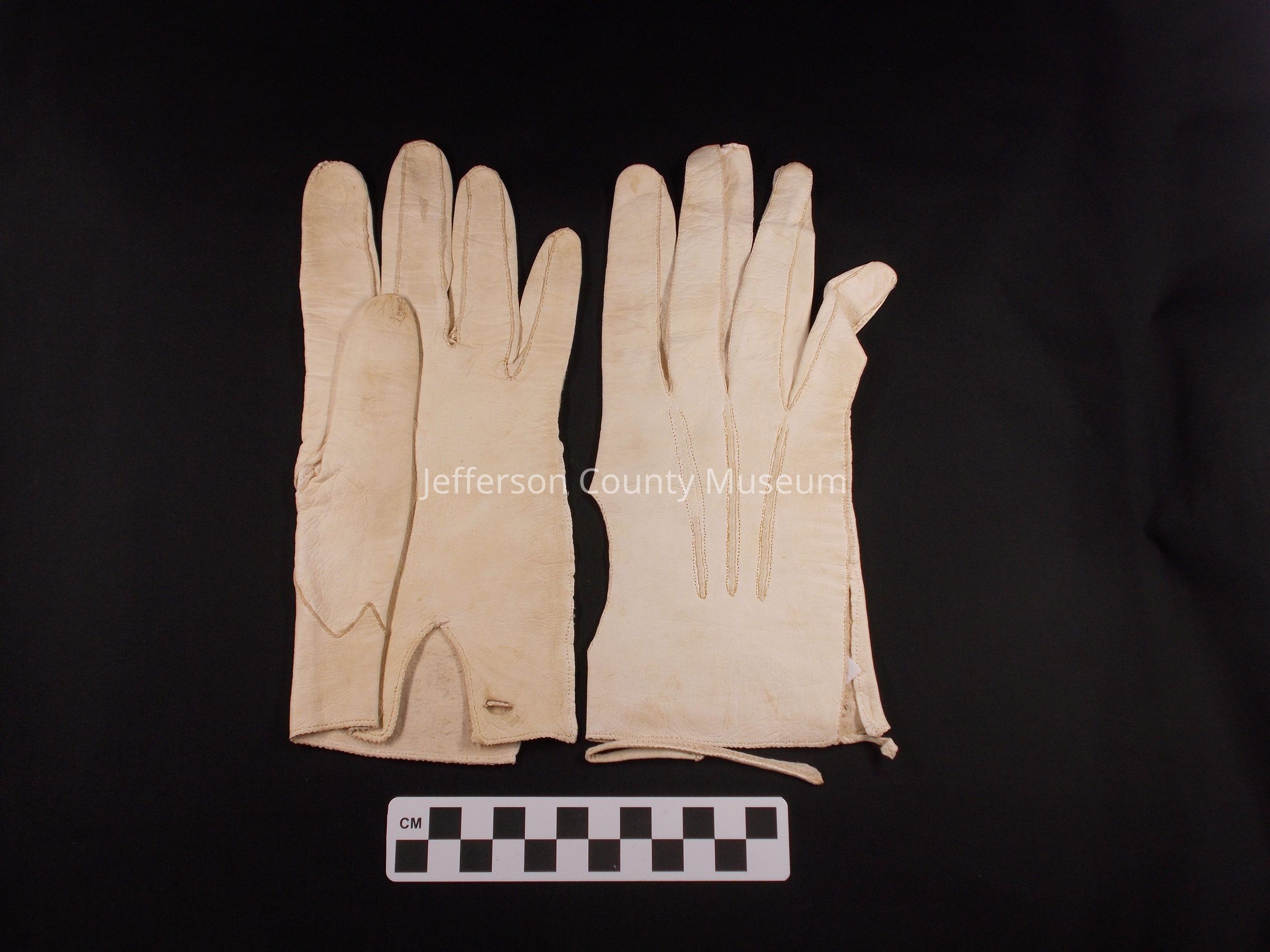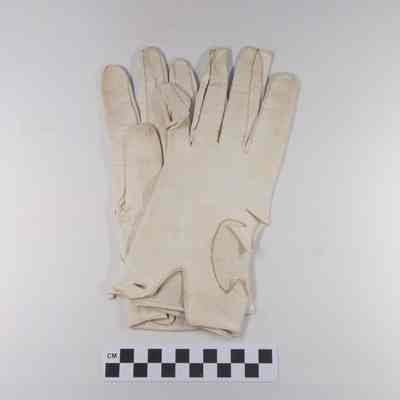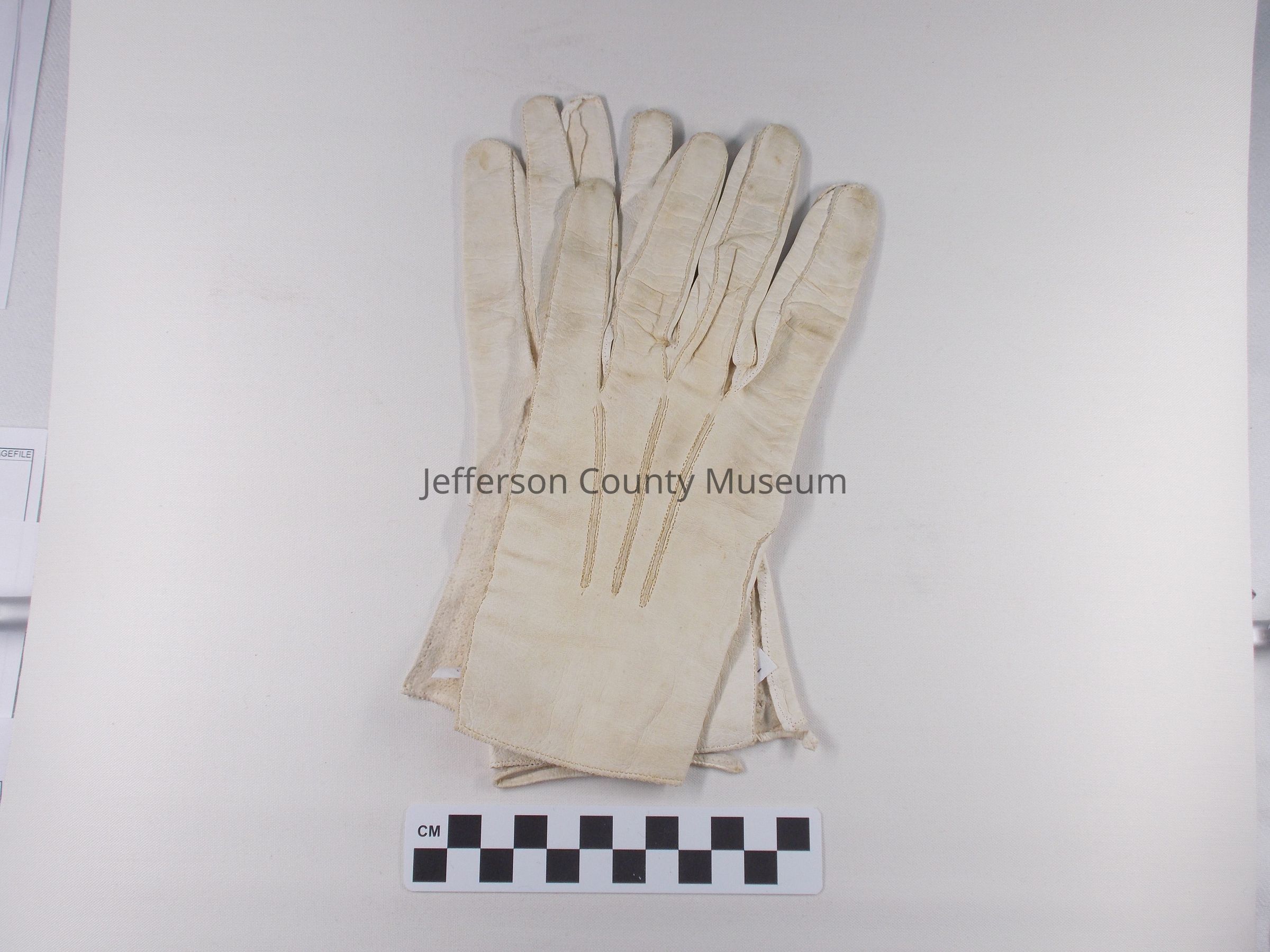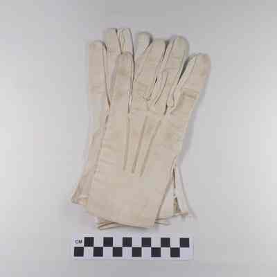 Off-white man's kid gloves. Stitching on both is split from little finger to bottom. Right one is missing thumb. Button holes but no buttons.