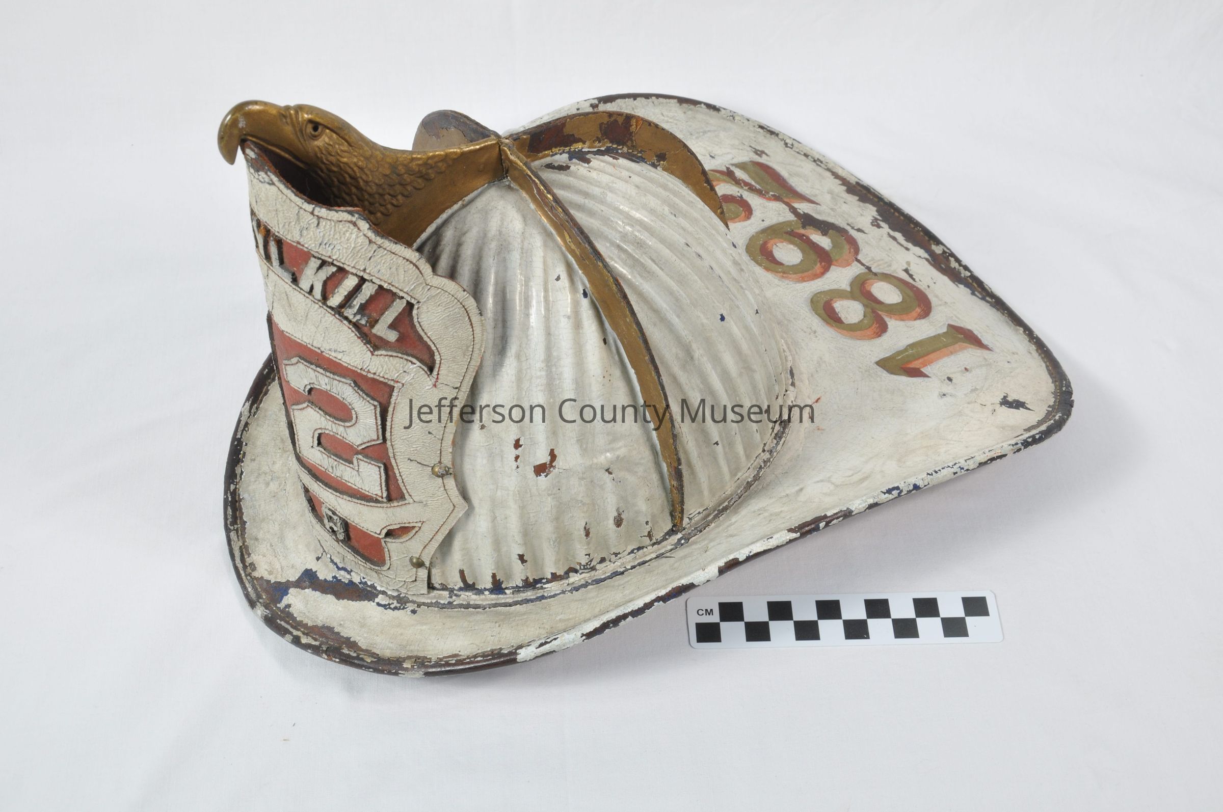 Leather helmet with large leather shield on front marked "SCHUYLKILL 12 CA". Date painted on back of helmet in gold, red and pink paint "1892". Gold eagle head supports shield. Helmet is painted white on top and heavily flaking red paint on under side. Two black stamps "E.B. HEAMS" or "E.B. REAMS" on sweat band.Acquisition