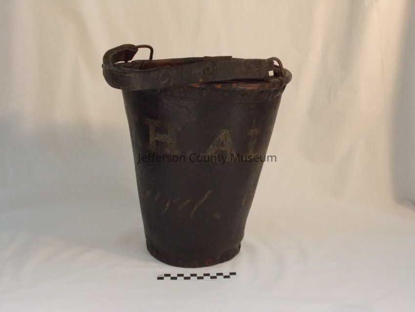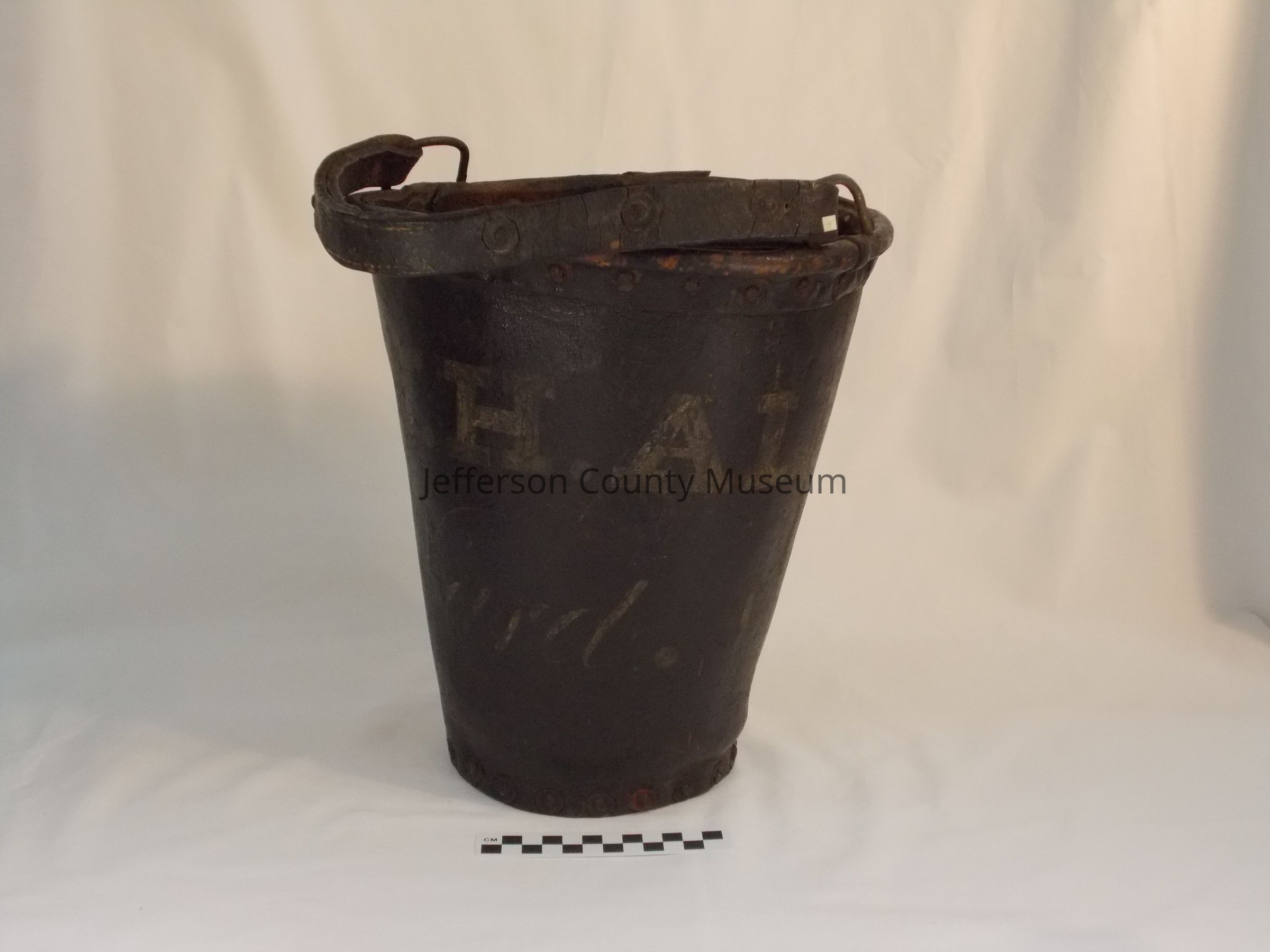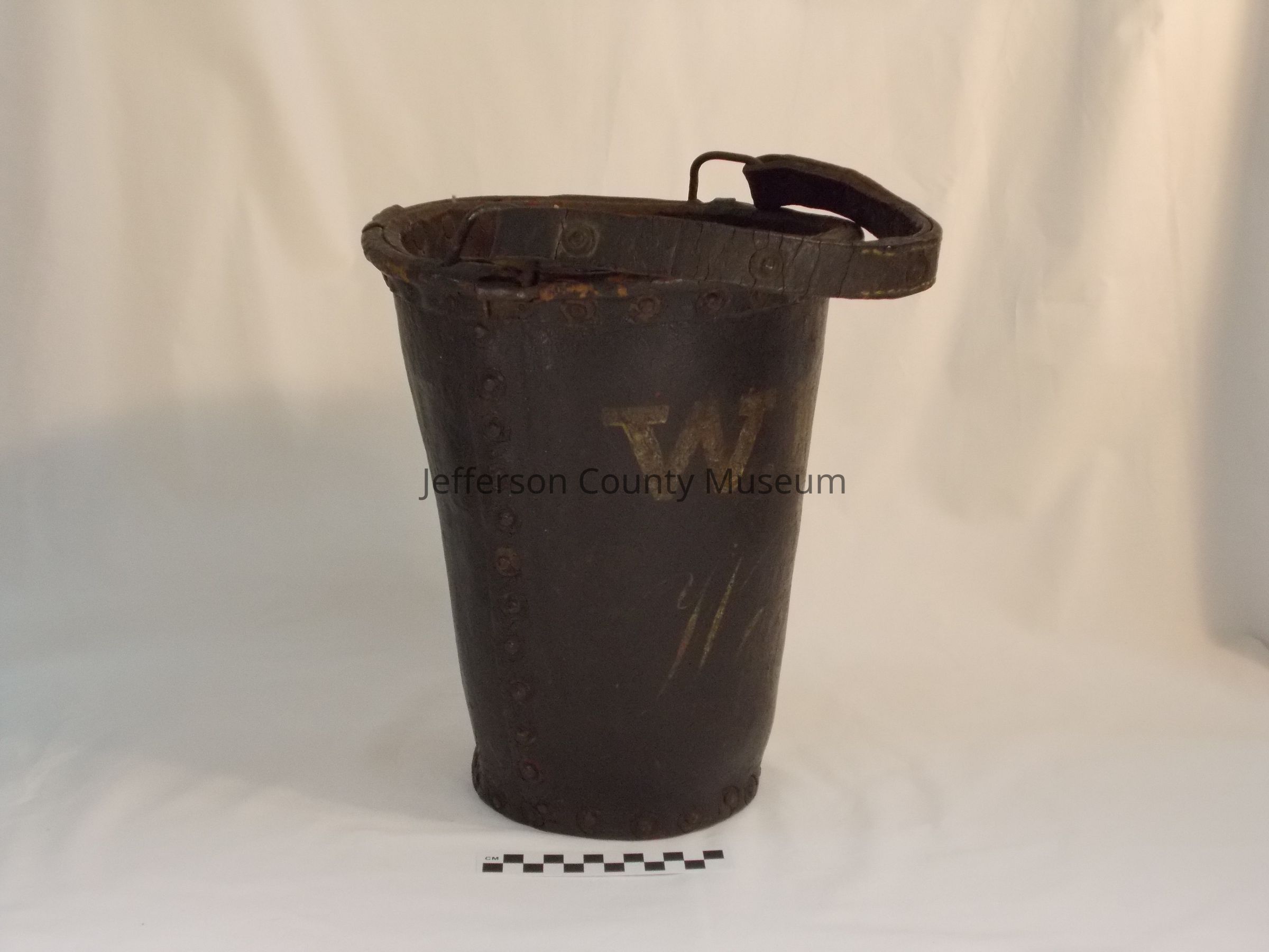 Leather fire bucket marked "W. H. ALBAUGH WARD NO. 4". Circa 1820-1840. Appears to have black paint all over, flaking off in places. Cone shaped. Leather handle with rivets. Heavy rivets hold bucket together.Acquisition