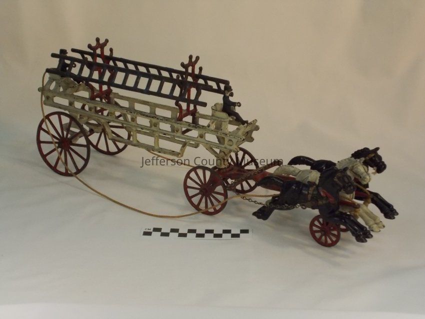 Red, white and blue cast iron fire wagon, pulled by three horses, two black and one white. There are two men on wagon, one on front and one on back. Ladders and men are removable. Two large wheels on back and two small wheels on front. Also two smaller wheels under horses.Acquisition