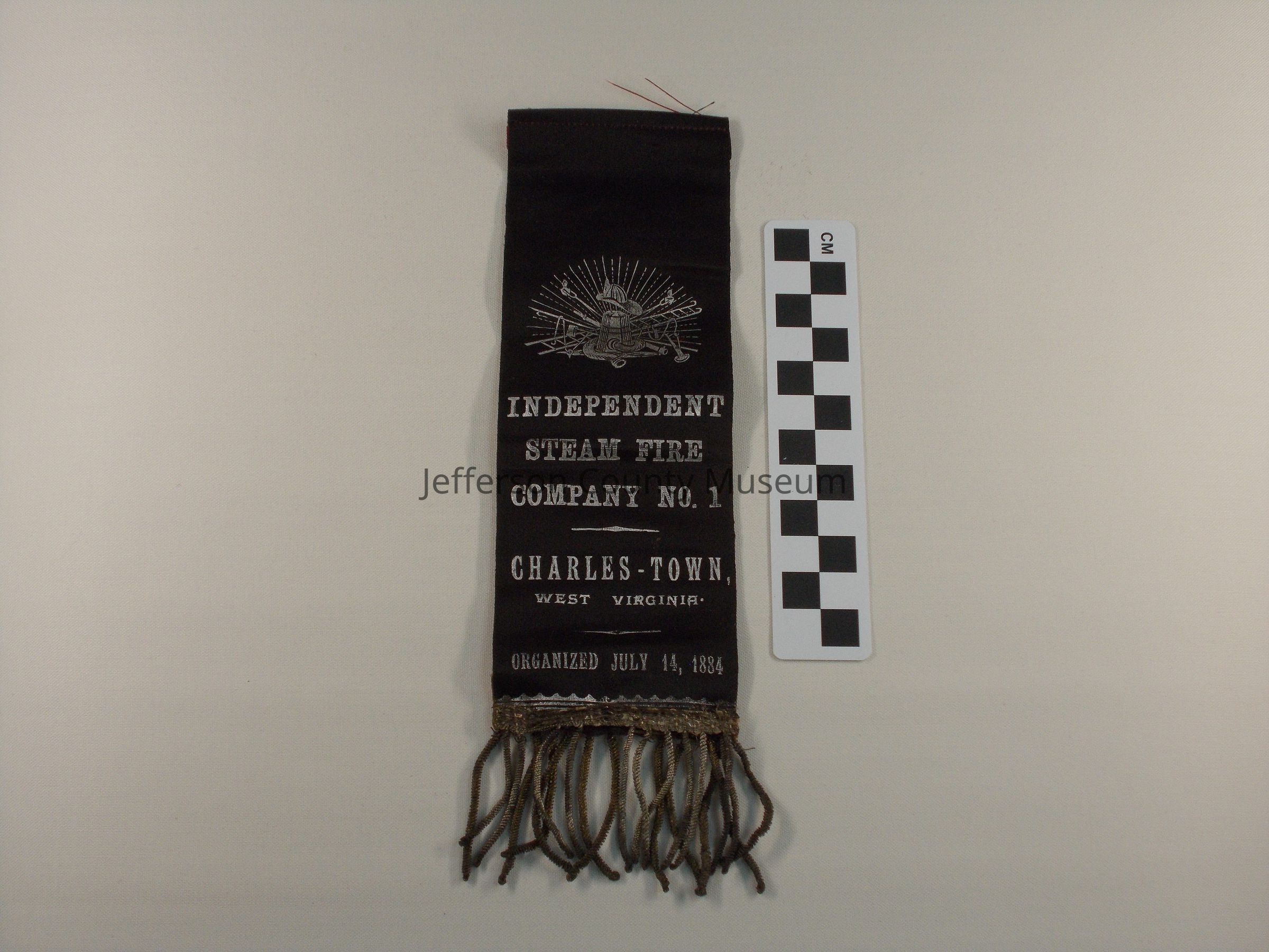 Black cloth ribbon with gold colored wire fringe at bottom. Fire insignia with helmet, pump, hose, ladder, horn and torches near top. Marked "INDEPENDENT STEAM FIRE COMPANY NO. 1 CHARLES-TOWN, WEST VIRGINIA ORGANIZED JULY 14, 1884". Appears to have been a 2 sided ribbon as catalog #391 but red part has been cut off. Paper label on back says "S. N. MEYER, MANUFACTURER. 1411 PA. AVE. N.W. WASHINGTON, D.C."Acquisition
