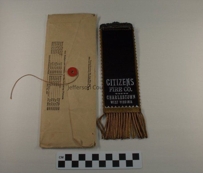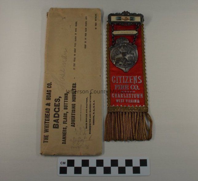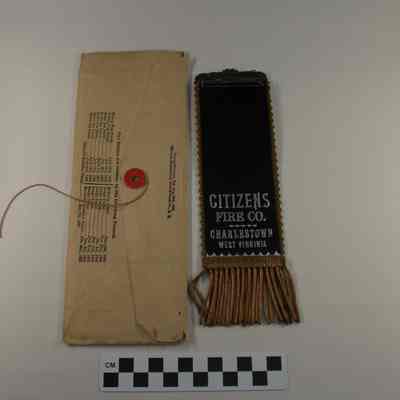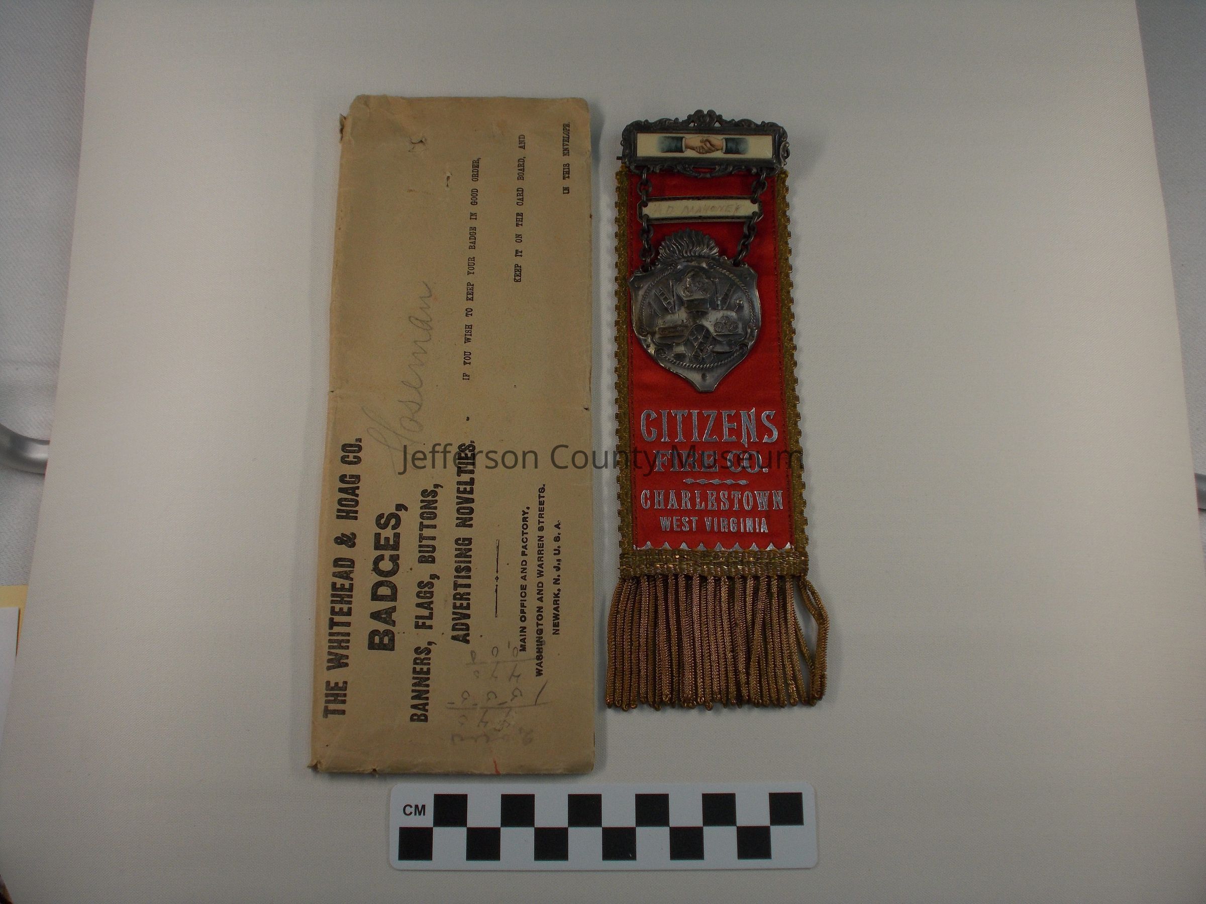 Tan colored envelope. Handwritten in pencil "Hoseman". Printed on left side "THE WHITEHEAD & HOAG CO. BADGES, BANNERS, FLAGS, BUTTONS, ADVERTISING NOVELTIES". String attached to back for closing.