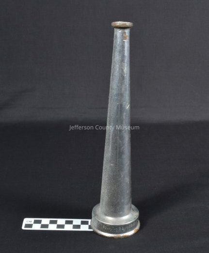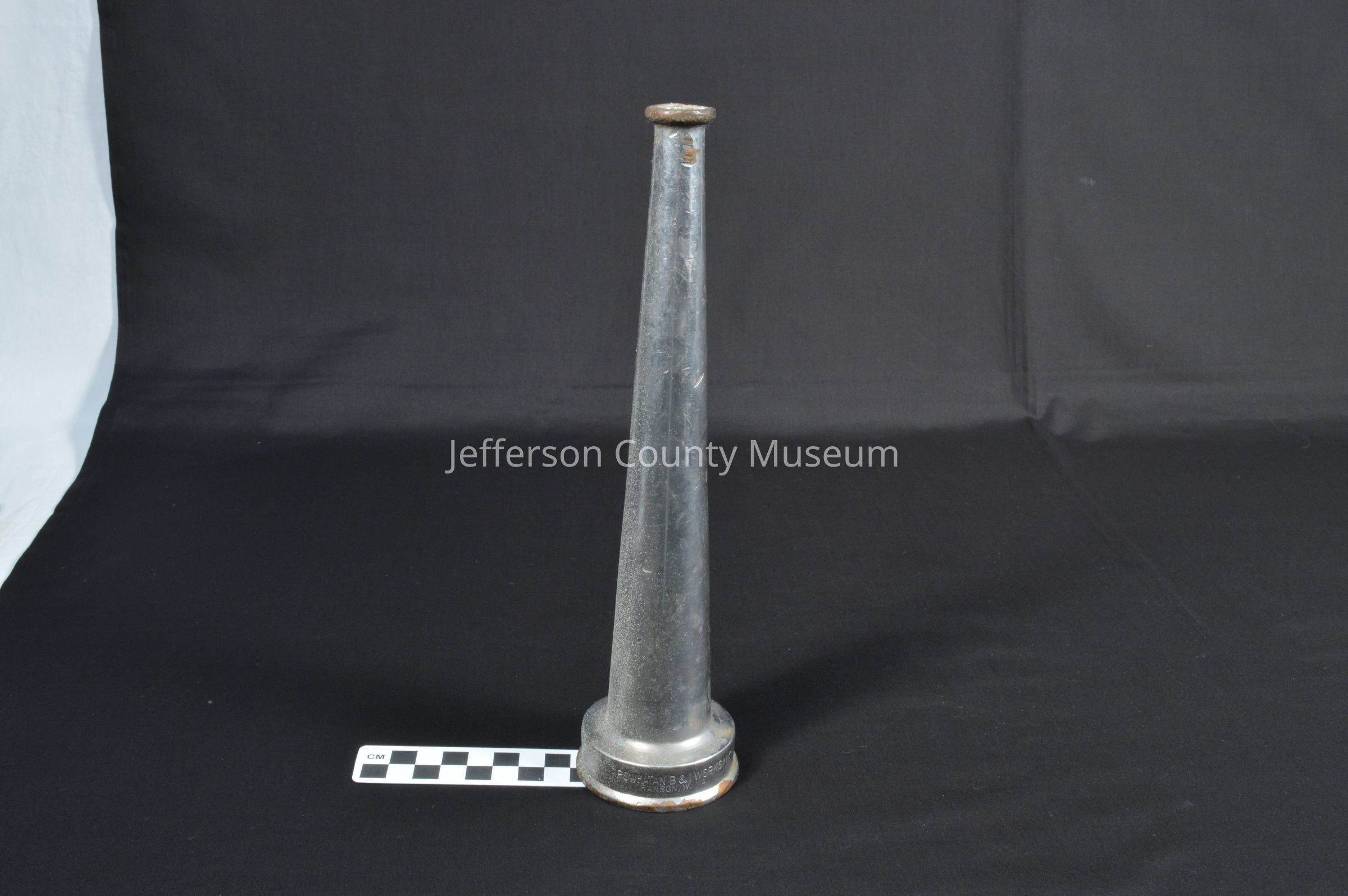 Nickel-plated brass nozzle. Stamped around bottom of nozzle where it attaches to hose "POWHATAN B&I WORKS RANSON, W.VA. NS".Acquisition