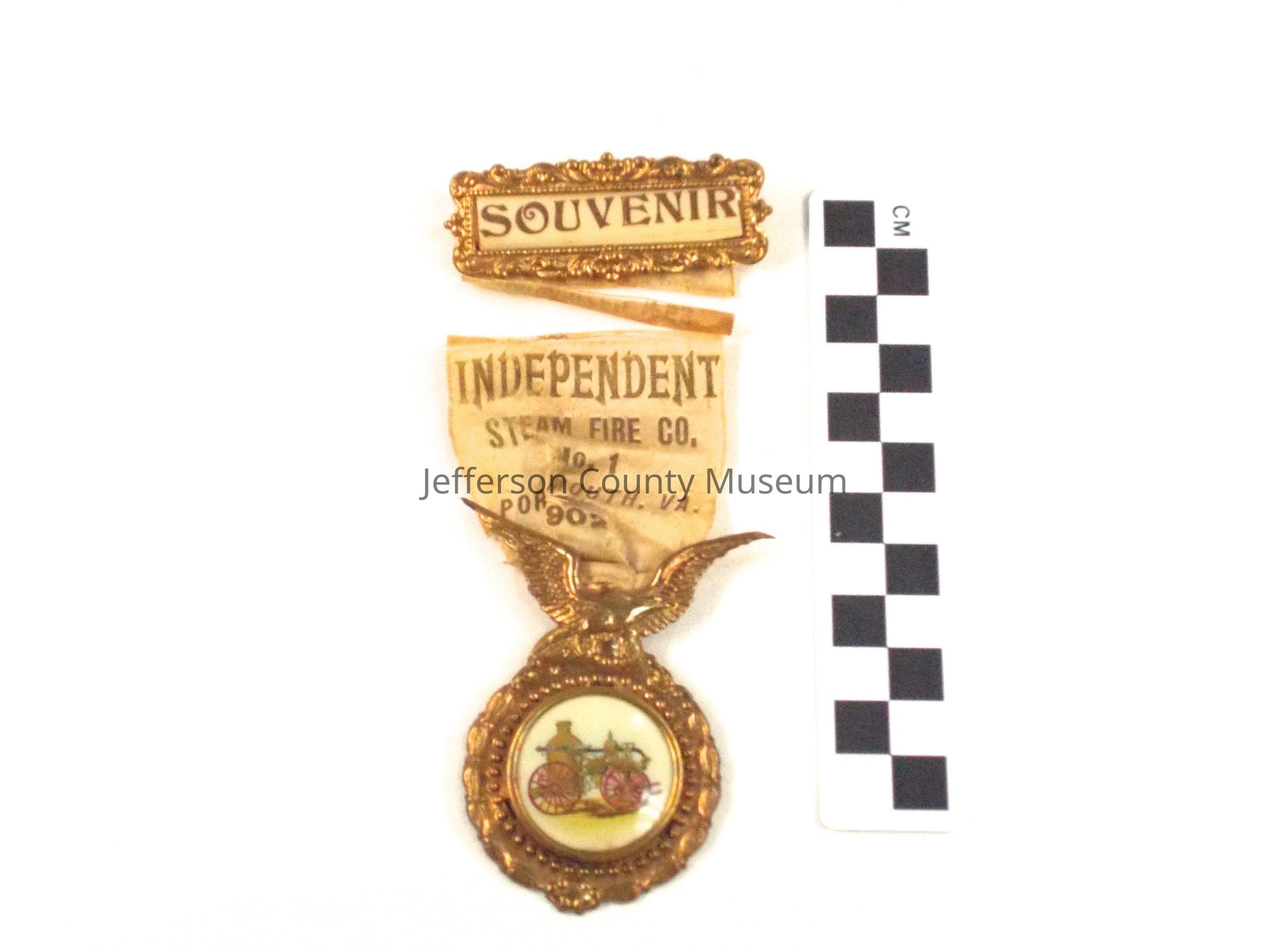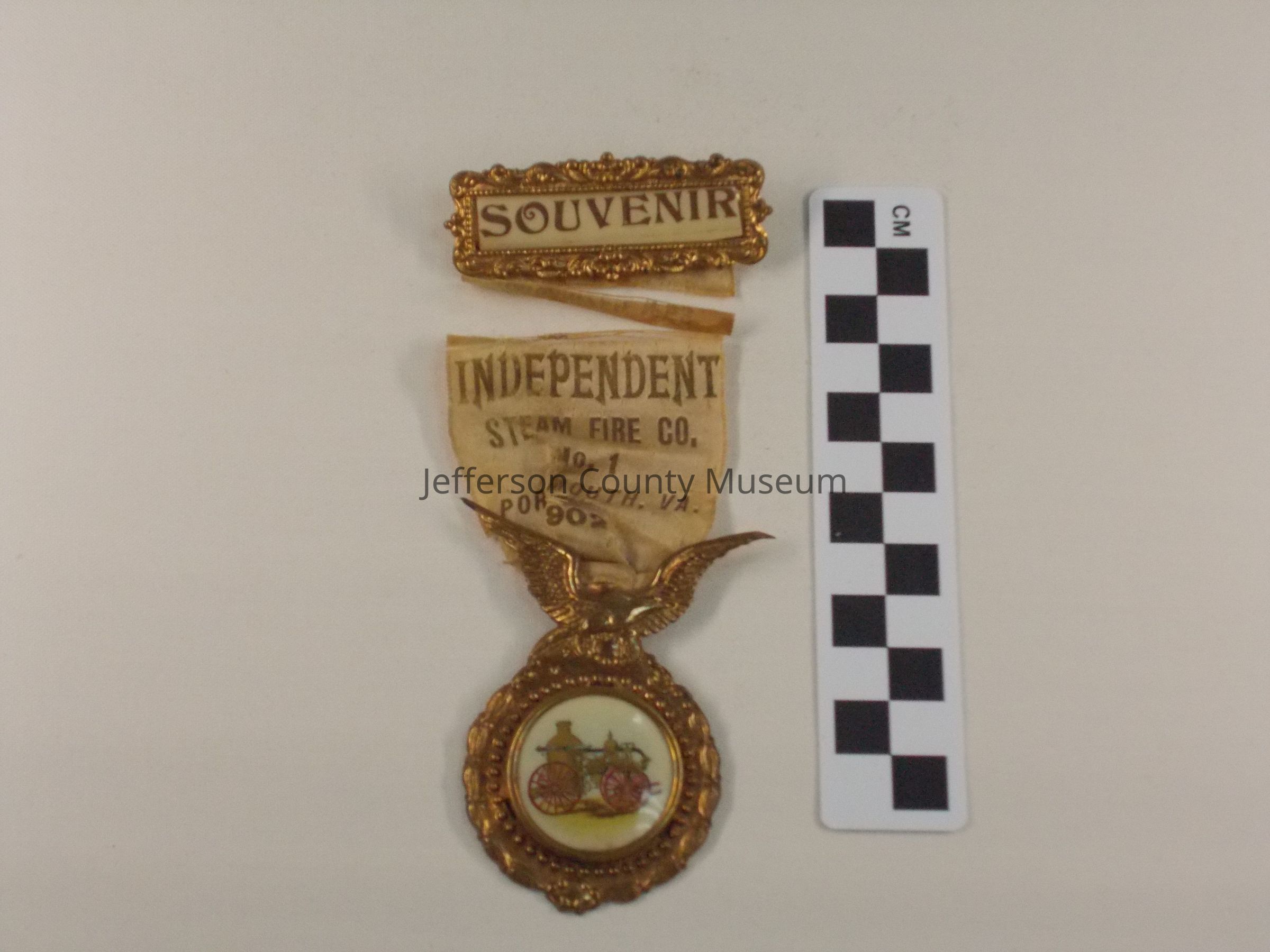 Off white ribbon with gold border around. "SOUVENIR" at top. Below that is "ORGANIZED 1853". Separated from rest of ribbon is "INDEPENDENT STEAM FIRE CO. No. 1 PORTSMOUTH, VA. 1902". At bottom is gold colored and enameled button showing steam wagon. Above wagon is spread winged eagle.Acquisition