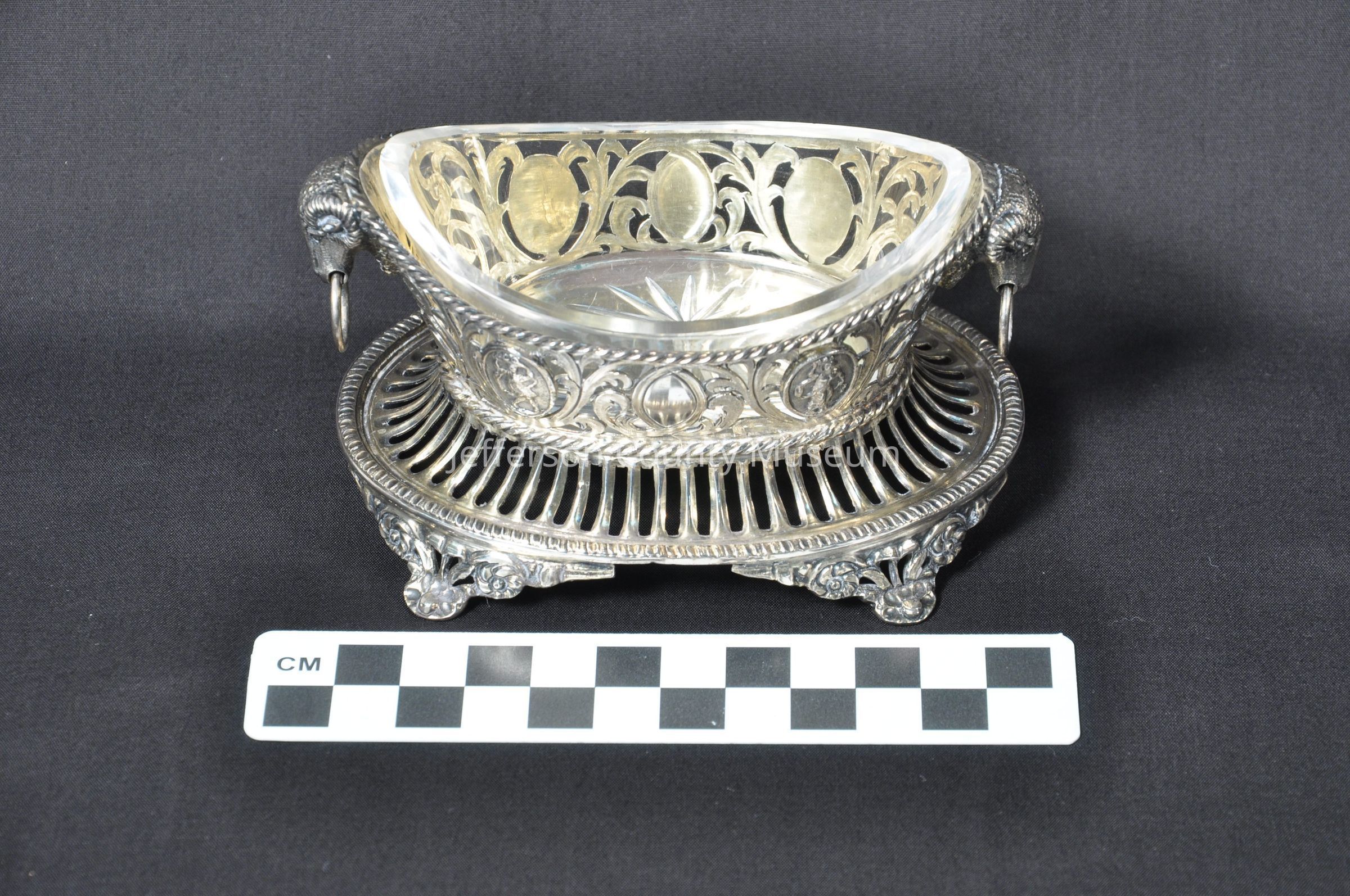 Silver salt dish (a) with glass liner (b), circa 1832. Ram's heads holding rings on each side. Maker's marks on bottom include lion, face with crown, backward P and "AF over SG".Acquisition