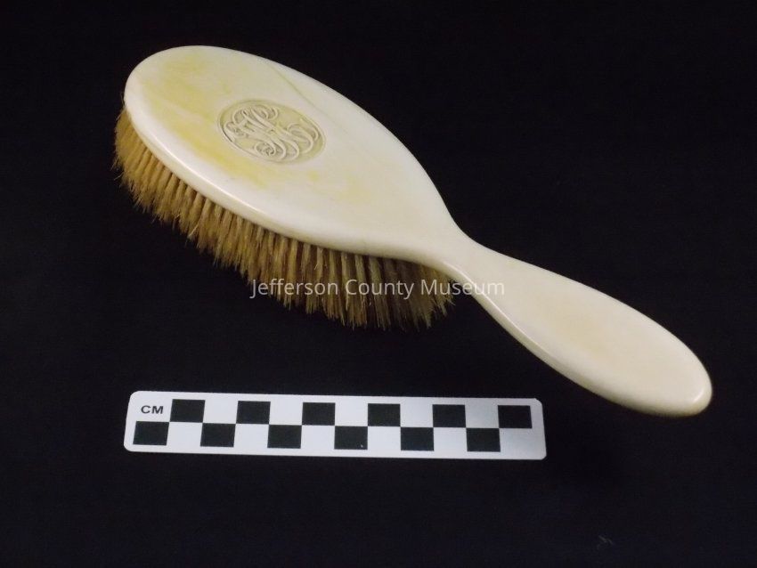 Ivory hairbrush monogrammed in fancy script inside oval "HLJ". Off white bristles. "HLJ" refers to Harriet Lane Johnston.