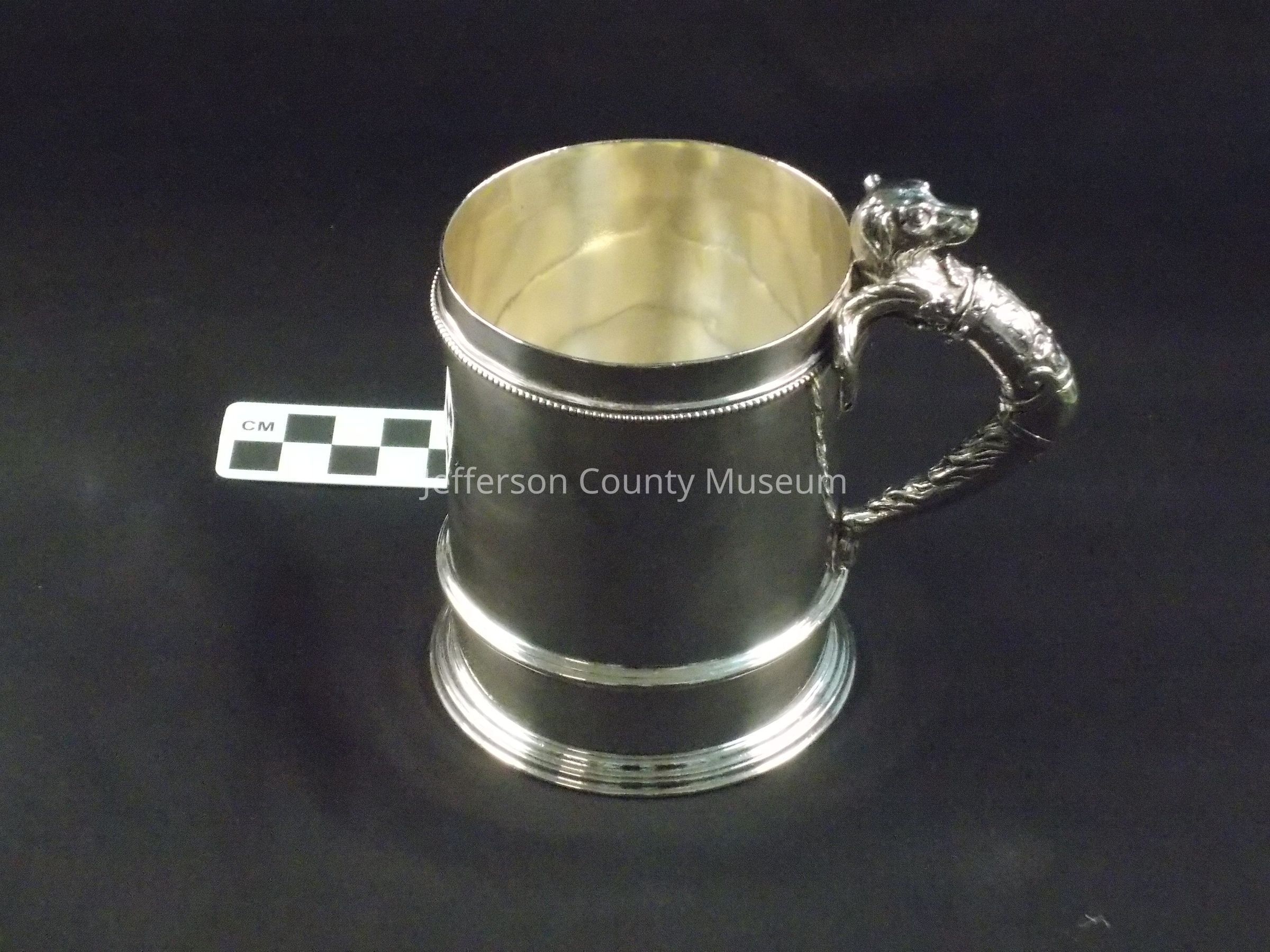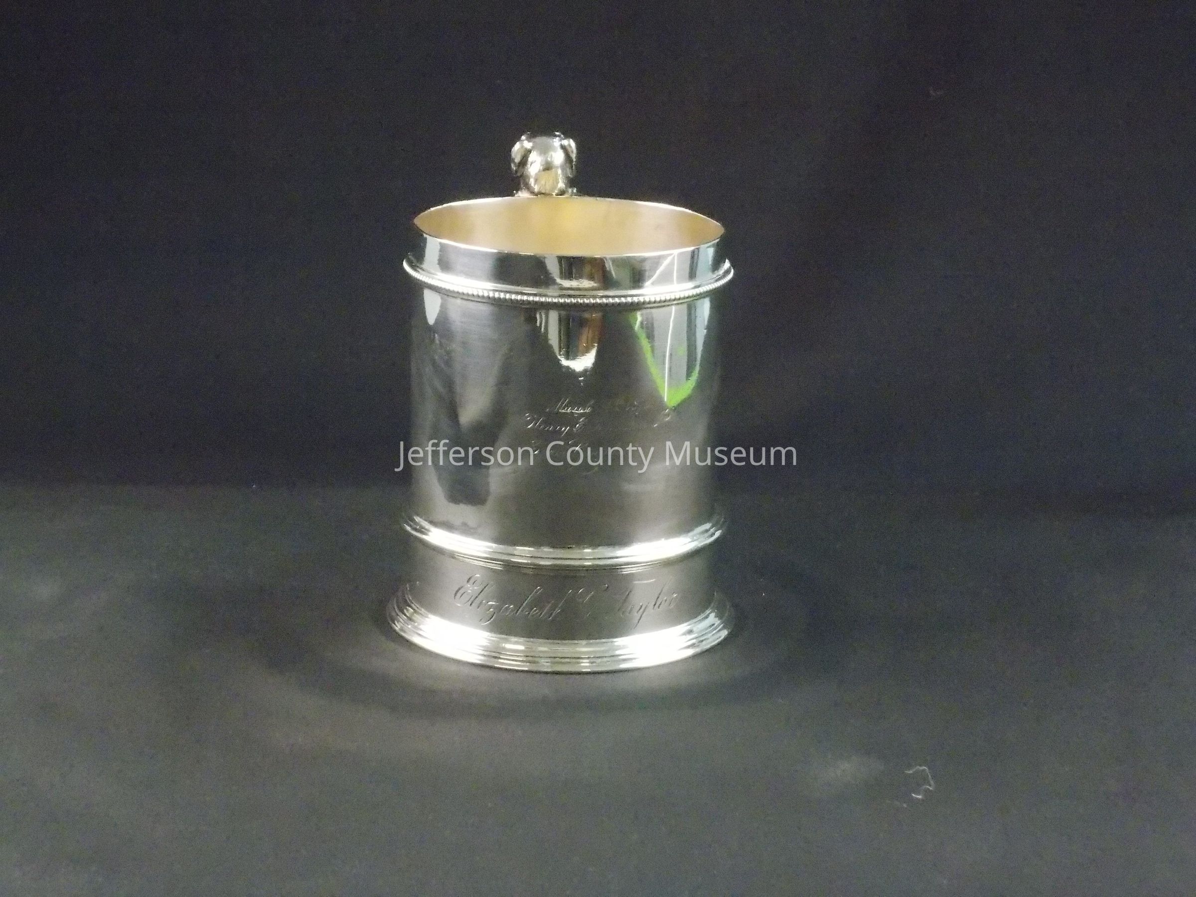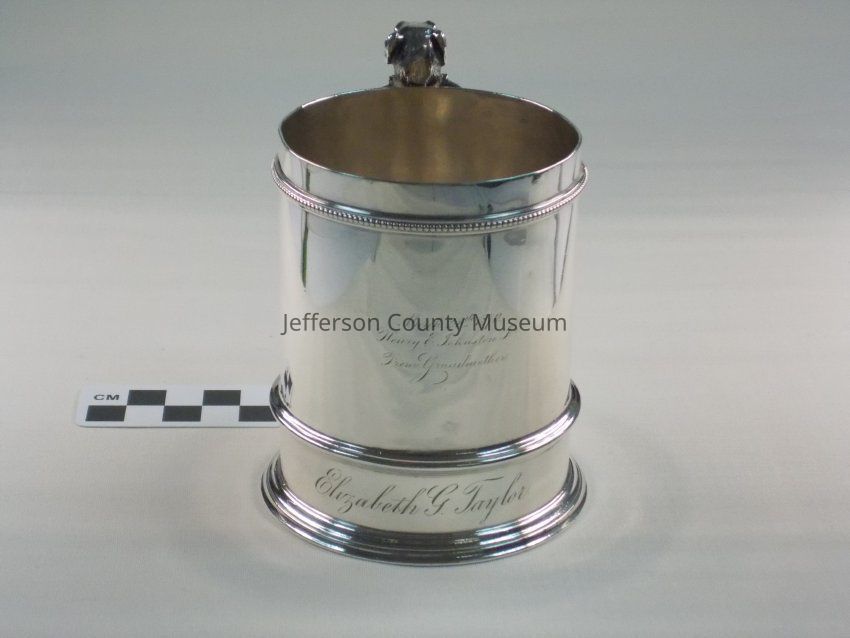 Child's sterling silver cup. Dog head on handle. Monogrammed in script "March 24th, 1870 Henry E. Johnston, Jr. From Grandmother. Below that "Elizabeth G. Taylor". On bottom of cup ""From her Godmother Harriet Lane Johnston. June 10. 1895." Stamped "STERLING B" Maker's marks include lion, anchor and "G", also "770. Henry E. Johnston, Jr., was the younger son of Harriet Lane Johnston and Henry Elliott Johnston.Acquisition