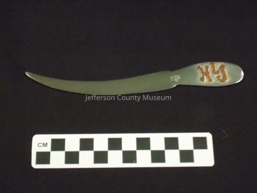 Sterling silver letter opener with curved blade in shape of dagger. Monogrammed "HLJ" applied in copper on handle. Marked "STERLING" and geometric maker's mark with "60" below. "HLJ" refers to Harriet Lane Johnston.