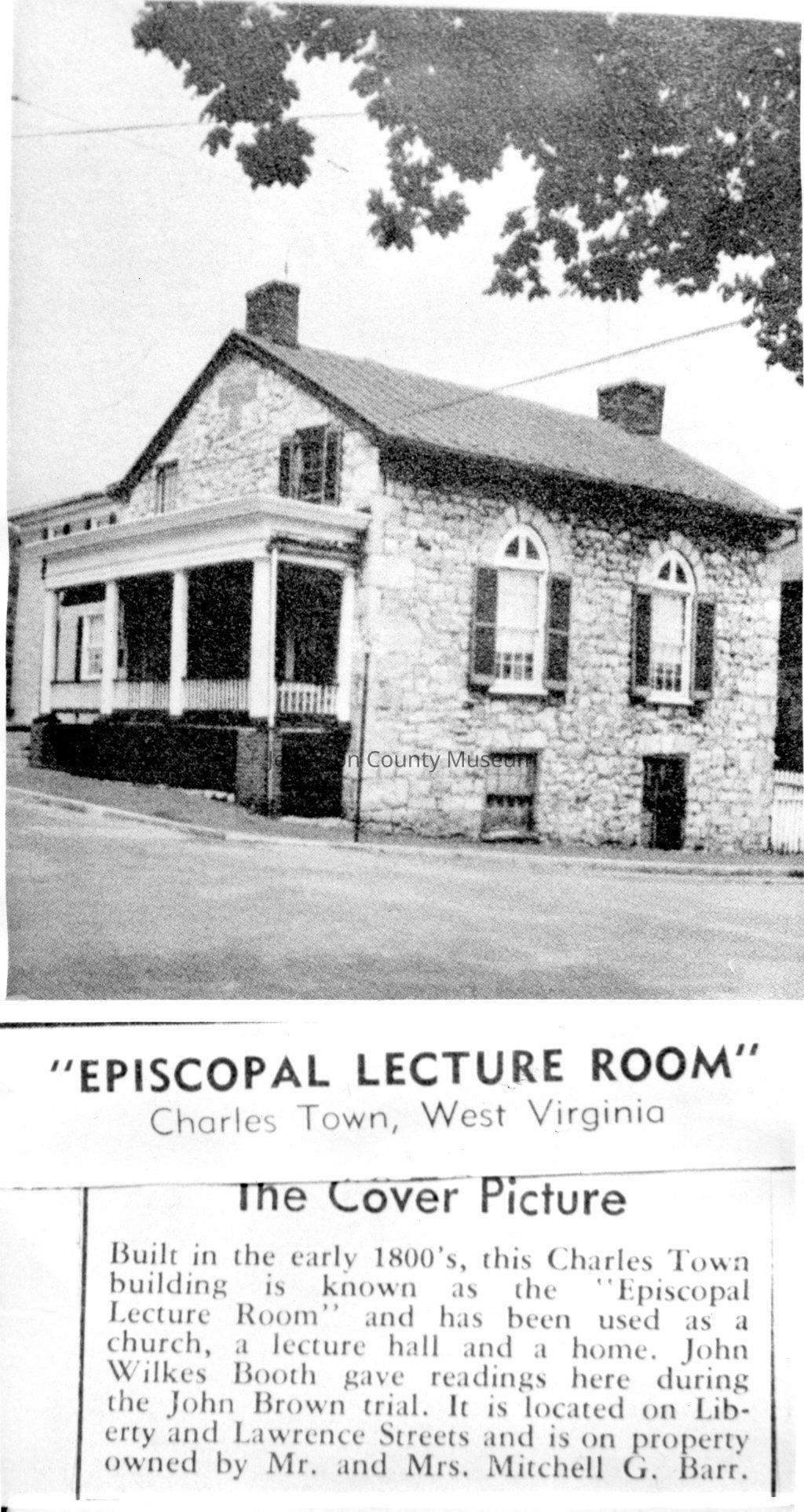 Article reads: "Built in the early 1800's, this Charles Town building is known as the "Episcopal Lecture Room" and has been used as a church, a lecture hall and a home. John Wilkes Booth gave readings here during the John Brown trial. It is located on Liberty and Lawrence Streets and is on property owned by Mr. and Mrs. Mitchell G. Barr."Acquisition
