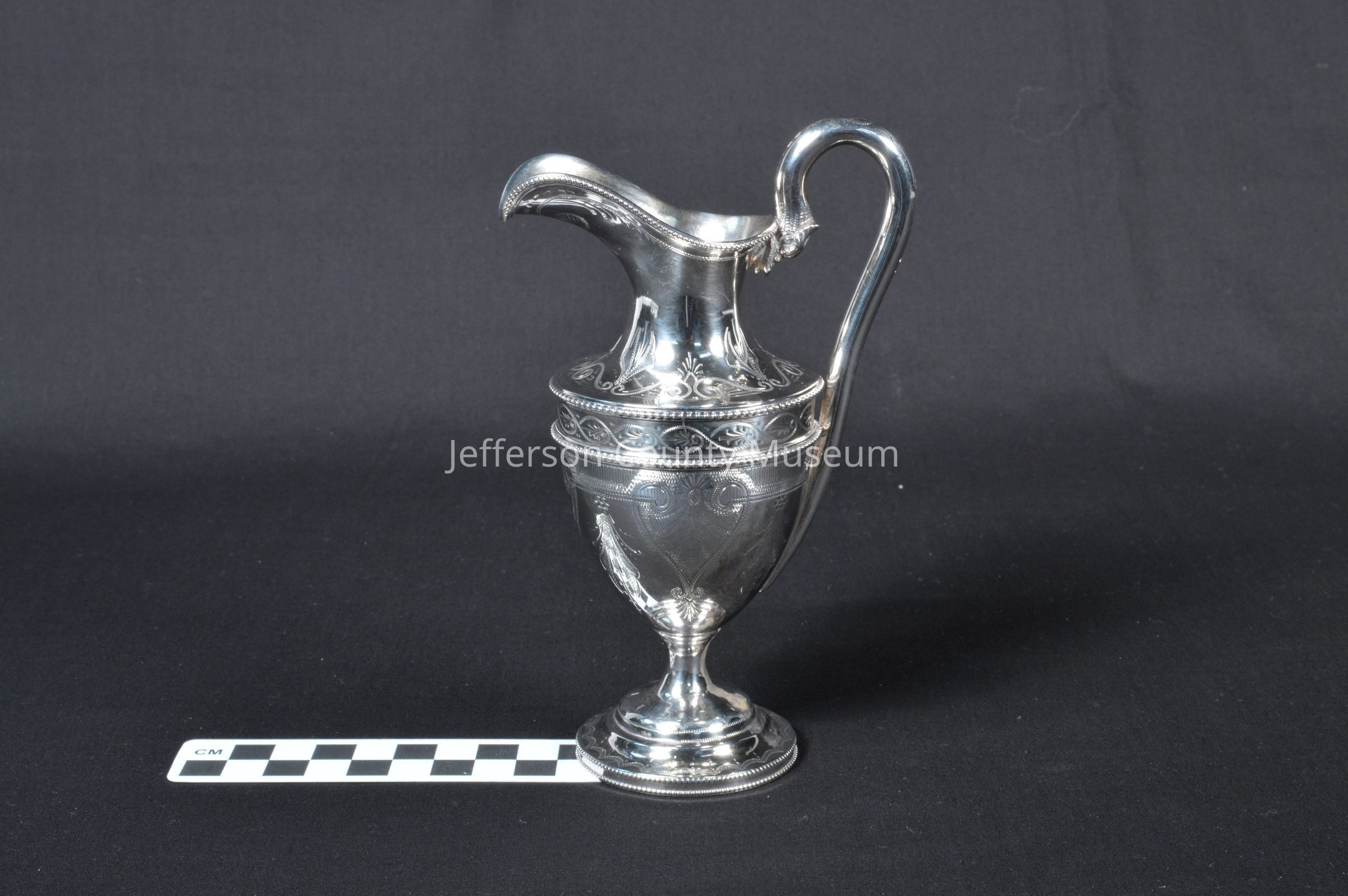Cream pitcher shaped like vase. K. B. to H. R. L. 1866 on front in heart shape.Acquisition