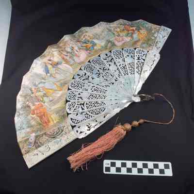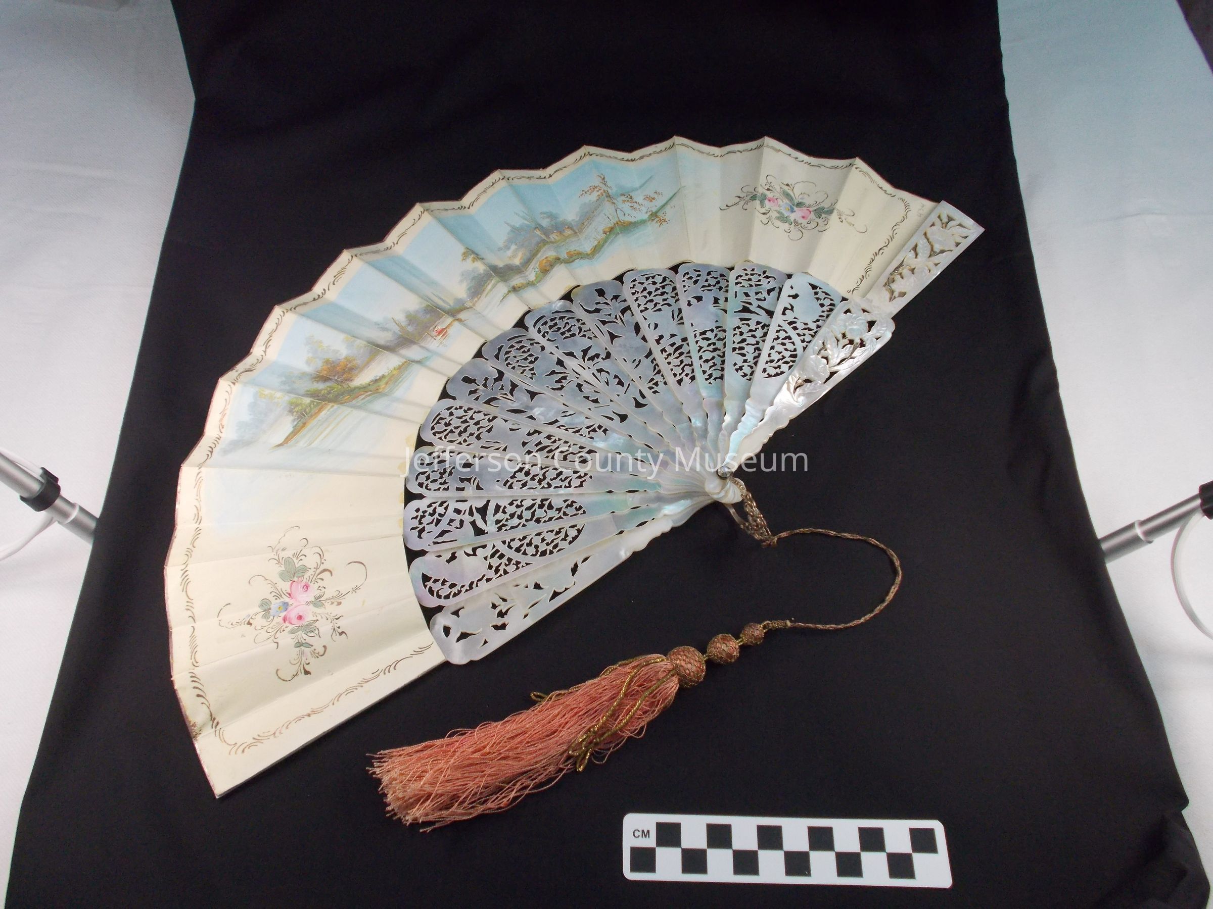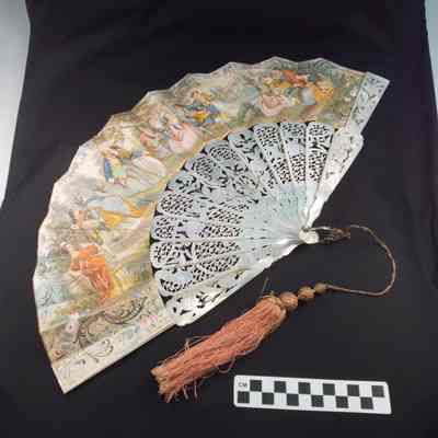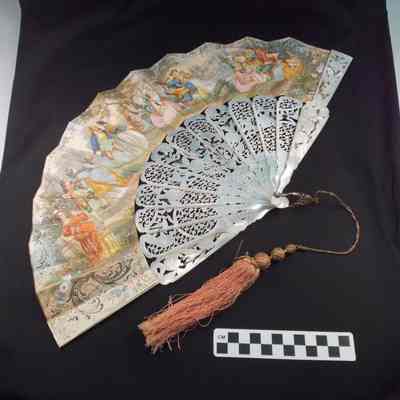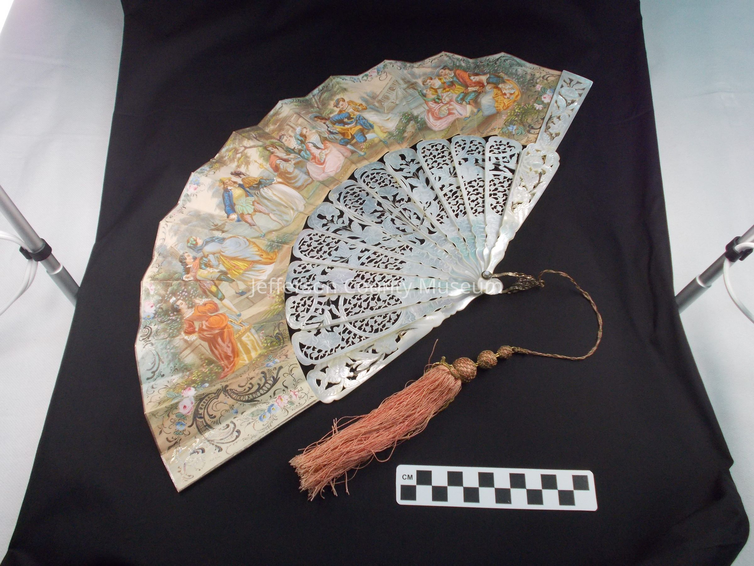 Tiffany fan, mother of pearl handle, opal on base of fan. Court figures on one side, flowers on other side. Faded red tassels attached to bottom.Acquisition