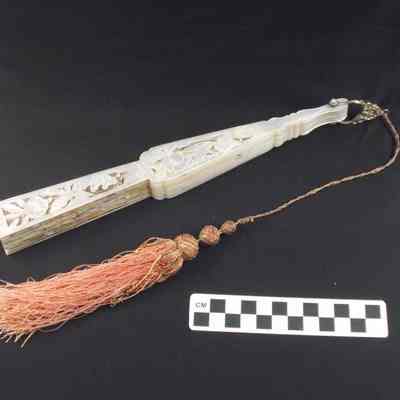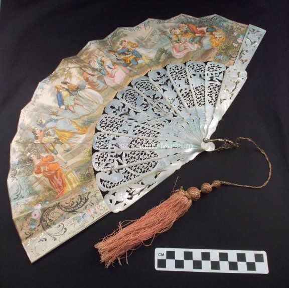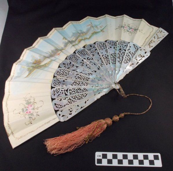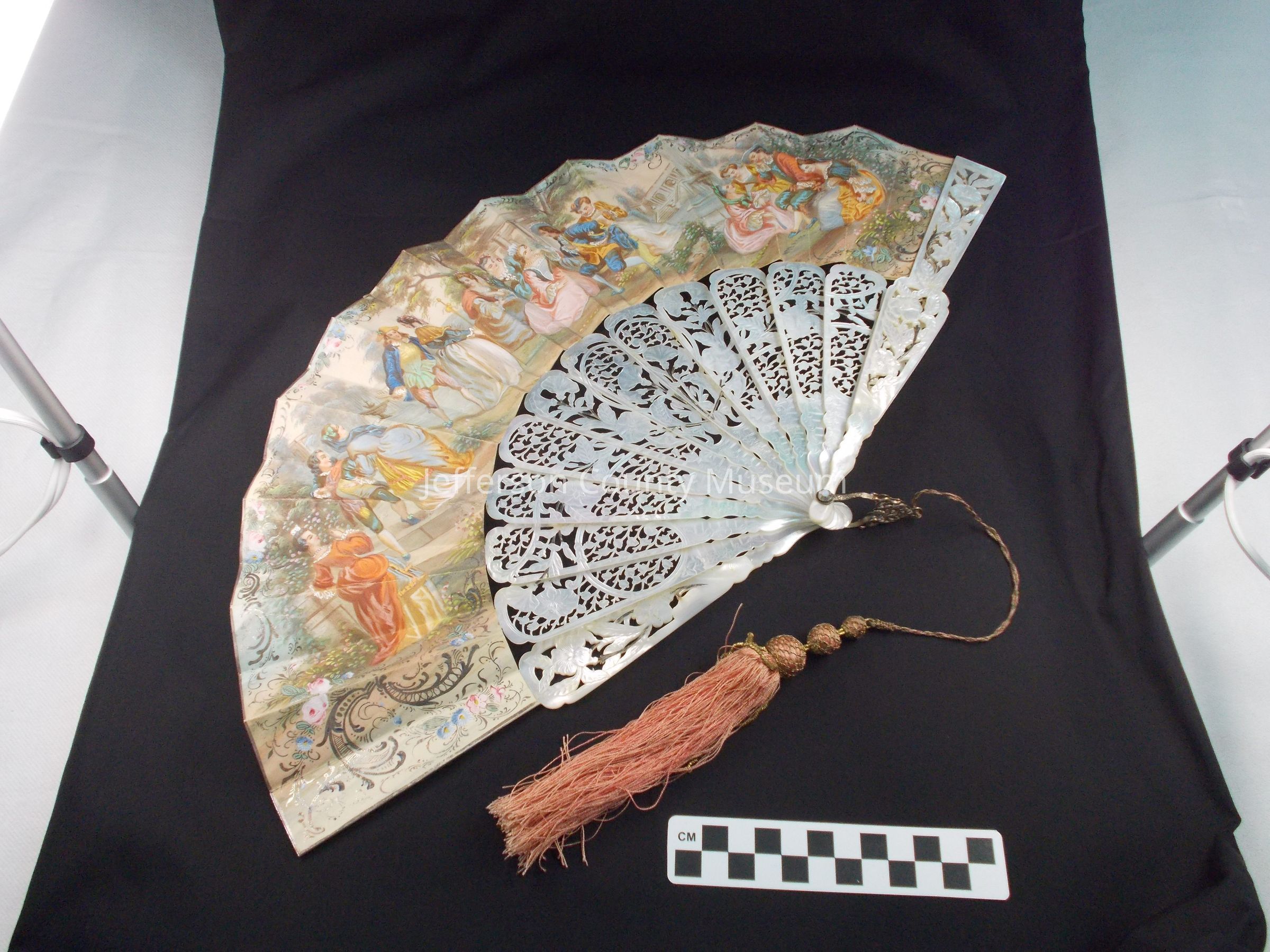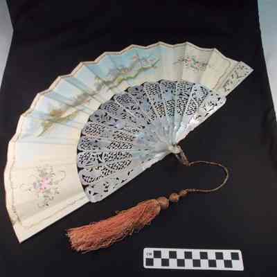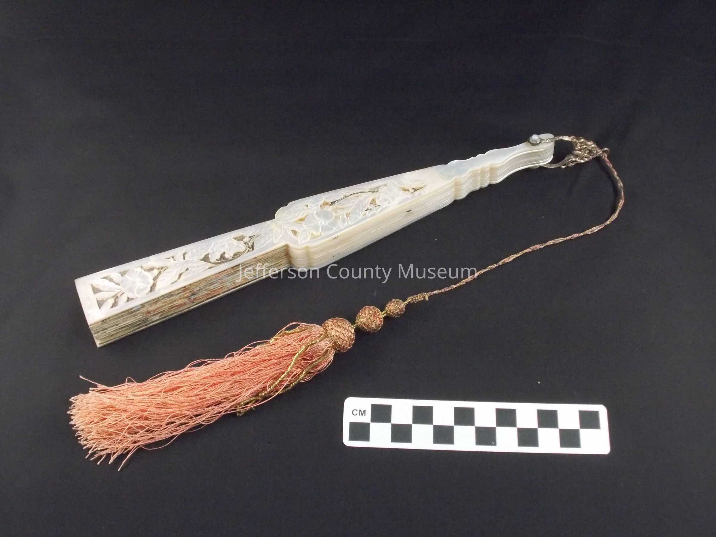 Tiffany fan, mother of pearl handle, opal on base of fan. Court figures on one side, flowers on other side. Faded red tassels attached to bottom.Acquisition