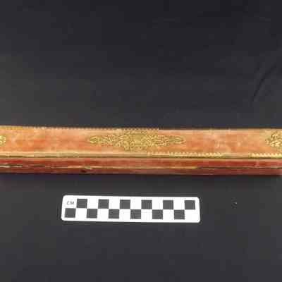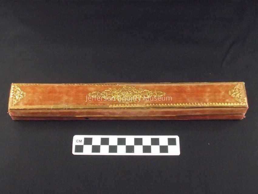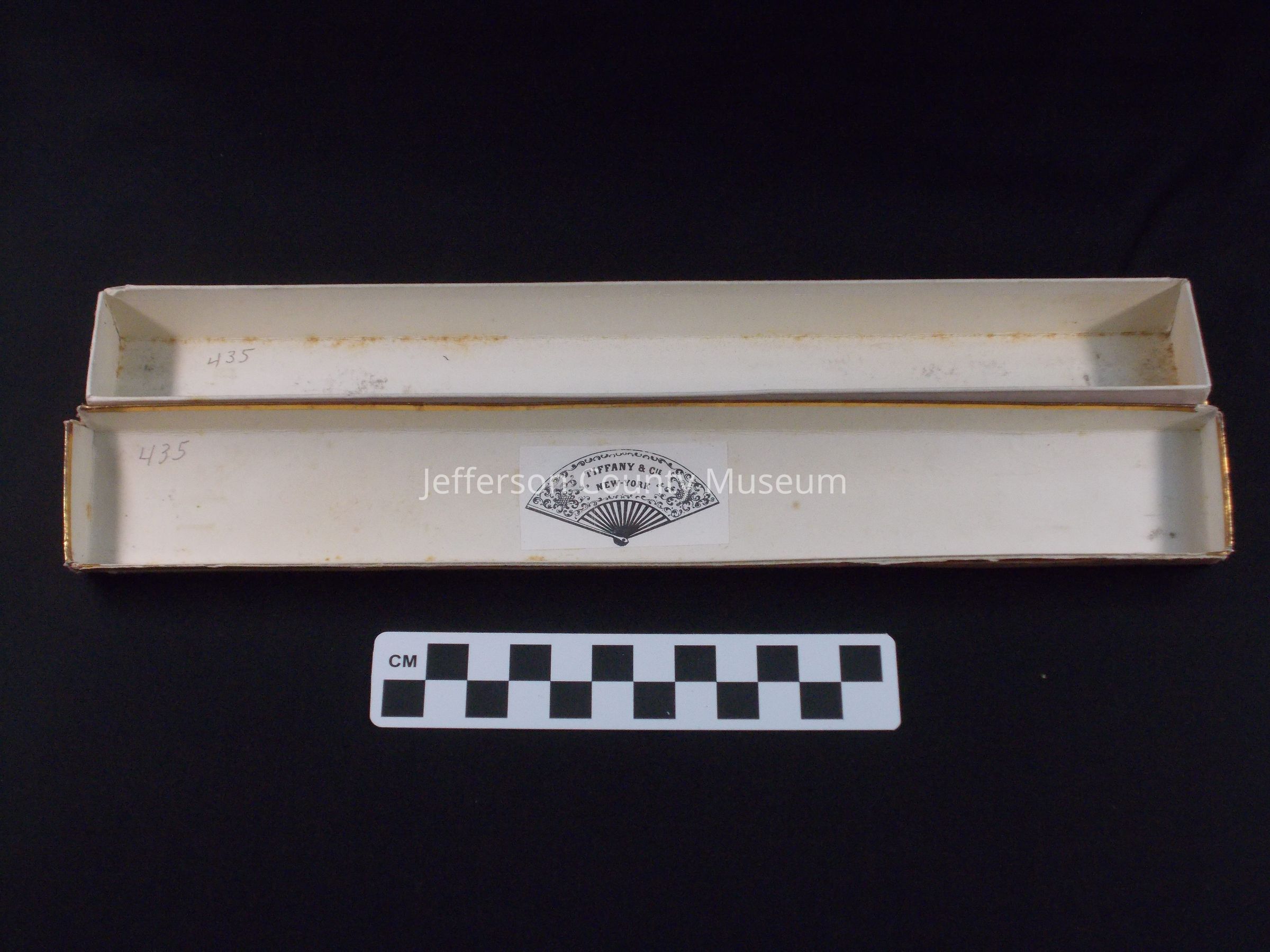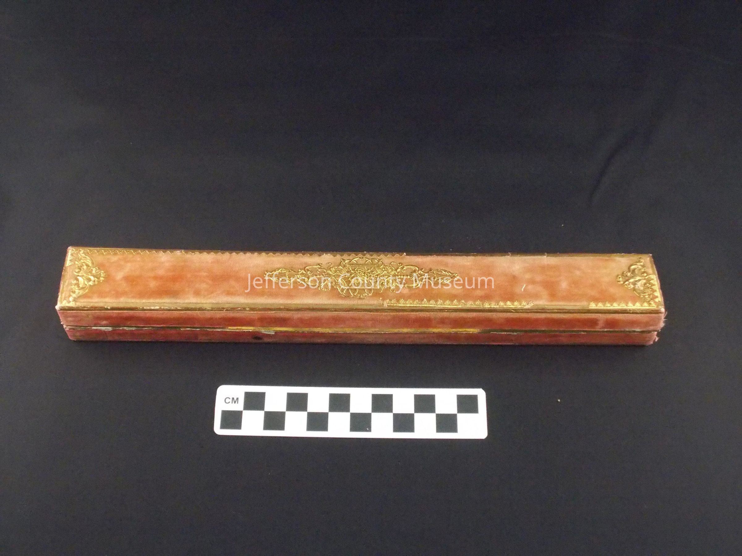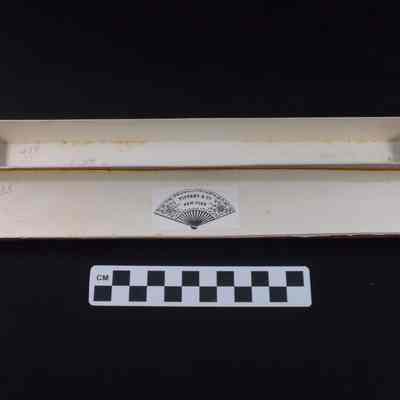 Faded red box for Tiffany fan. Covered with felt and gold design. Label inside has picture of fan and "TIFFANY & CIE NEW YORK".Acquisition