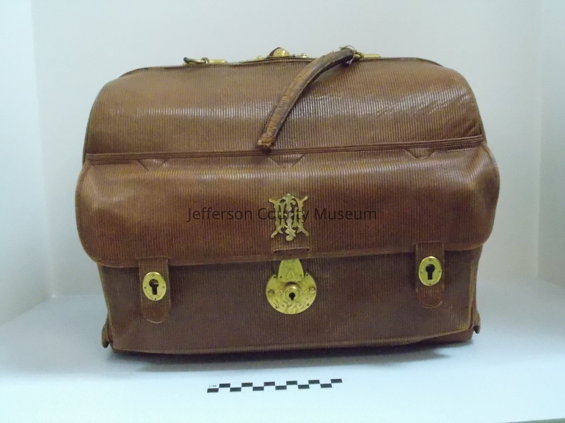 Light brown leather travel bag. Circa 1872. Handle on top, gold colored clasp and attachments for handle. Gold colored clasps for side pocket. "HL" monogrammed in gold metal on side. Inside side pocket flap "HARRIET LANE JOHNSTON 120 PARK ST. BALTIMORE".Acquisition