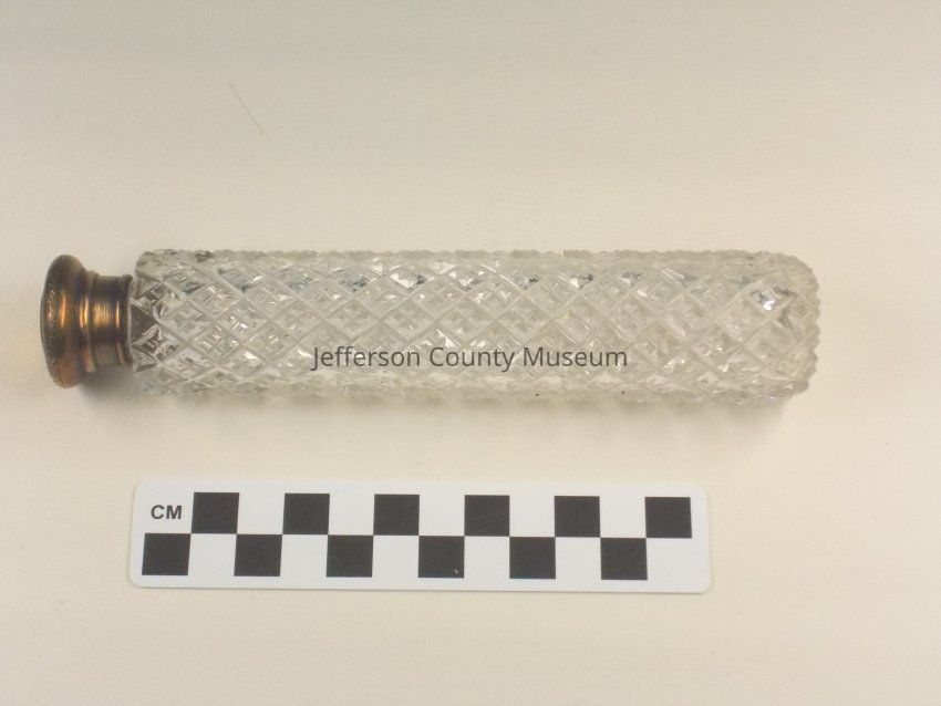 Cut glass bottle with gold washed silver cap. "HLJ" monogrammed on cap. Cap is slightly smaller in diameter than catalog number 441. "HLJ" refers to Harriet Lane Johnston.Acquisition