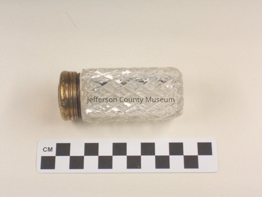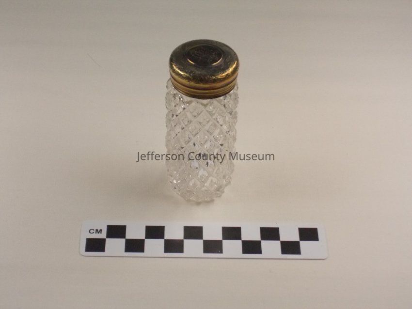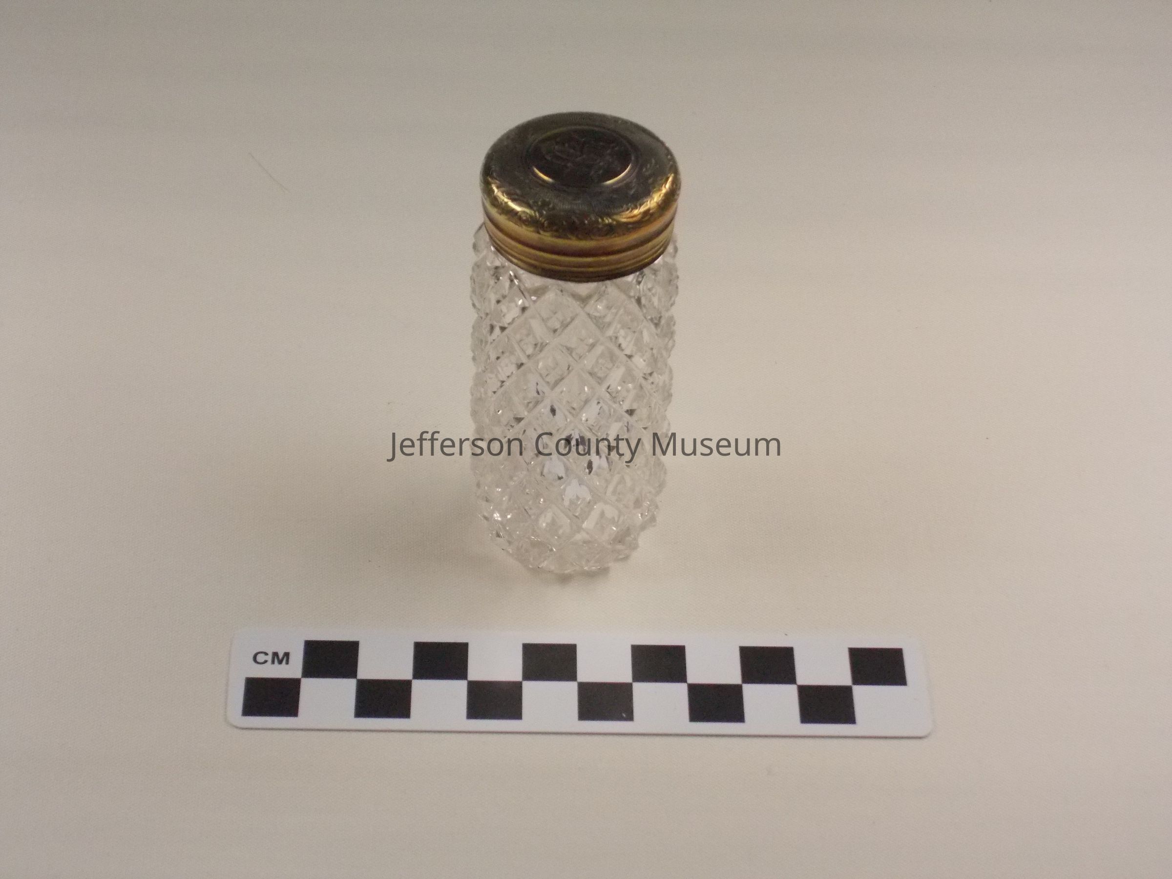 Cut glass bottle with gold washed cap. "HLJ" monogrammed on cap. "HLJ" refers to Harriet Lane Johnston.Acquisition