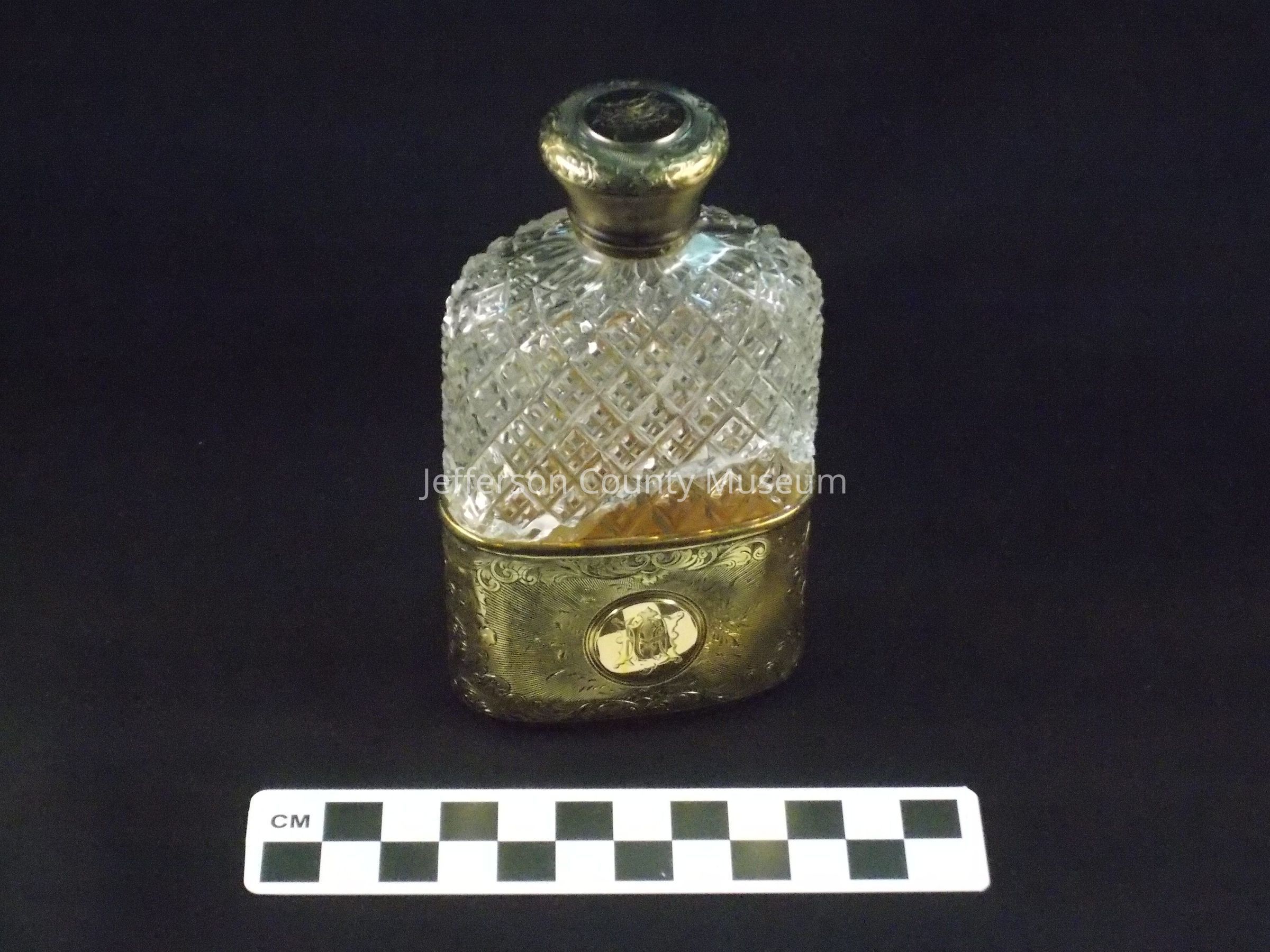 Cut glass and gold washed silver flask. "HLJ" monogrammed in circle on front and cap. Four maker's marks on edge of cap. Five maker's marks on back side of flask. "HLJ" refers to Harriet Lane Johnston. Part of catalog #440.Acquisition