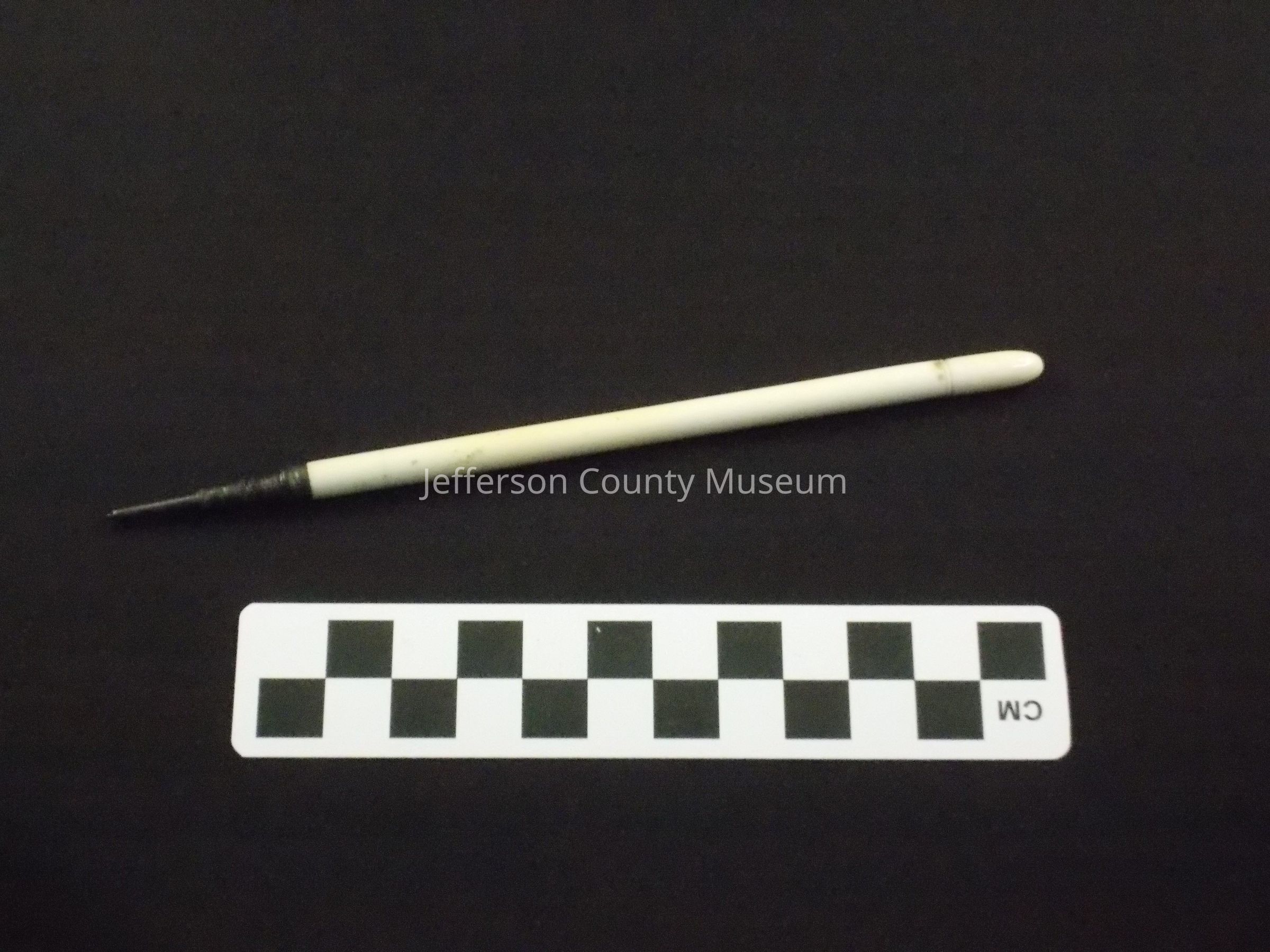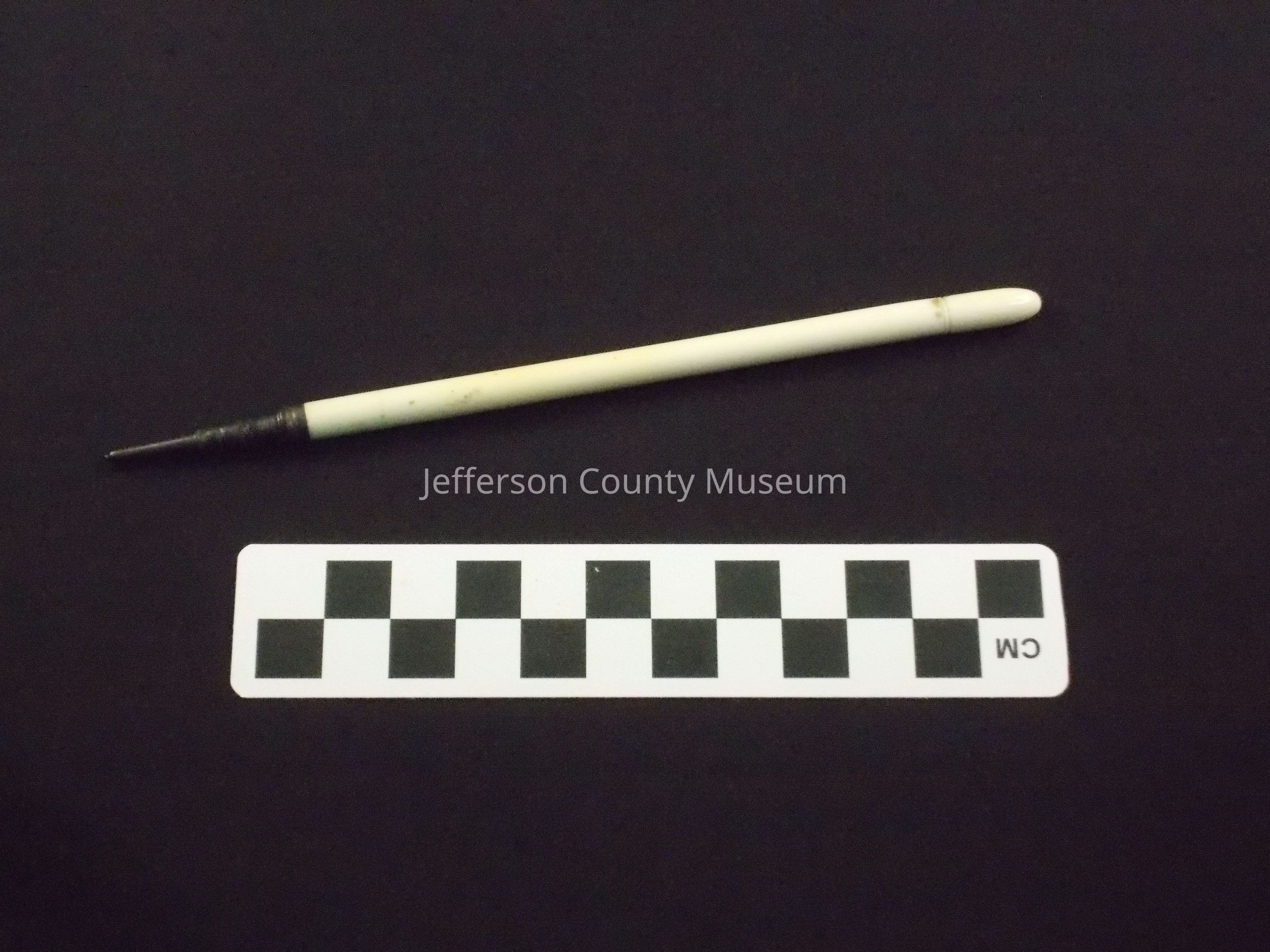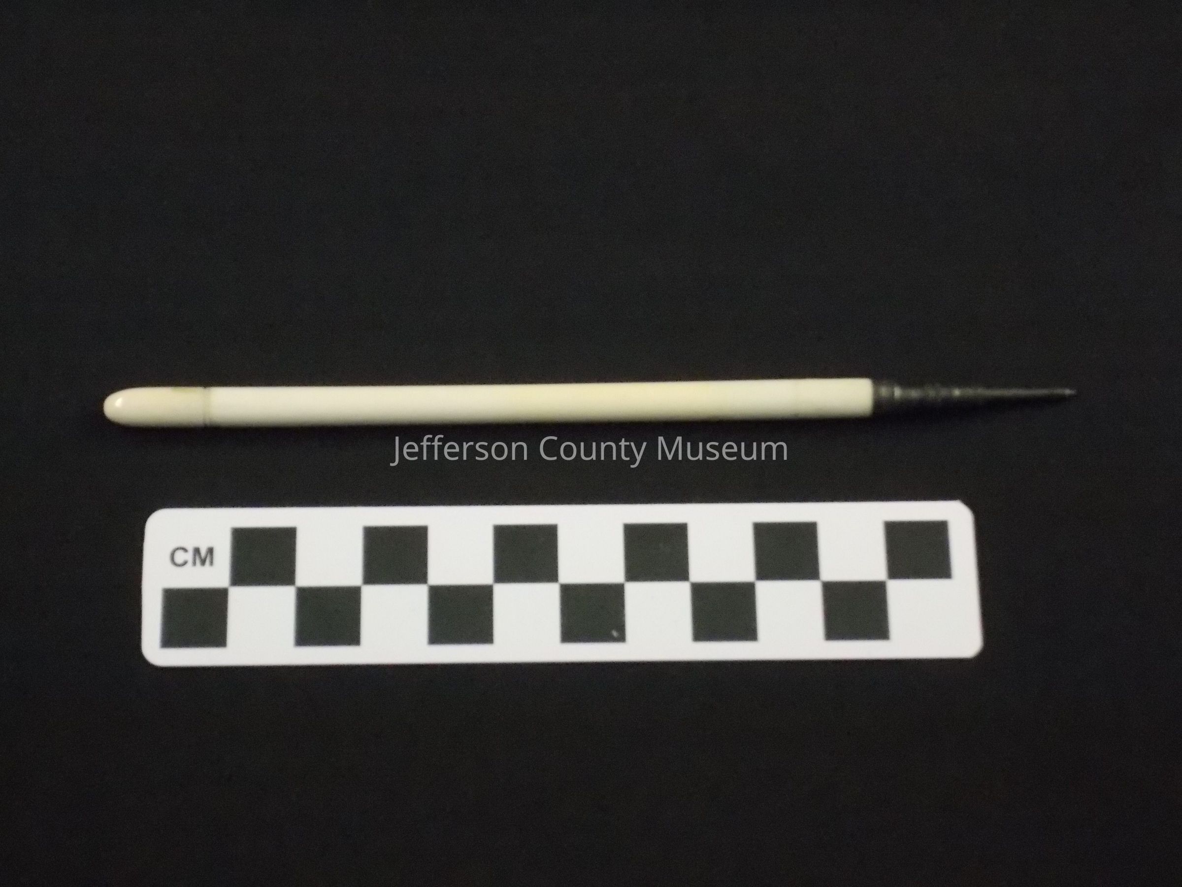 Ivory handled slate pencil. Metal tip. Part of writing case, which is part of a toilet kit.Acquisition