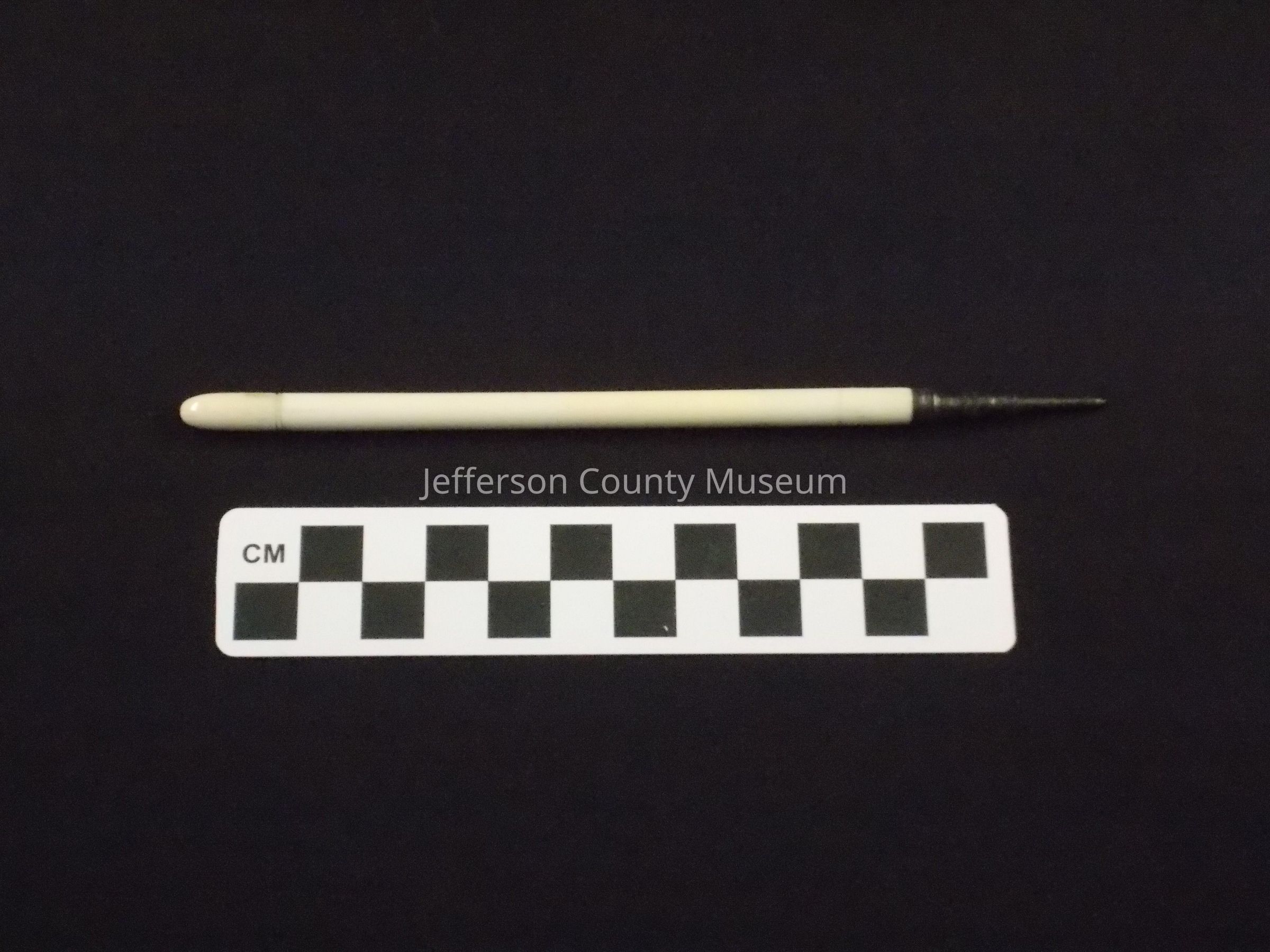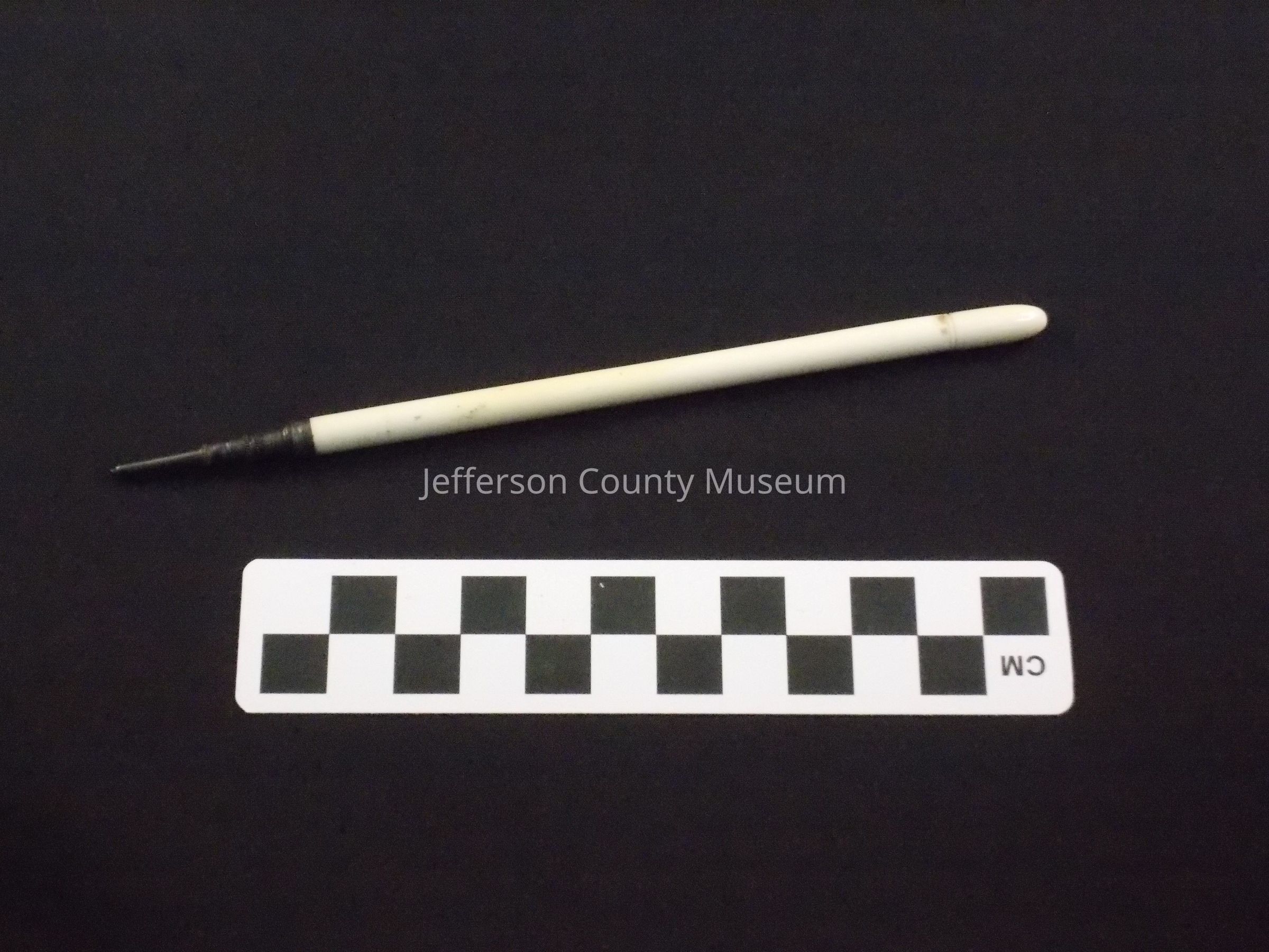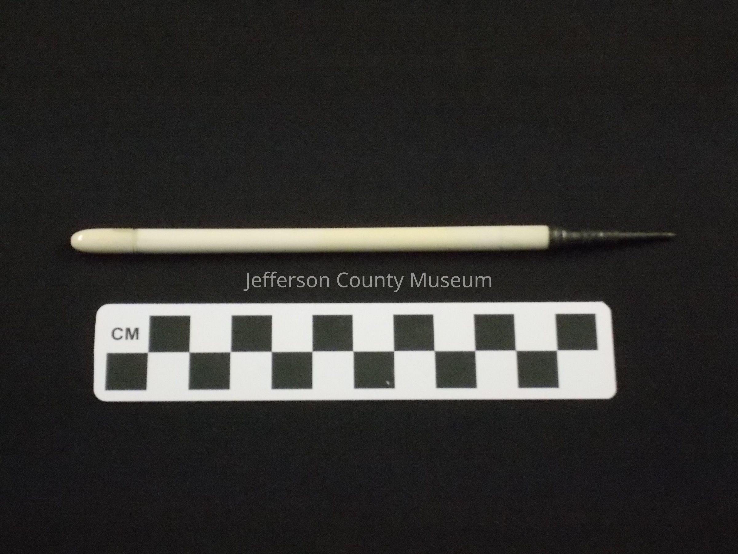 Ivory handled slate pencil. Metal tip. Part of writing case, which is part of a toilet kit.Acquisition