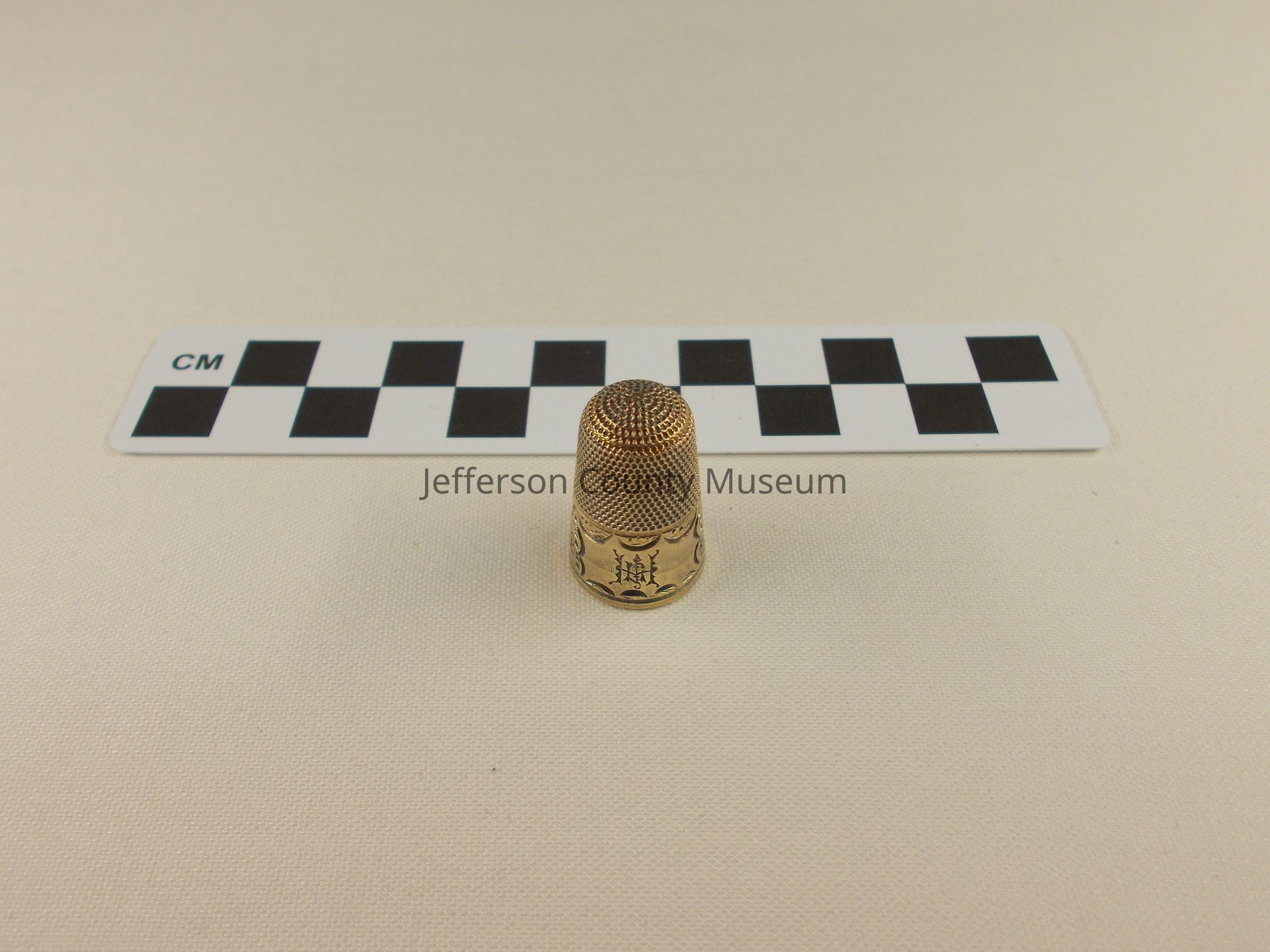 Brass colored thimble. The bottom half is inscribed with a floral motif, and with Harriet Lane Johnston's monogram.The most prominent letter in the monogram is H, while the other letters appear to include some or all of the initials R, L, and/or J.Acquisition
