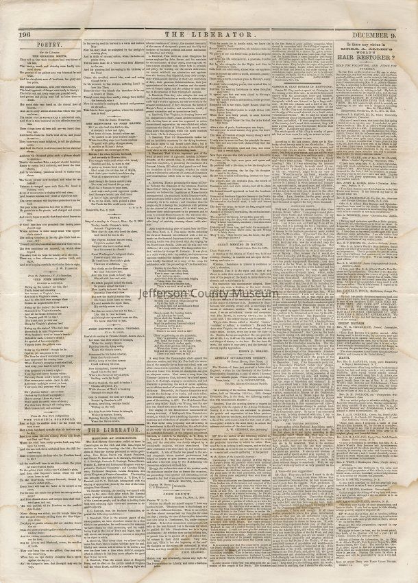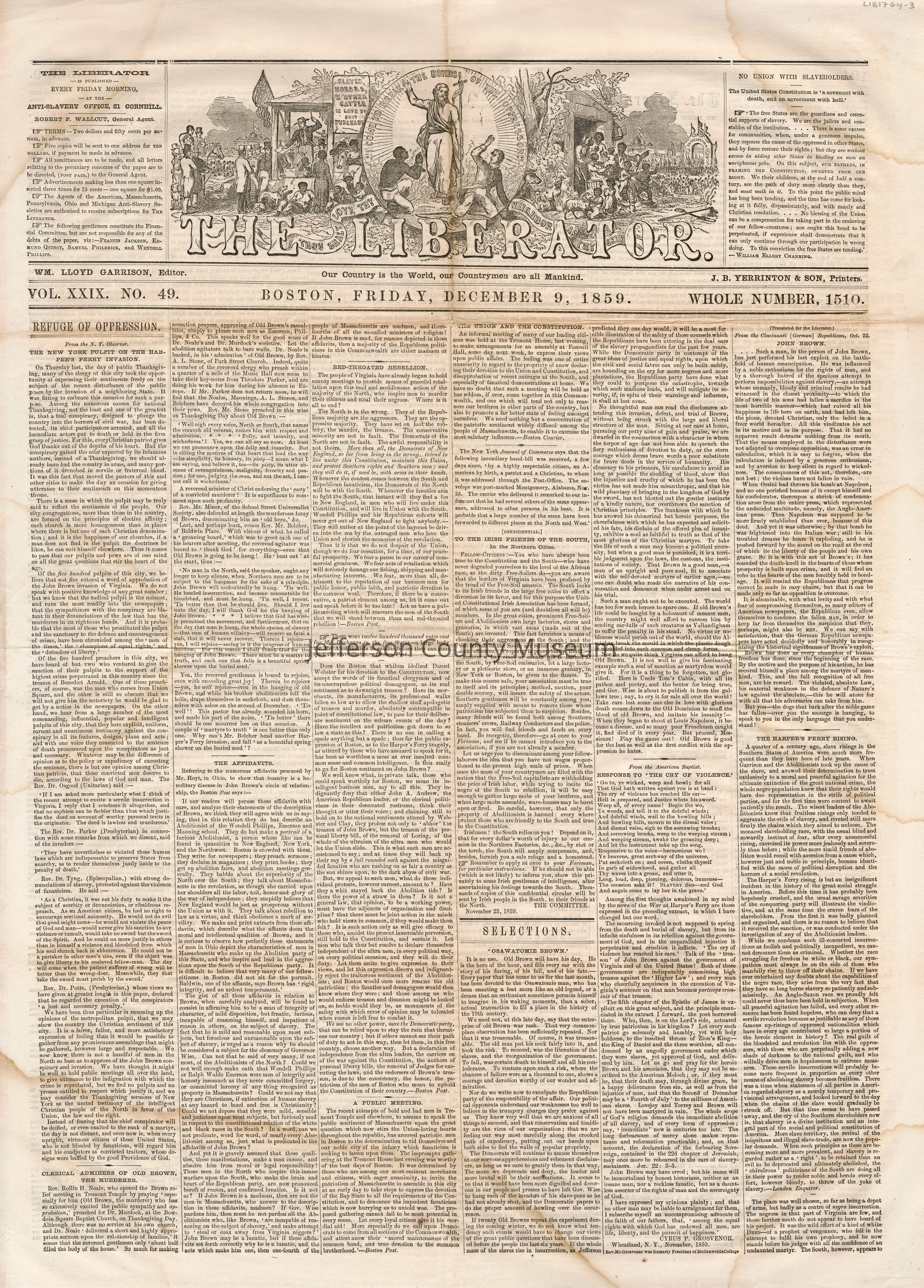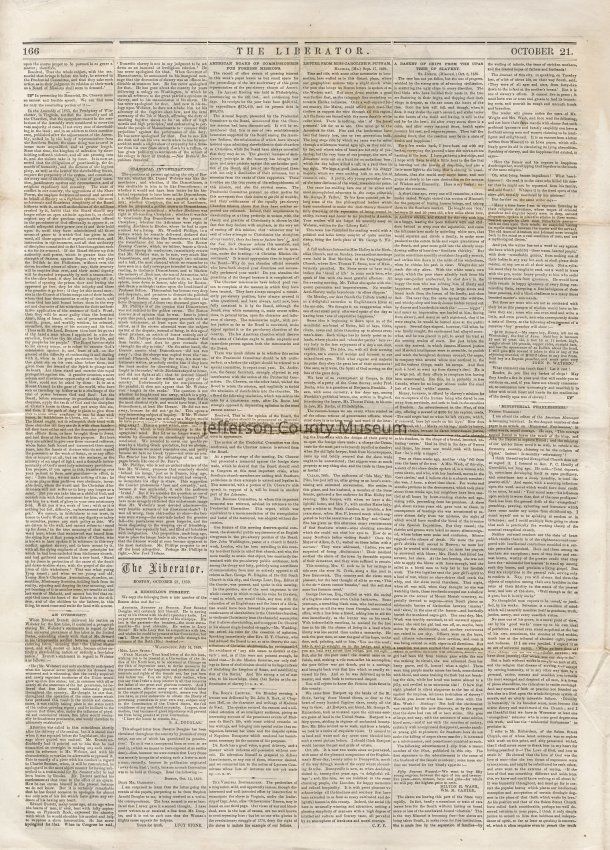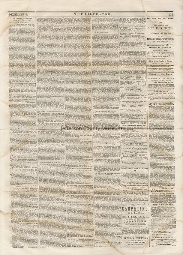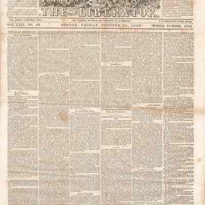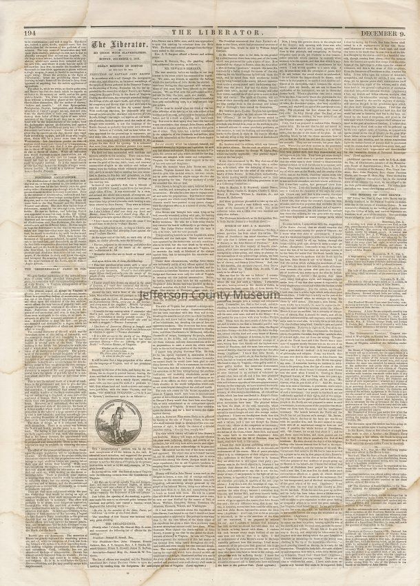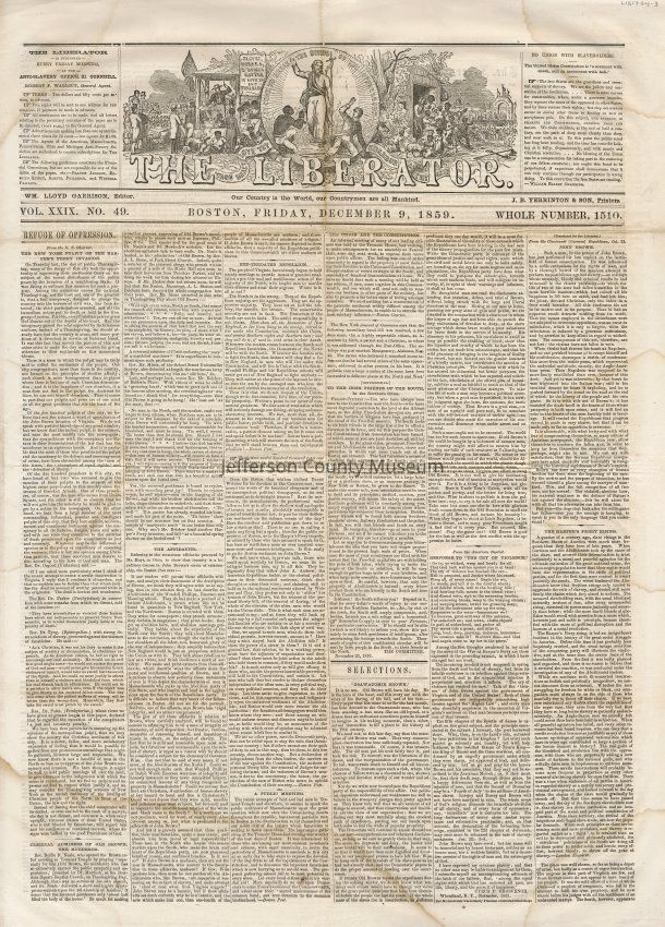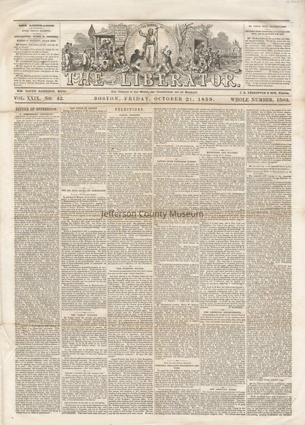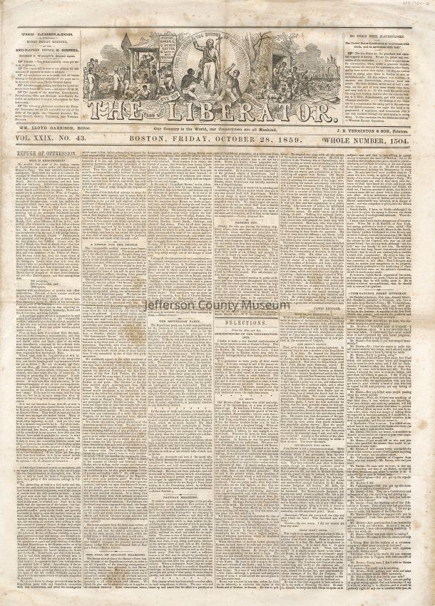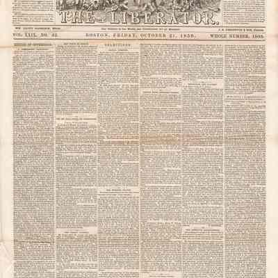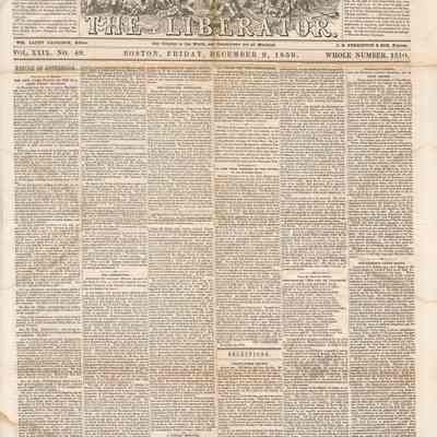 3 issues of The Liberator, Boston, Massachusetts. Each issue is four pages and contains headlines and detailed coverage of John Brown's raid on Harpers Ferry, as well as its aftermath, including Brown's trial and execution in Charlestown (Charles Town), Virginia (West Virginia).