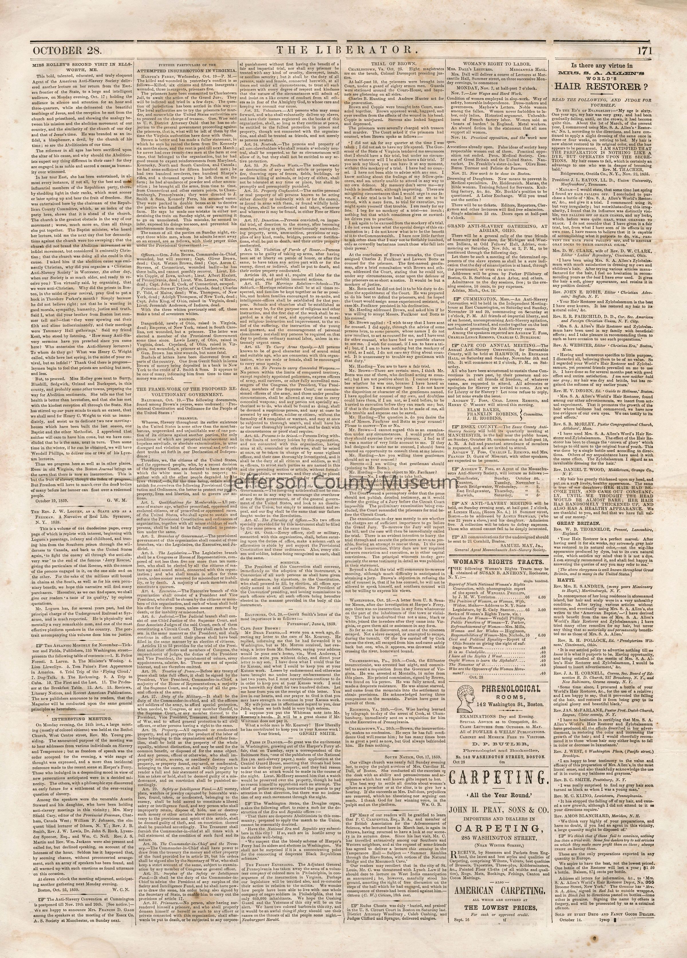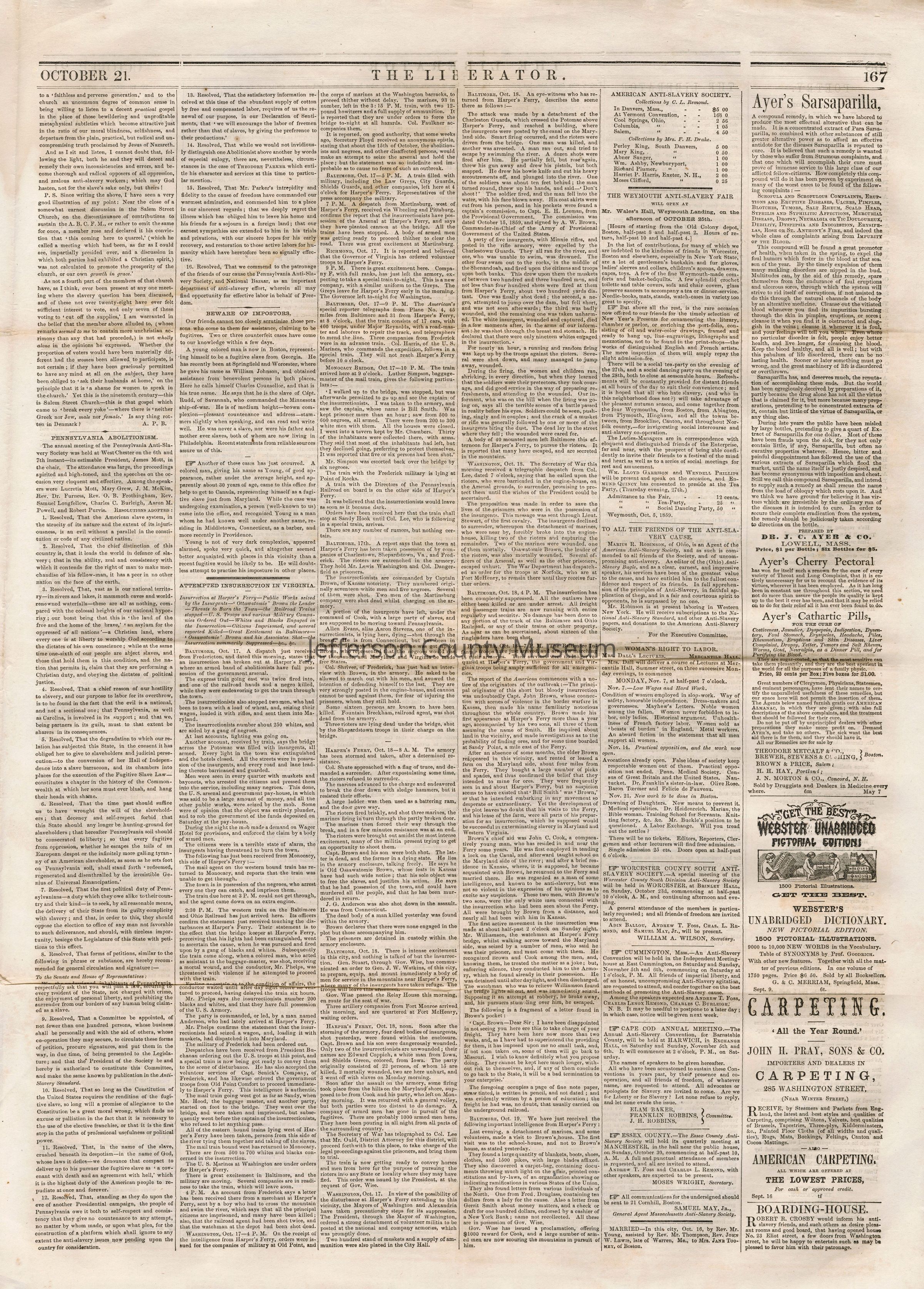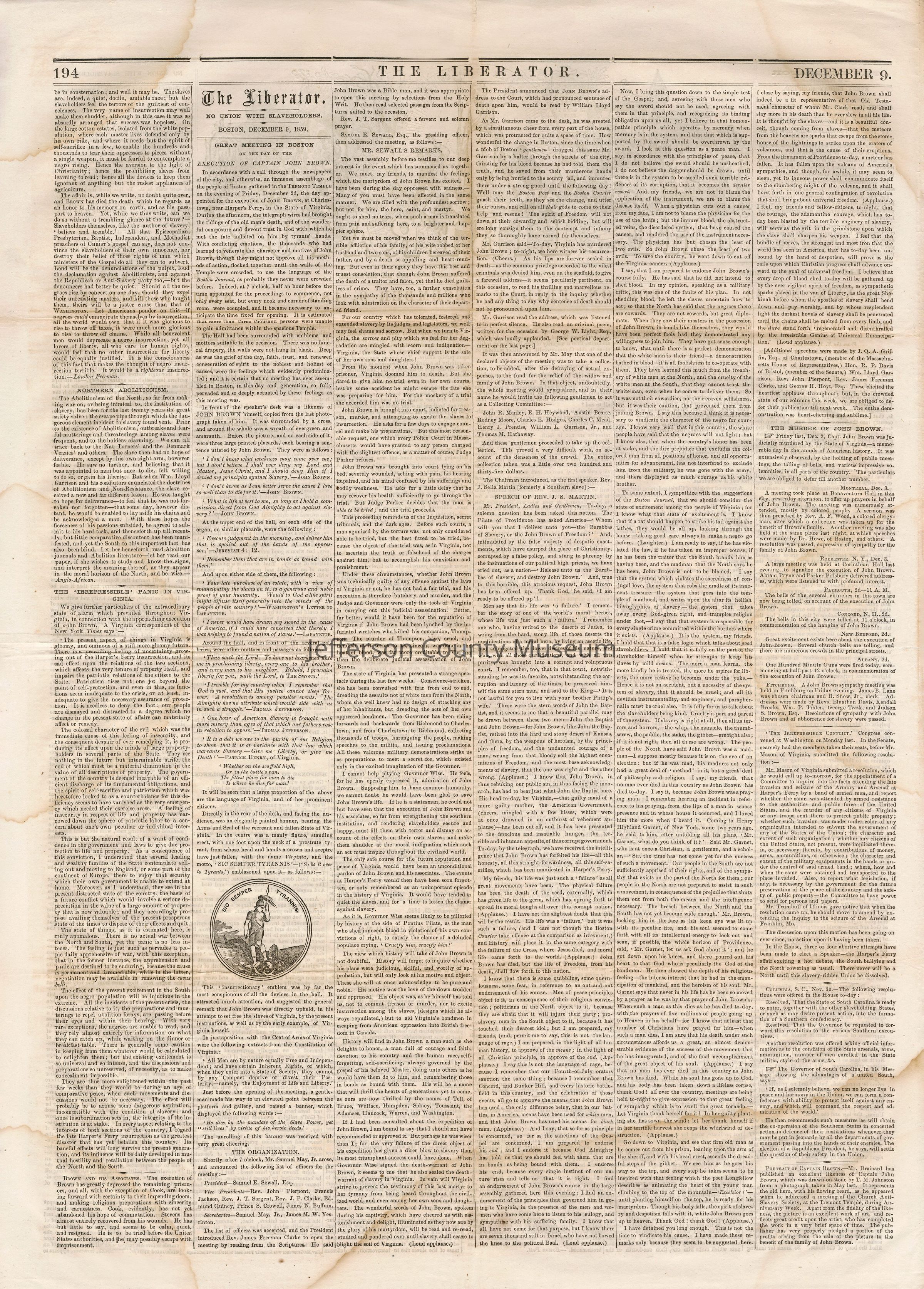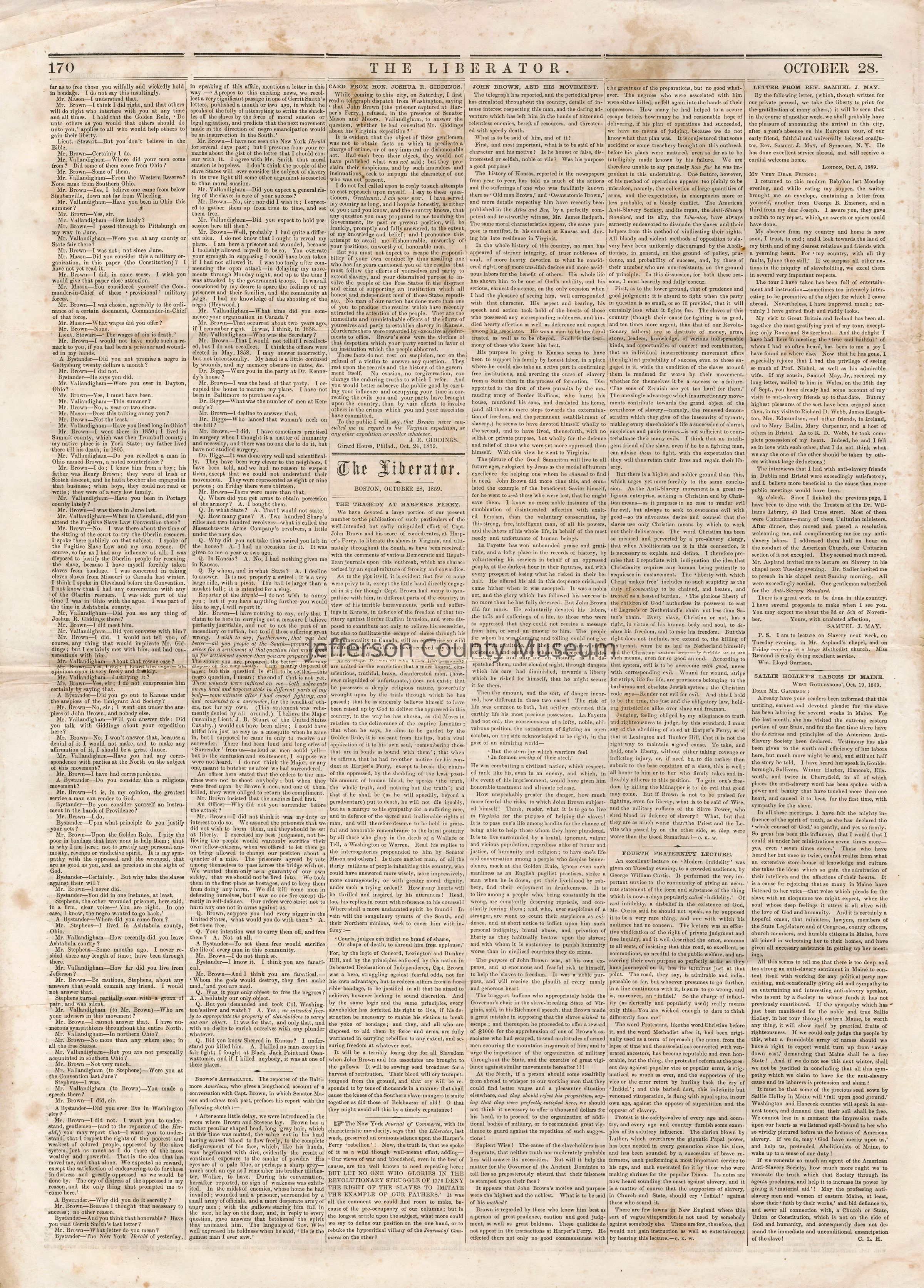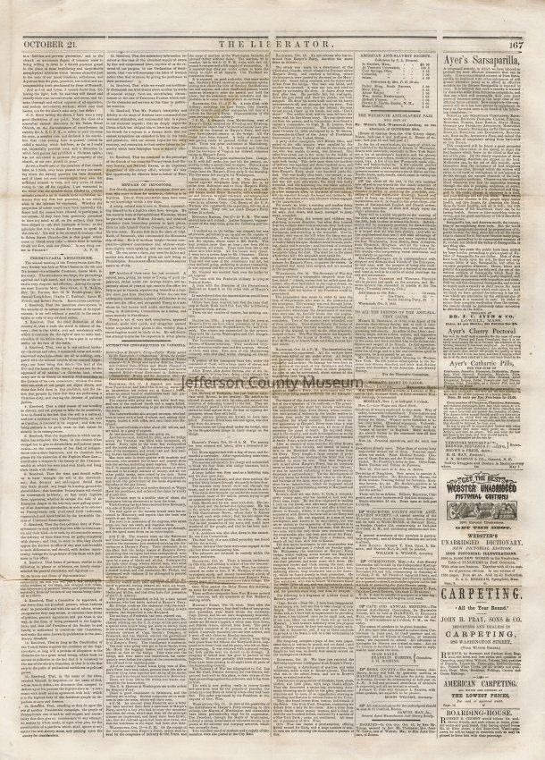 3 issues of The Liberator, Boston, Massachusetts. Each issue is four pages and contains headlines and detailed coverage of John Brown's raid on Harpers Ferry, as well as its aftermath, including Brown's trial and execution in Charlestown (Charles Town), Virginia (West Virginia).