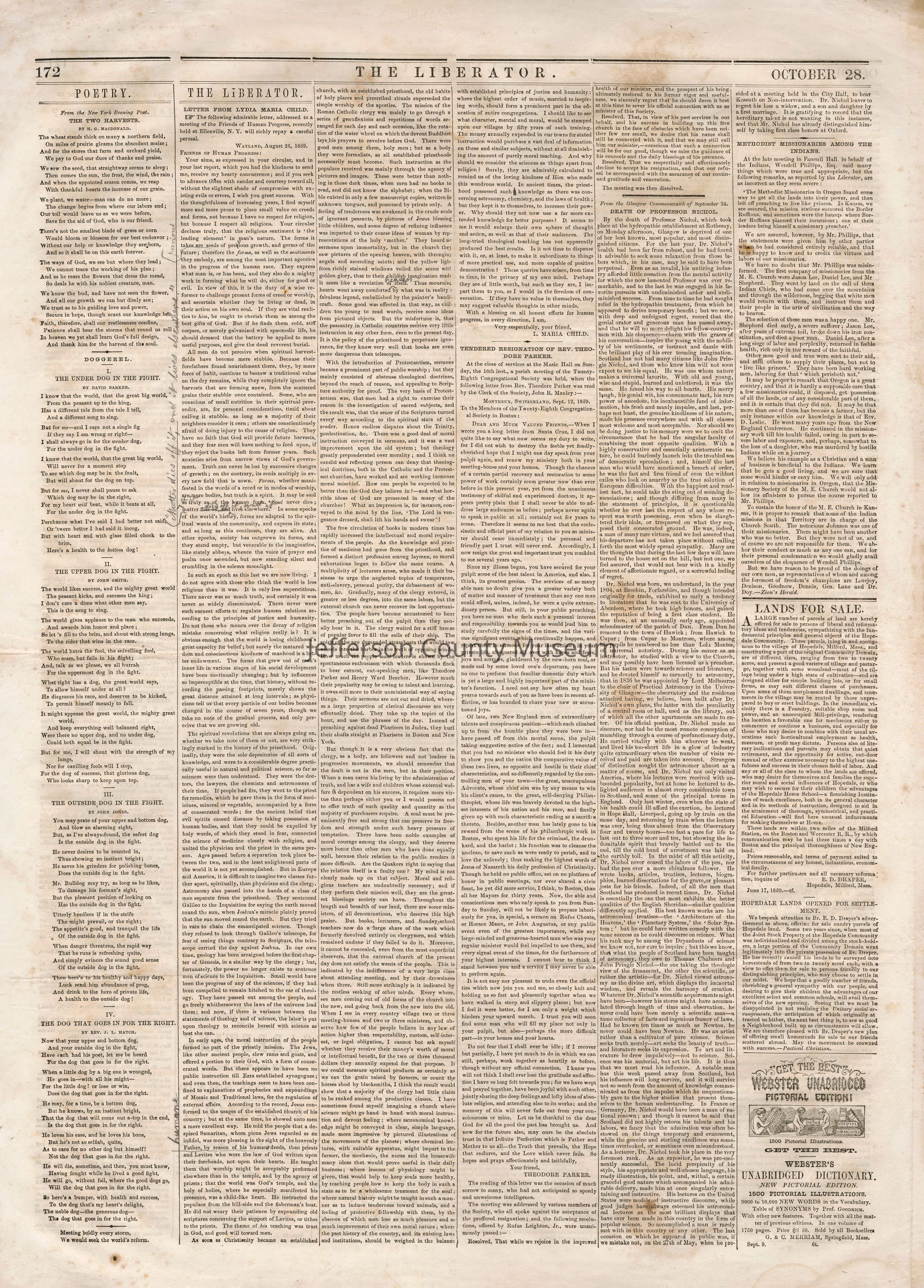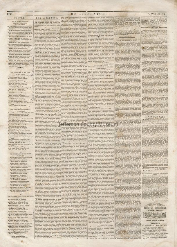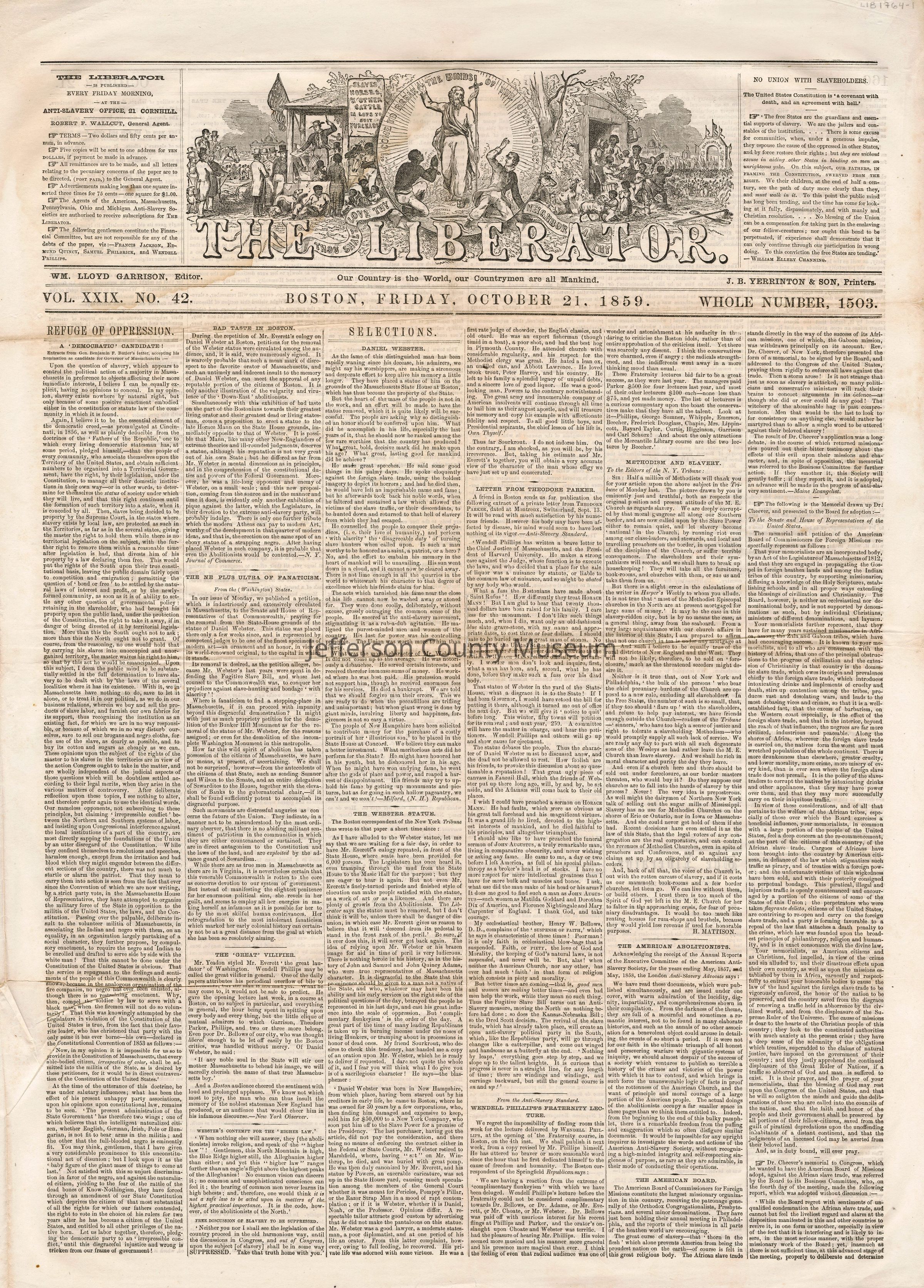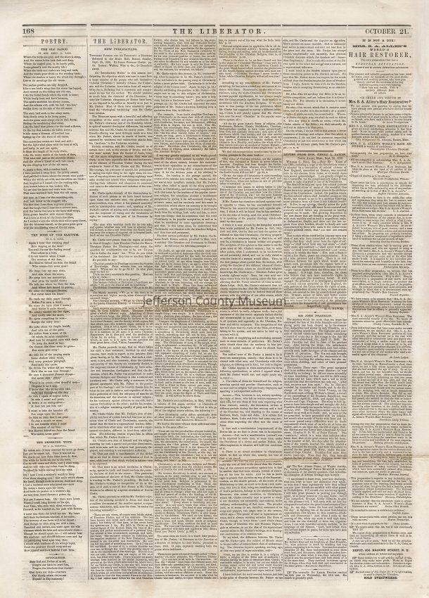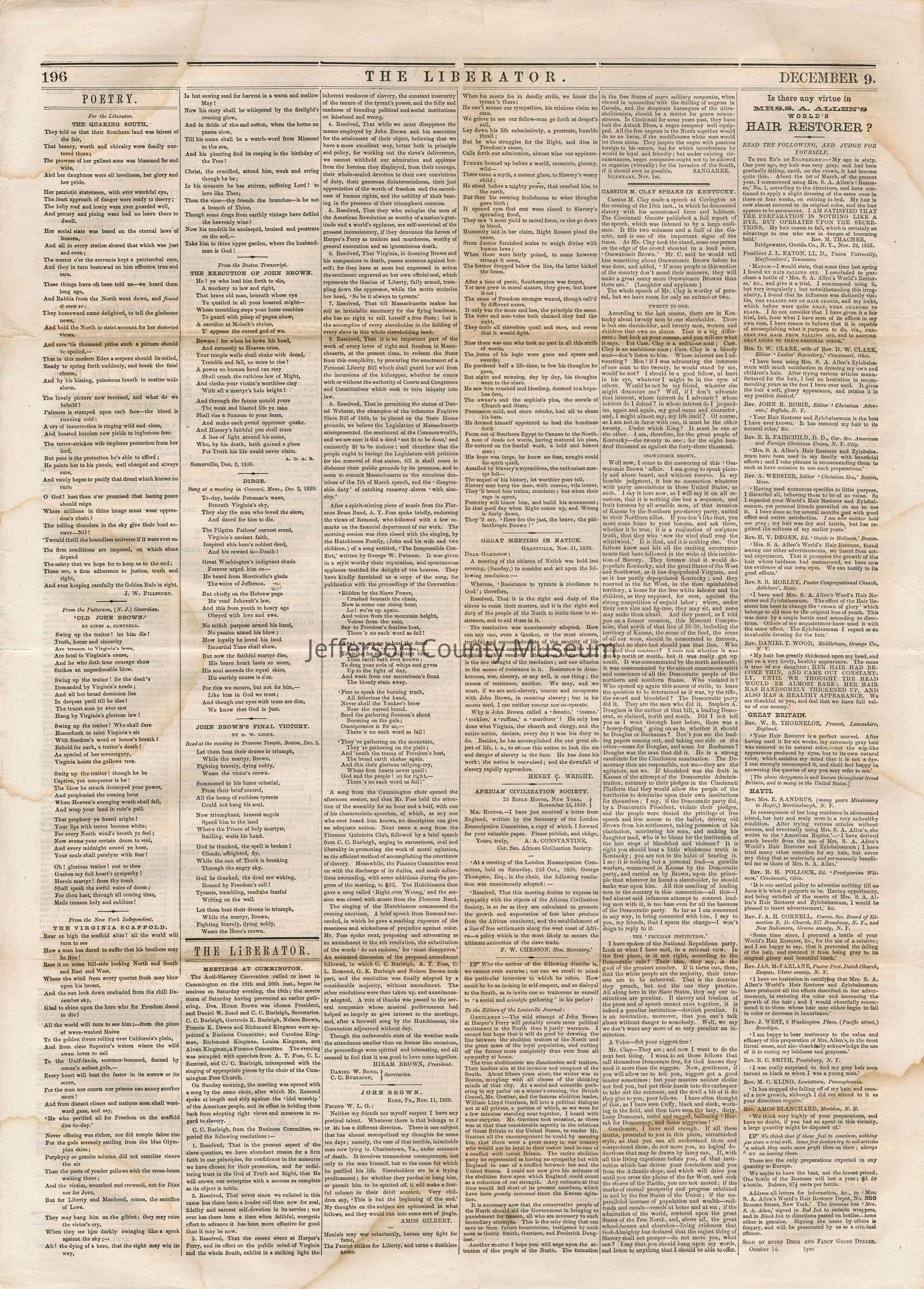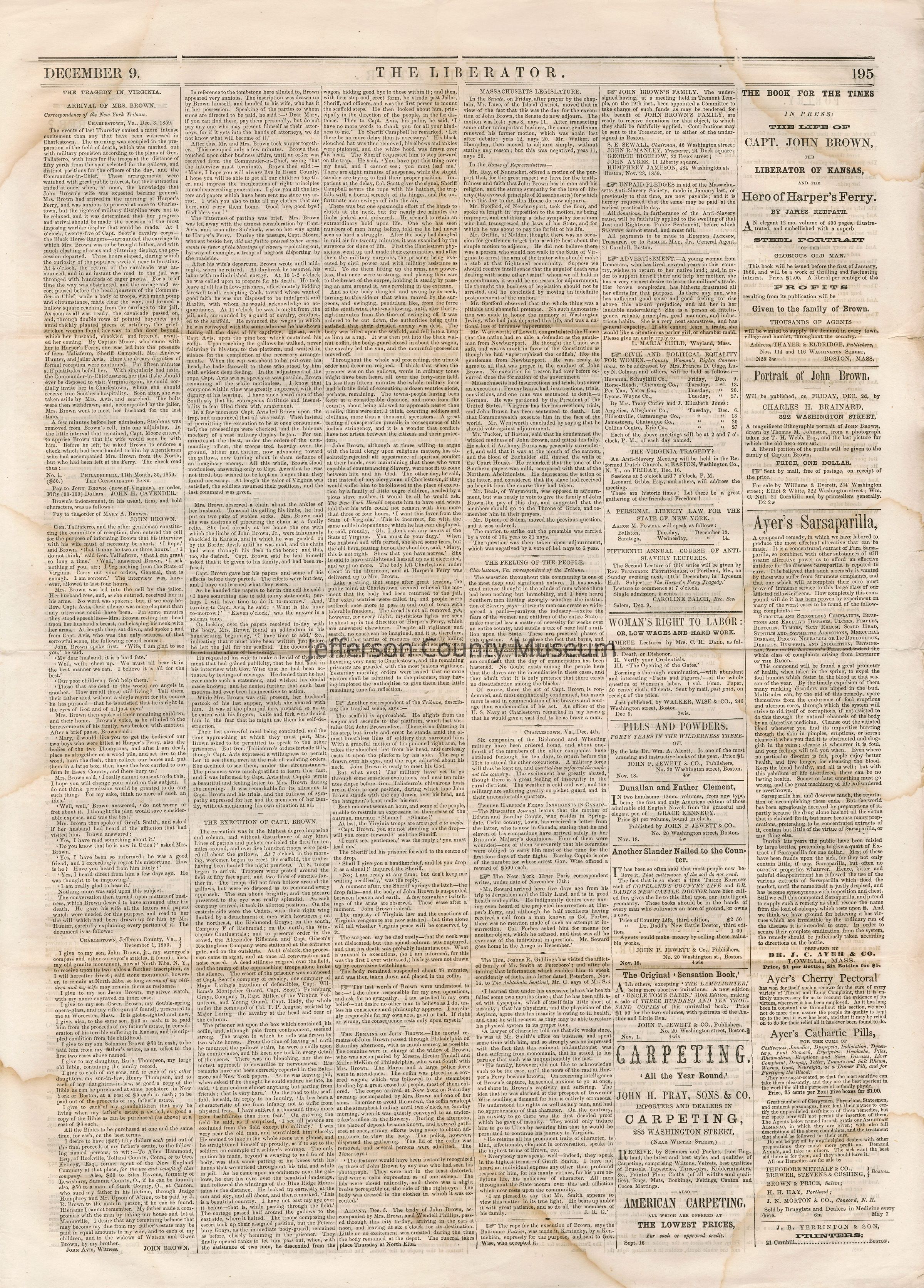 3 issues of The Liberator, Boston, Massachusetts. Each issue is four pages and contains headlines and detailed coverage of John Brown's raid on Harpers Ferry, as well as its aftermath, including Brown's trial and execution in Charlestown (Charles Town), Virginia (West Virginia).