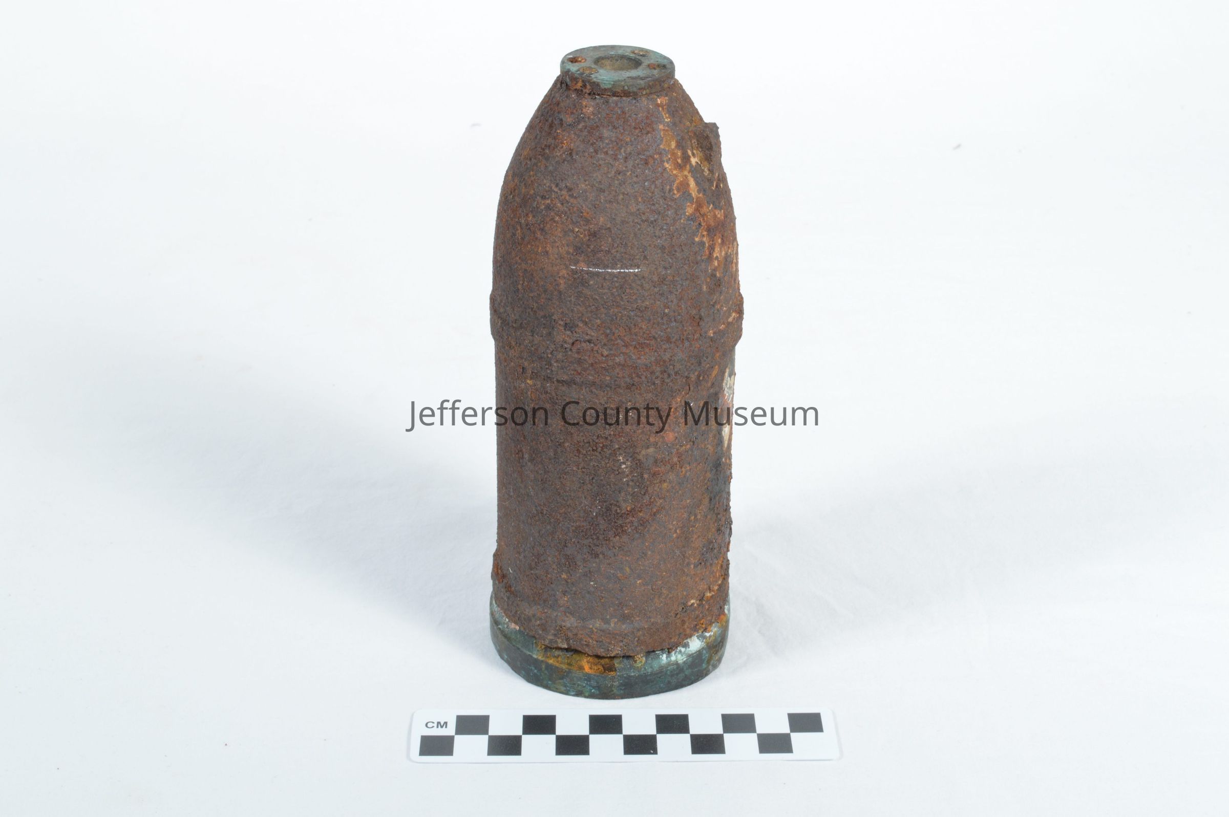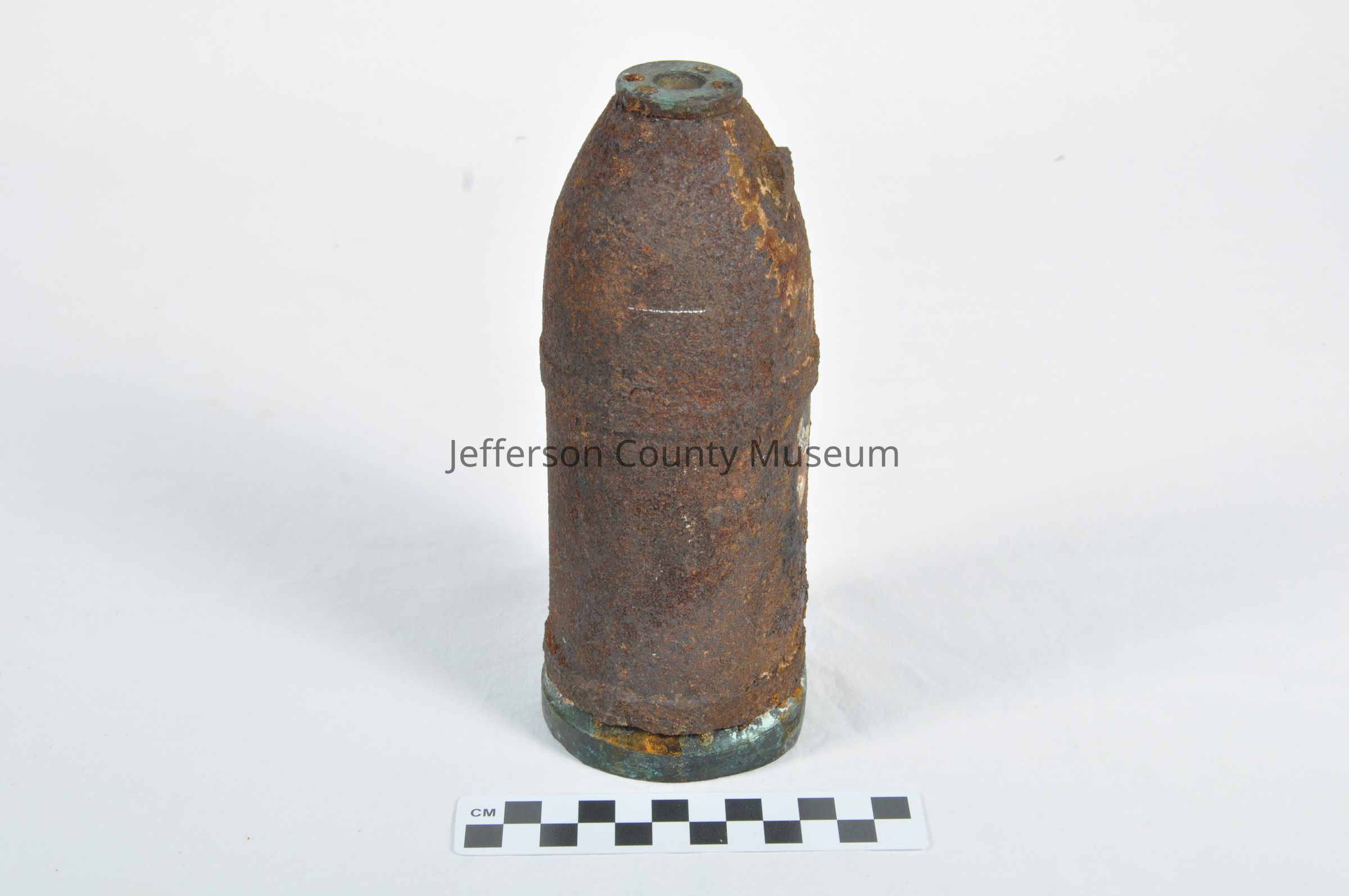 3 inch Reed shell. Has 2 bands which are part of shell, one at base of shell and one closer to top. Brass base. There is a small protrusion or flange near nose. Brass ring on nose.Acquisition