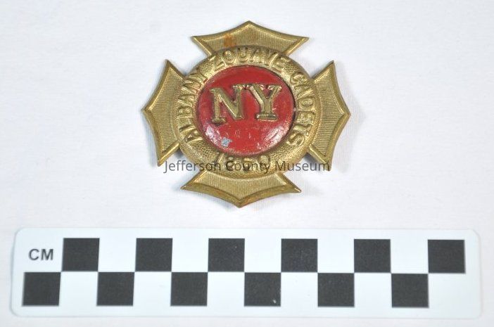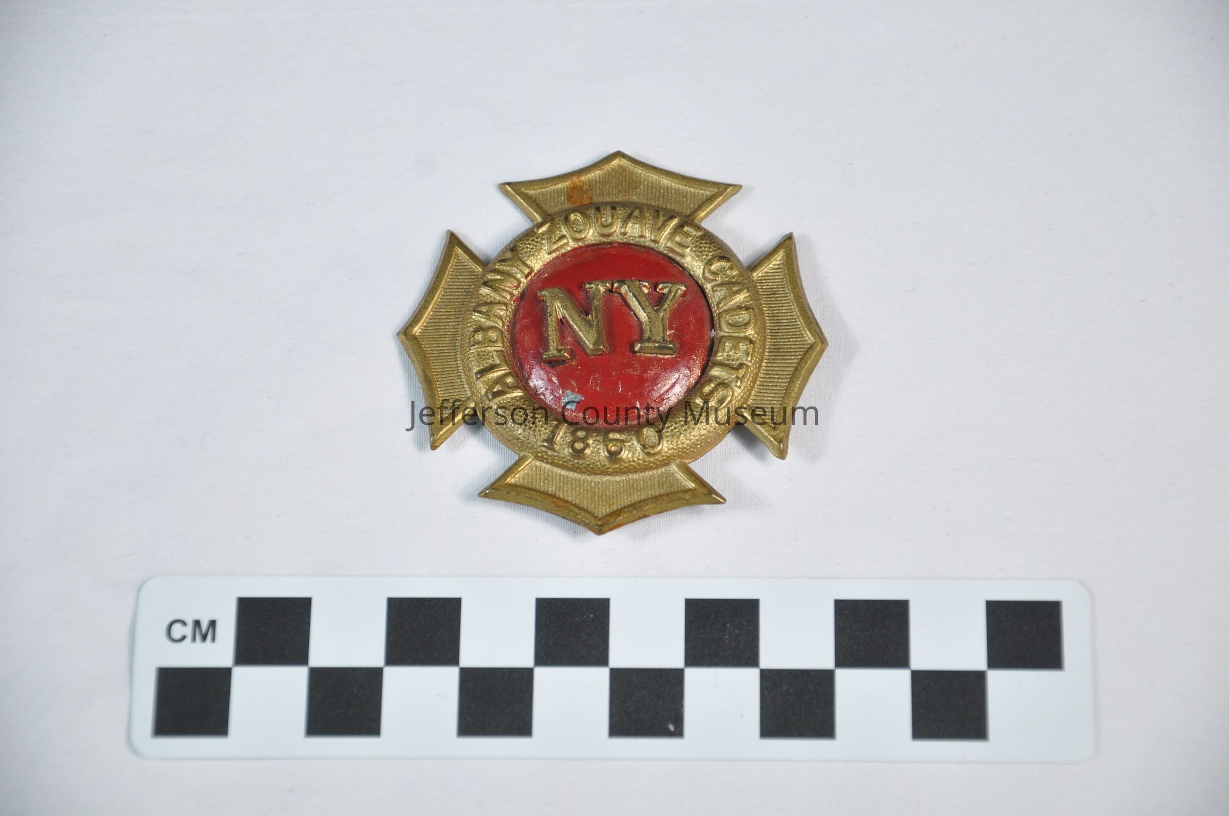 Hat badge shaped like fireman's badge. Around circle "ALBANY ZOUAVE CADETS 1860". In center "NY". Painted gold, red in center behind the NY. This is a post Civil War reunion badge.Acquisition
