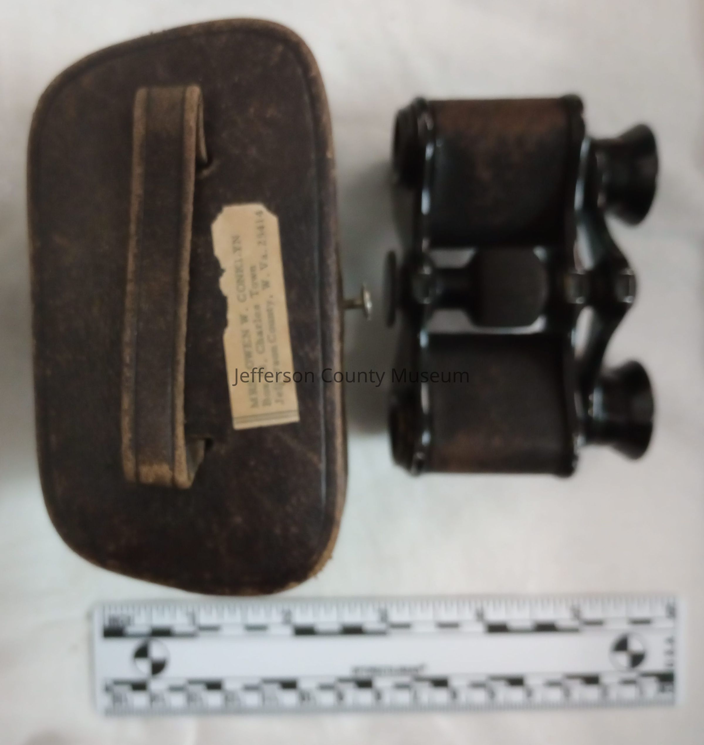2024.018.001b--Leather case for opera glasses lined with red silk. Owner's name and address are printed on a sticker on the hinged lidAcquisition