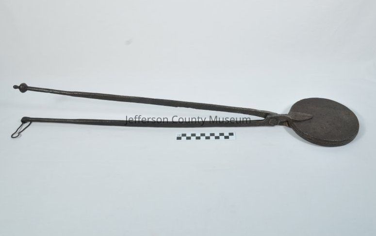 Cast and wrought iron wafer iron with rare eagle design. Made in New England in 18th century. Hinged with long handle and fitted with a loop-form locking device. Inside the iron is U.S. eagle and shield. Eagle is clutching arrows in one claw and olive branches in other with beaded border. 16 stars are above eagle.Acquisition