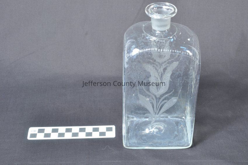 Glass decanter. Hand-blown and etched on all four sides with tulip design. Dimple on bottom where glass was held on blowpipe. Stopper missing.