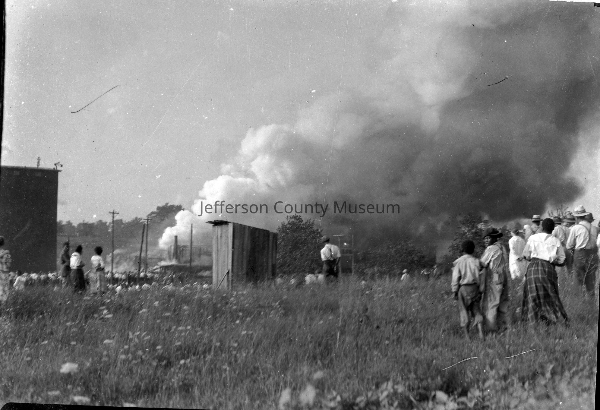 Group of African American and white people watching a large plume of smoke from a fire at St. Hilda's Hall, 1937Acquisition