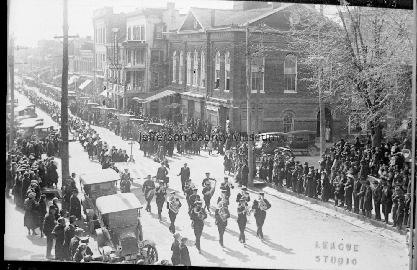 Washington Street looking west from Jefferson Hotel, possibly a suffrage parade with Harpers Ferry Band. Jefferson Bank and Trust Company in background.
