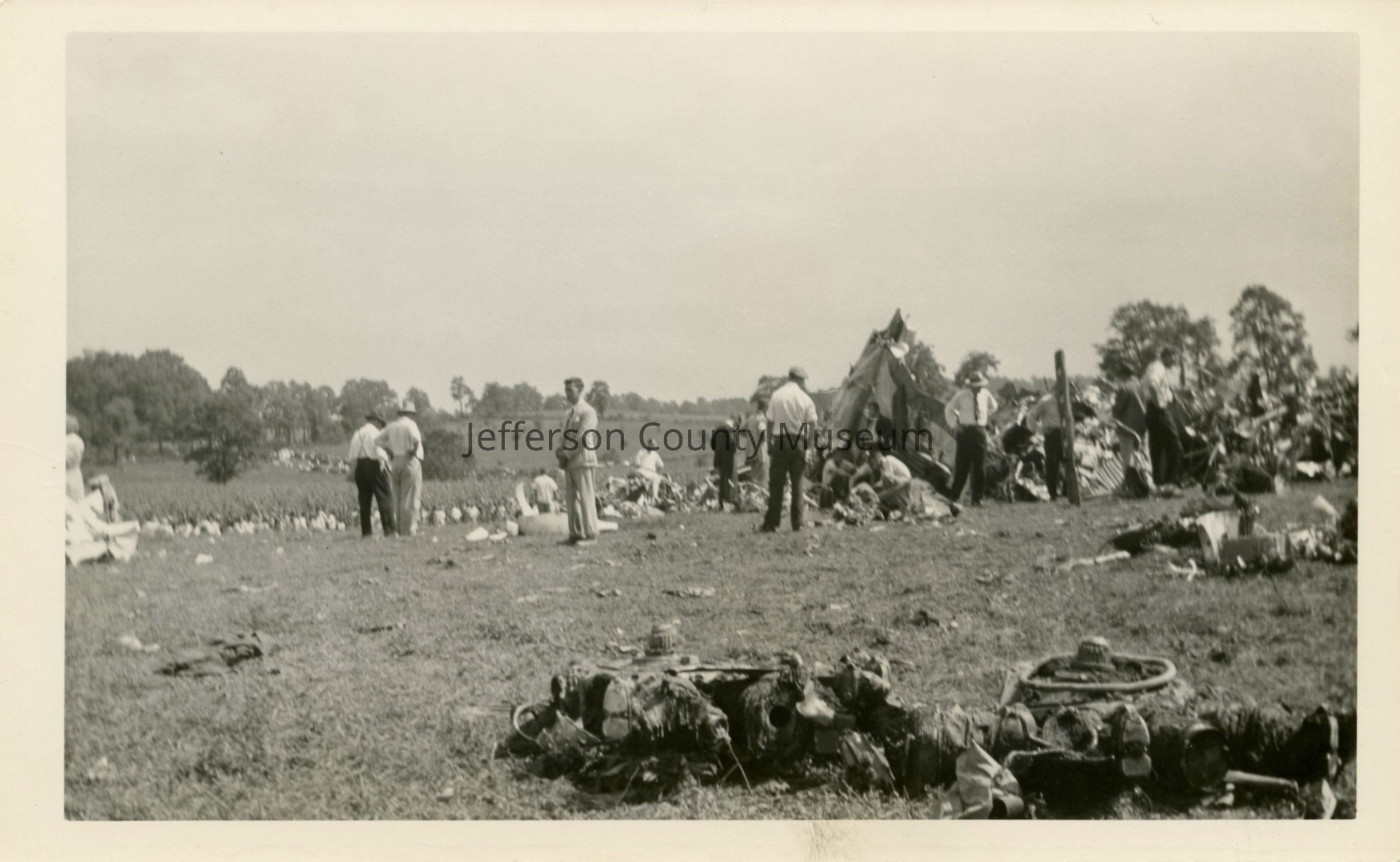 Black and white photo of exterior landscape. In background, a line of people facing away from the camera combs through what appears to be a cornfield, possibly a search party. In foreground, a group of men stand and sit near a pile of debris, with more debris strewn on the ground in front of them. This image possibly depicts the wreckage of the Flight 410 crash of Friday, June 13, 1947.Acquisition