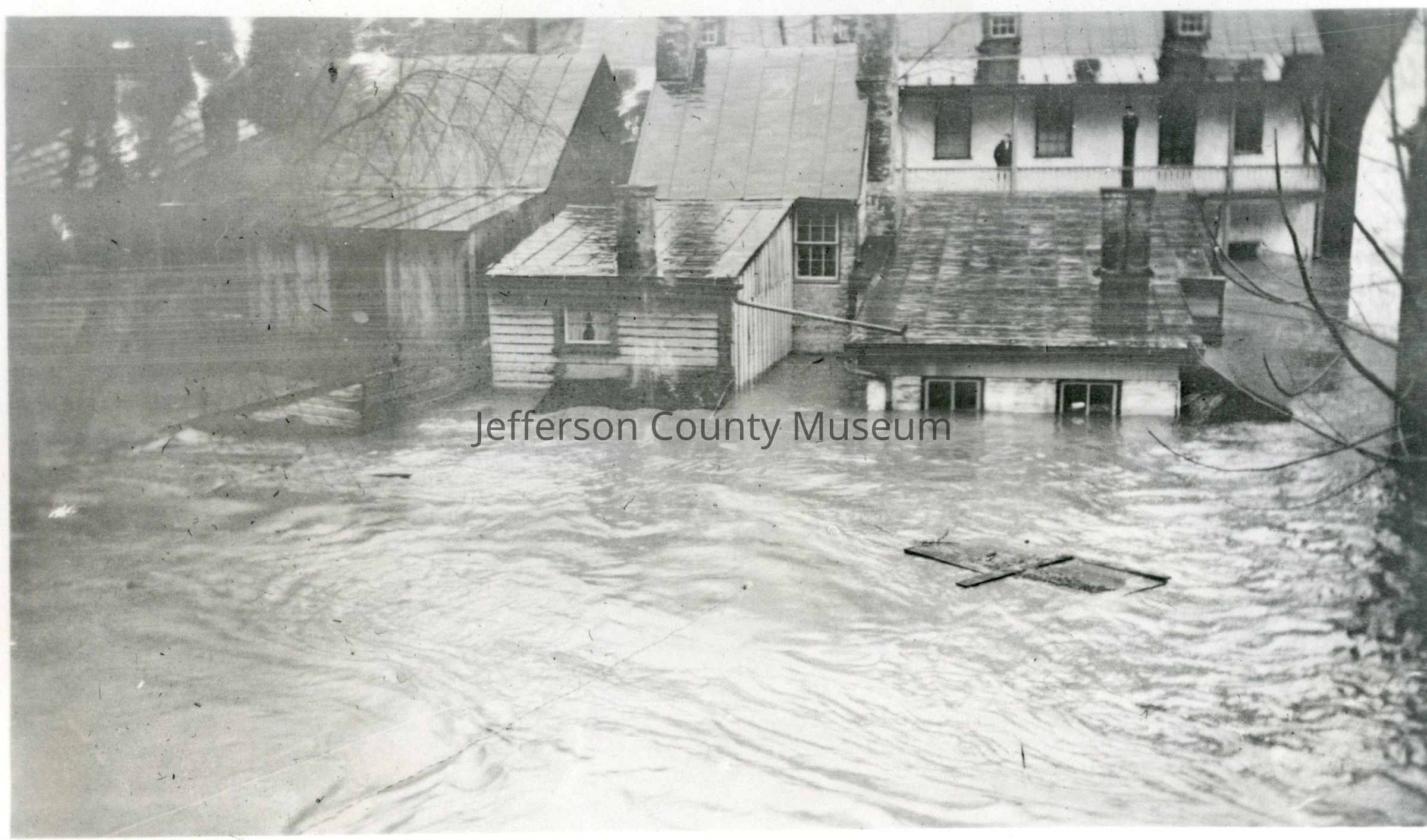 Flood of March 18, 1936 at Harpers Ferry. View is from the Winchester and Potomac Railroad tracks. Backyards of houses. John G. Wilson building at top of photograph with unidentified person standing in second story porch.