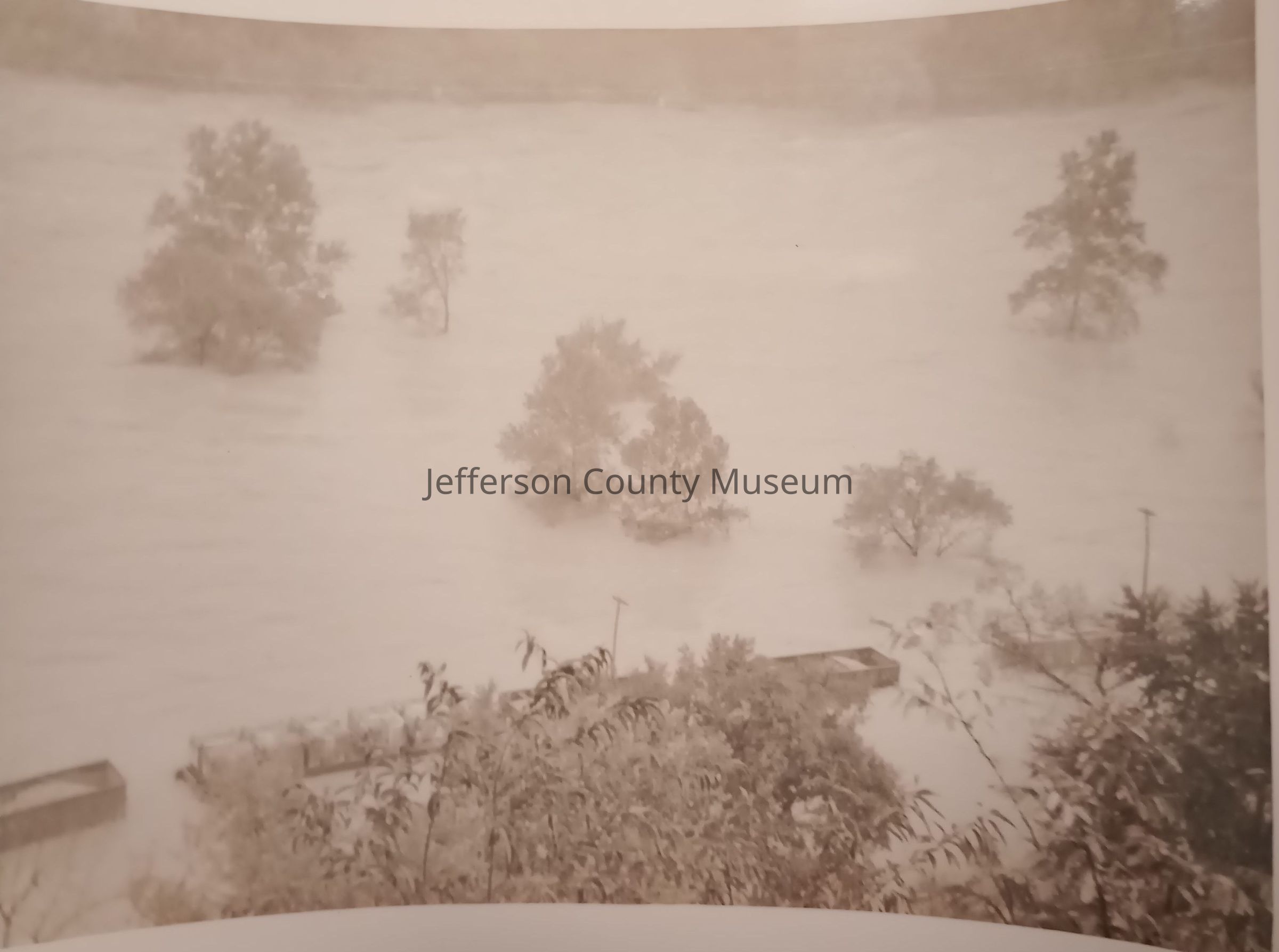 Black and white photo taken from above of flooded train tracks, surrounded by flooded trees and power lines.Photograph Details
