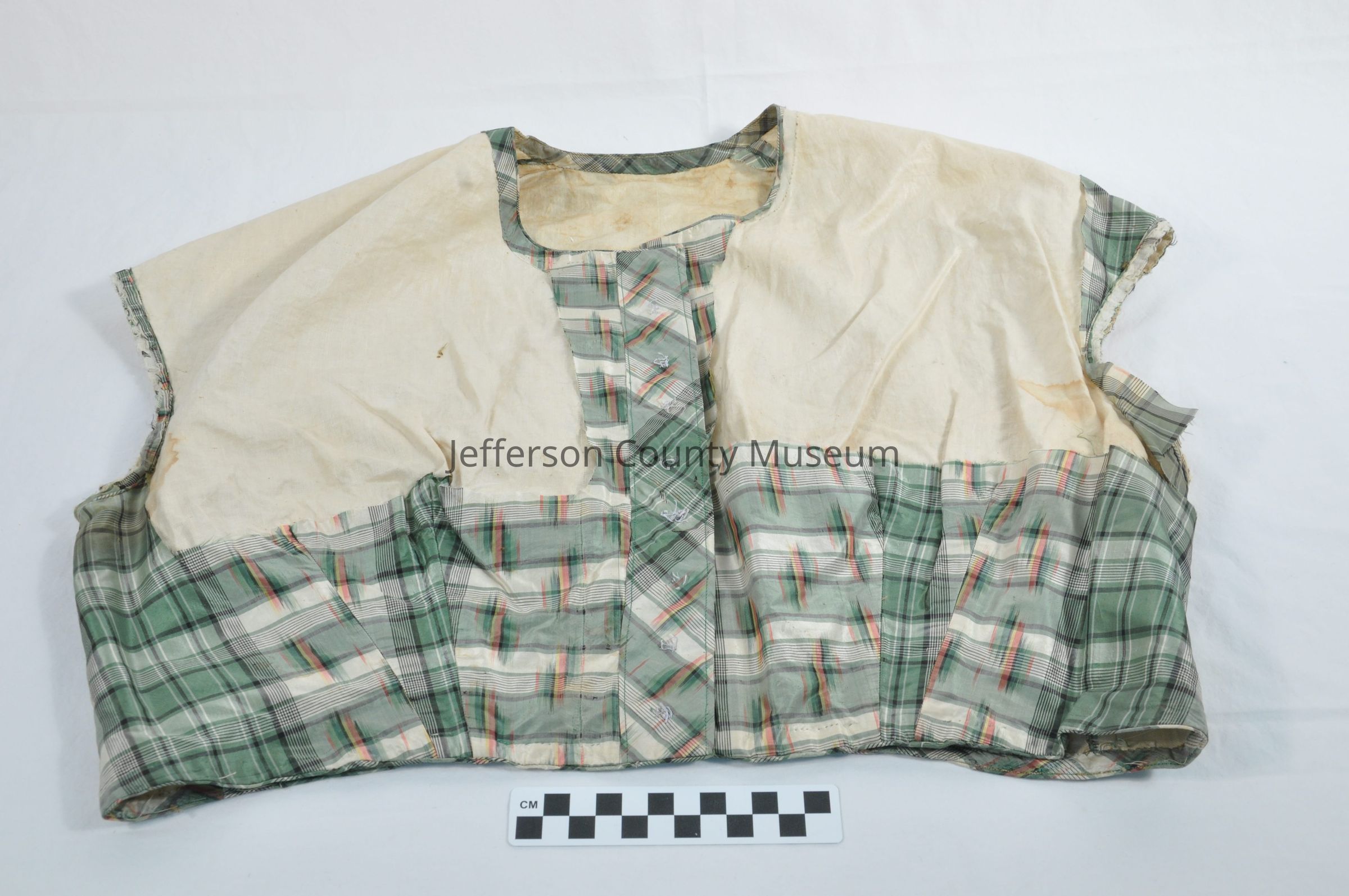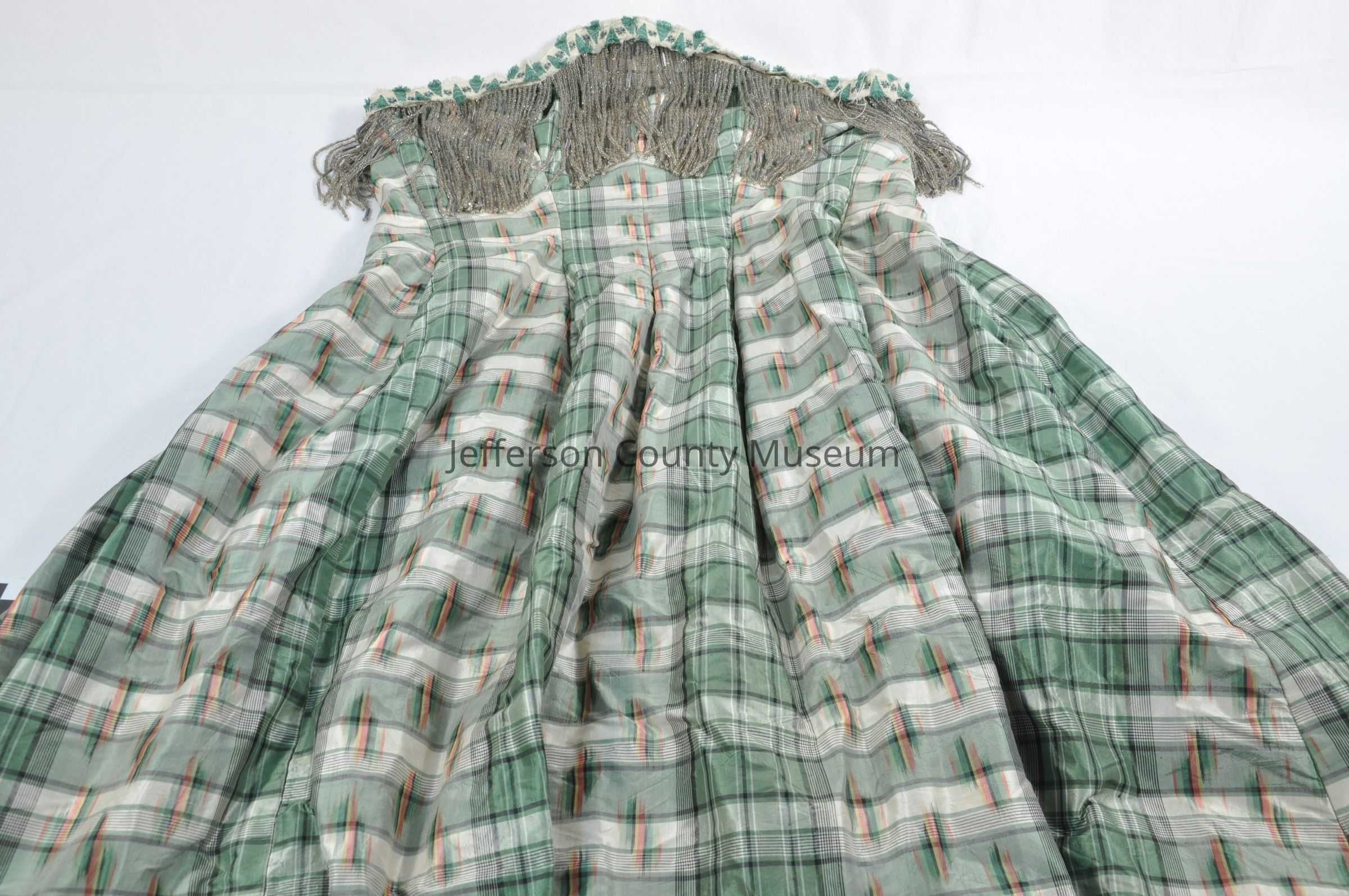 Green, white and pink taffeta blouse (a) and high bodice long skirt (b). The taffeta has been cut off of the blouse on the front and one panel on the back. Hook and eye closures. The top of the dress is fringed with heavy beads, has stays in the bodice, round metal buttons on back. The back of the dress is longer than the front.Acquisition