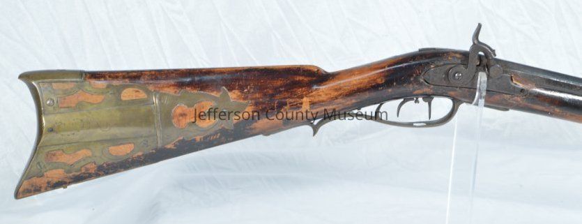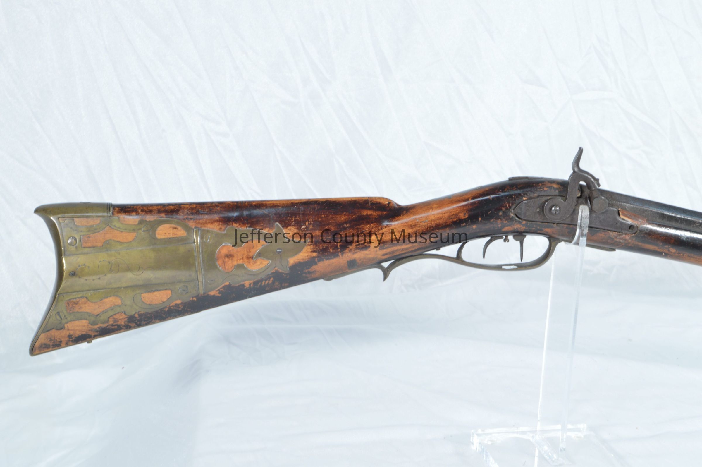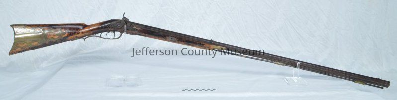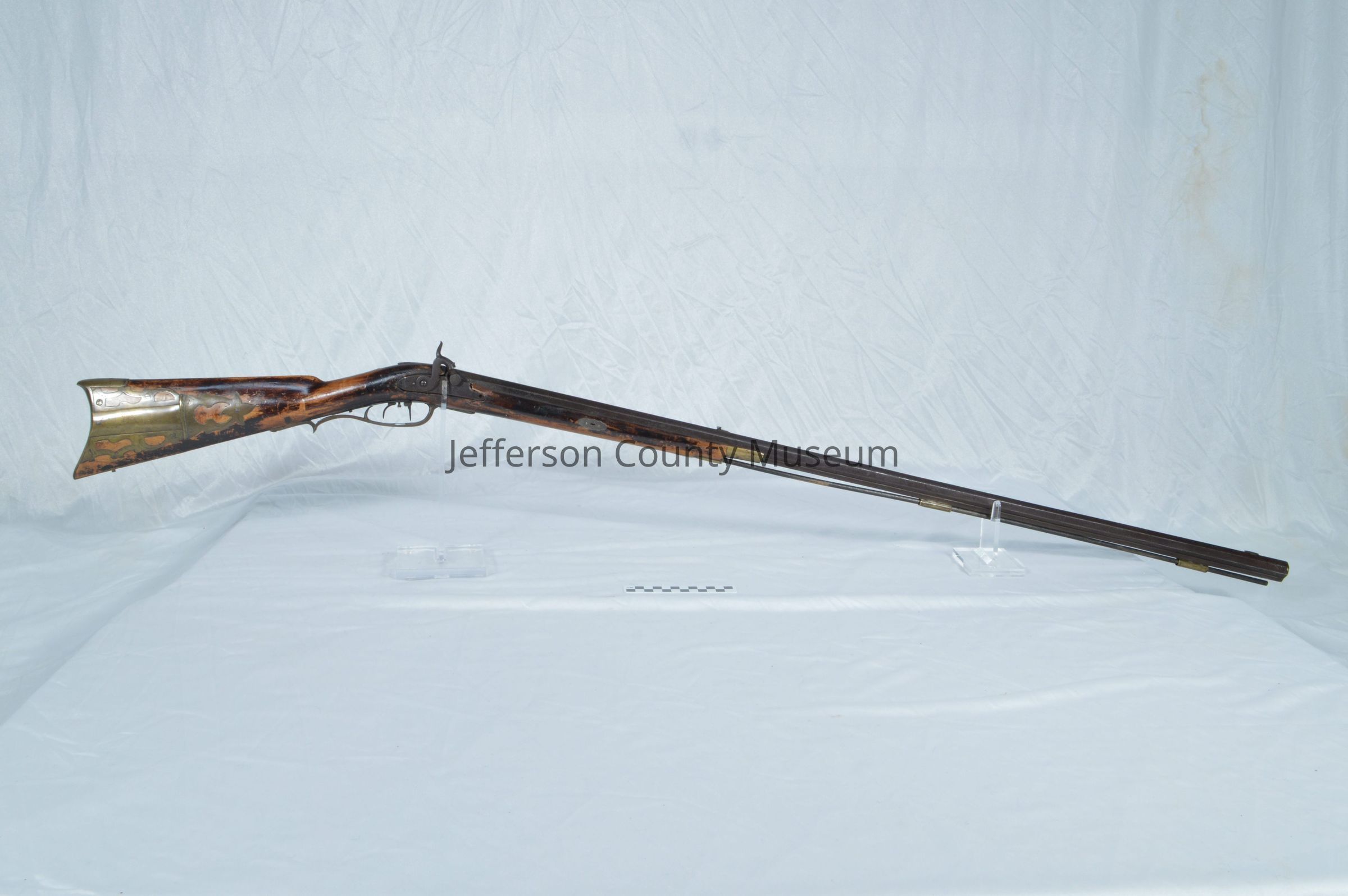 Half-stock Sheetz hunting rifle made, likely in Staunton in 1840s. Has silver plate around pin for holding barrel on stock. Pin is missing. Brass butt-plate, decoration and patch box on stock. Possibly .50 or .54 caliber. On lockplate "D KETLAND & Co." On top of barrel "H.SHEETS" for Henry Sheets.Acquisition