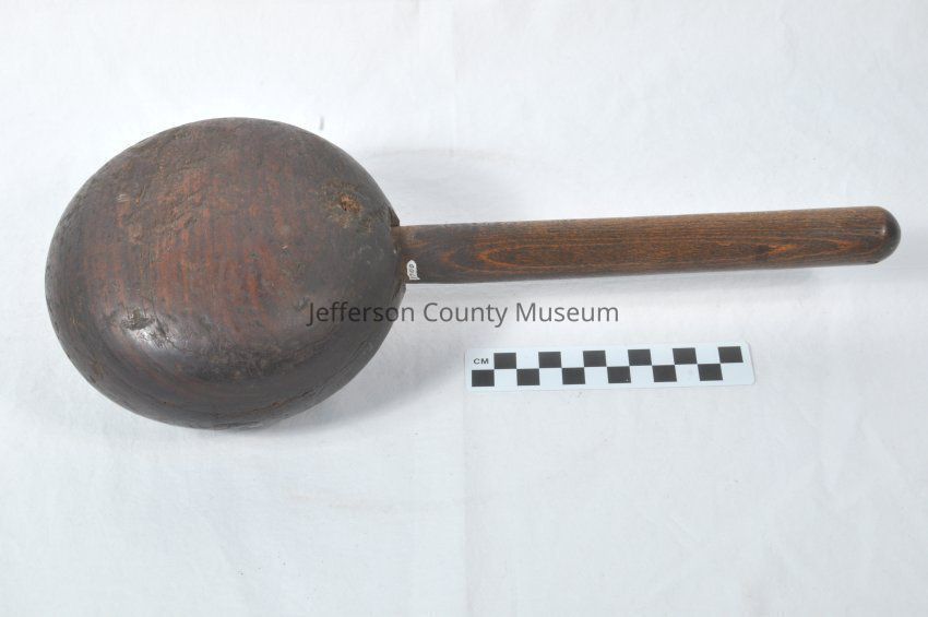 Heavy disk shaped wooden mallet possibly used in carpentry. Large screw attaches handle to head.Acquisition