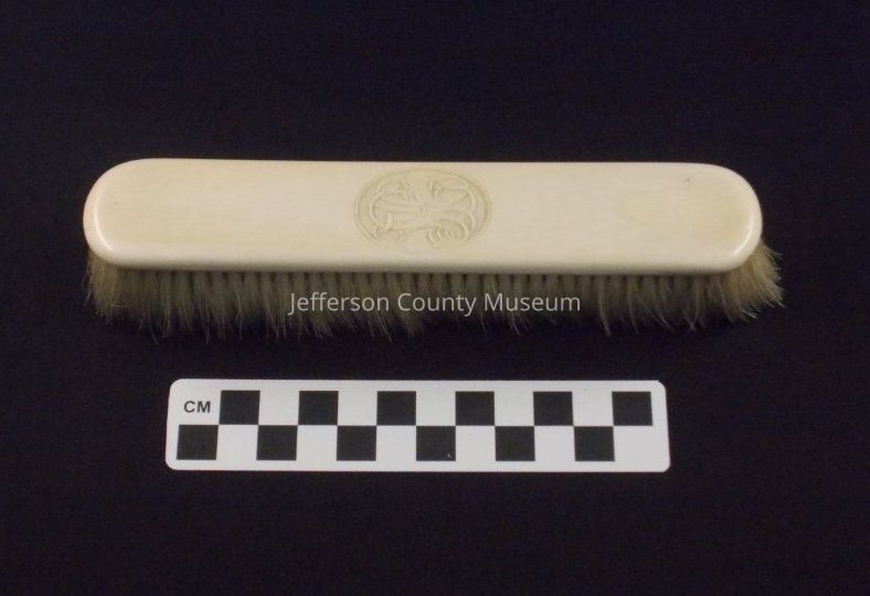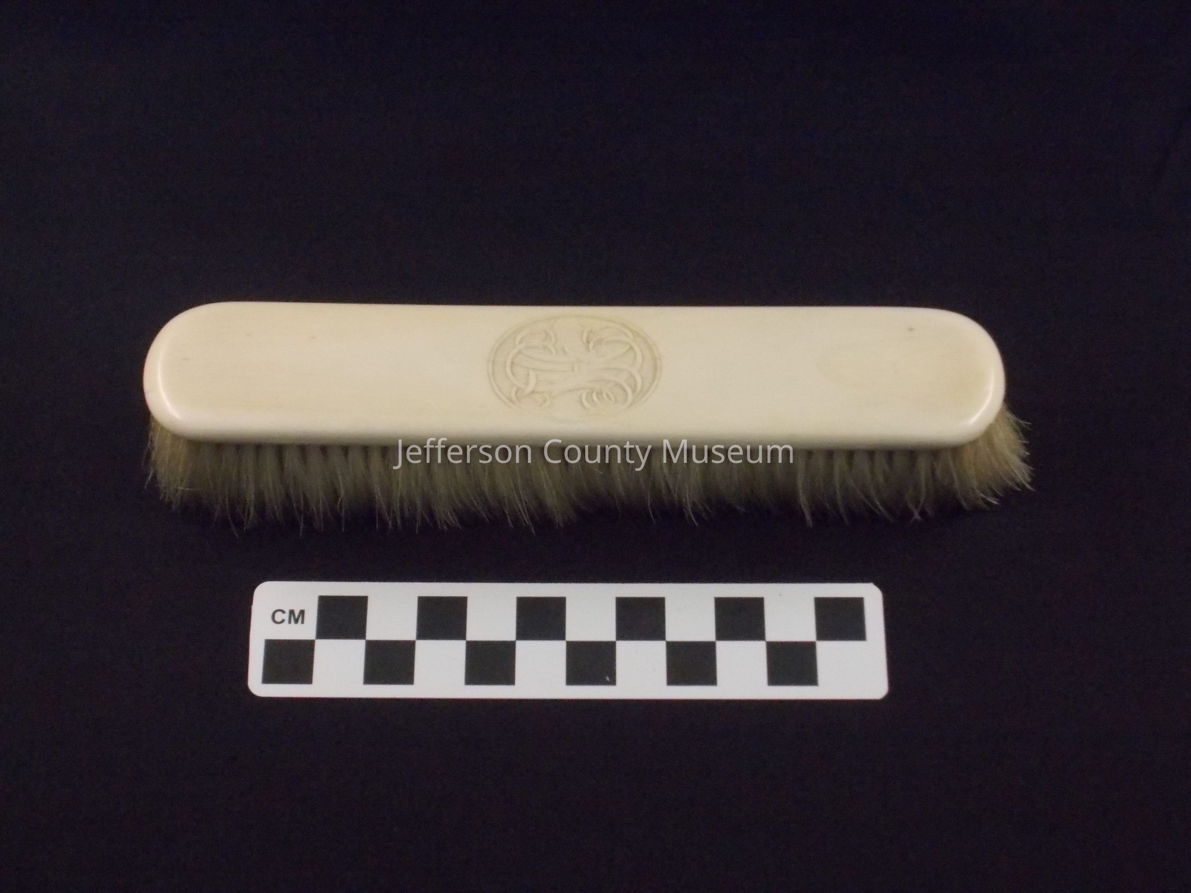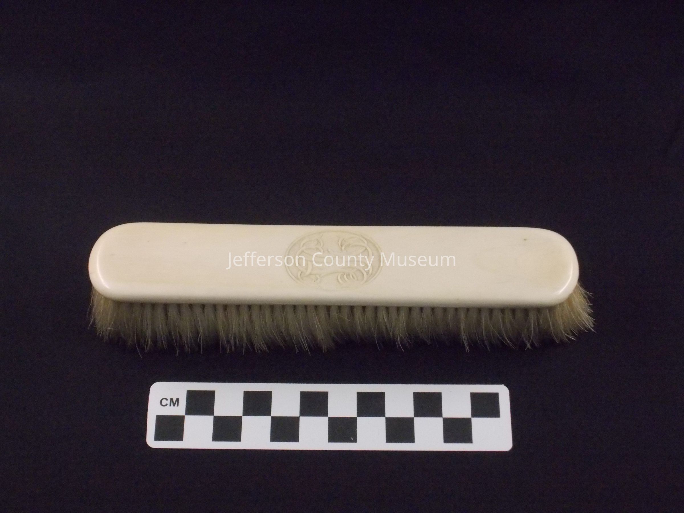 Ivory-backed clothes brush monogrammed in fancy script inside an oval "H.L.J". Off white bristles. "H.L.J." refers to Harriet Lane Johnston.Acquisition